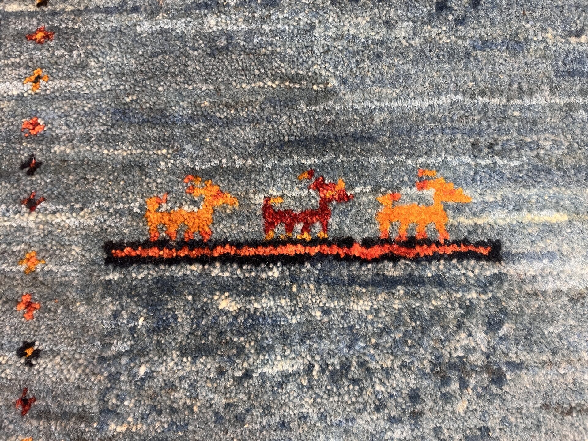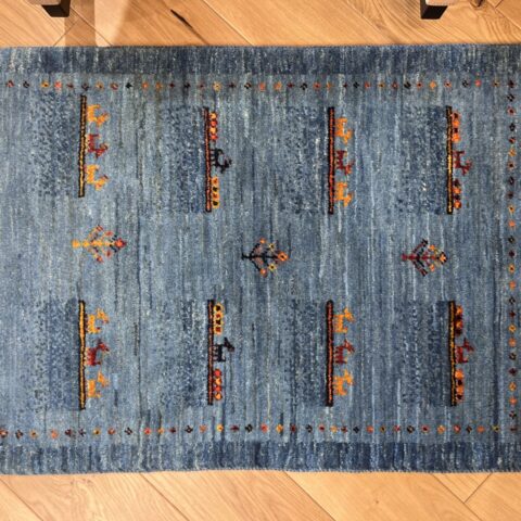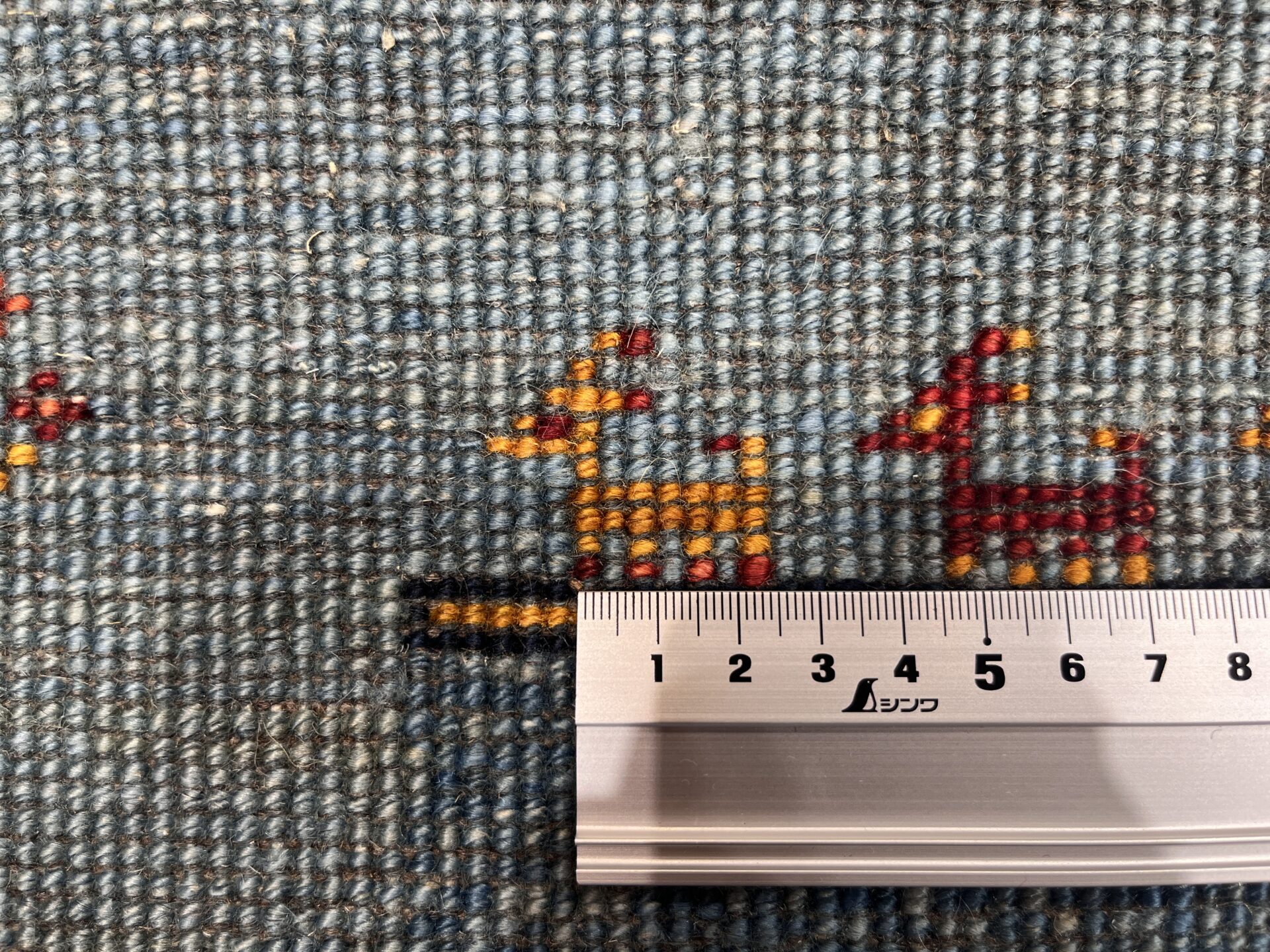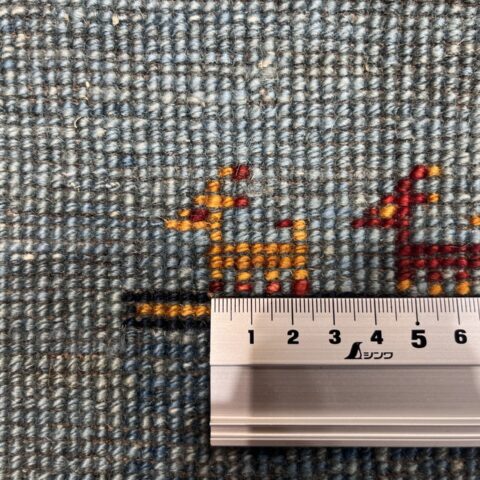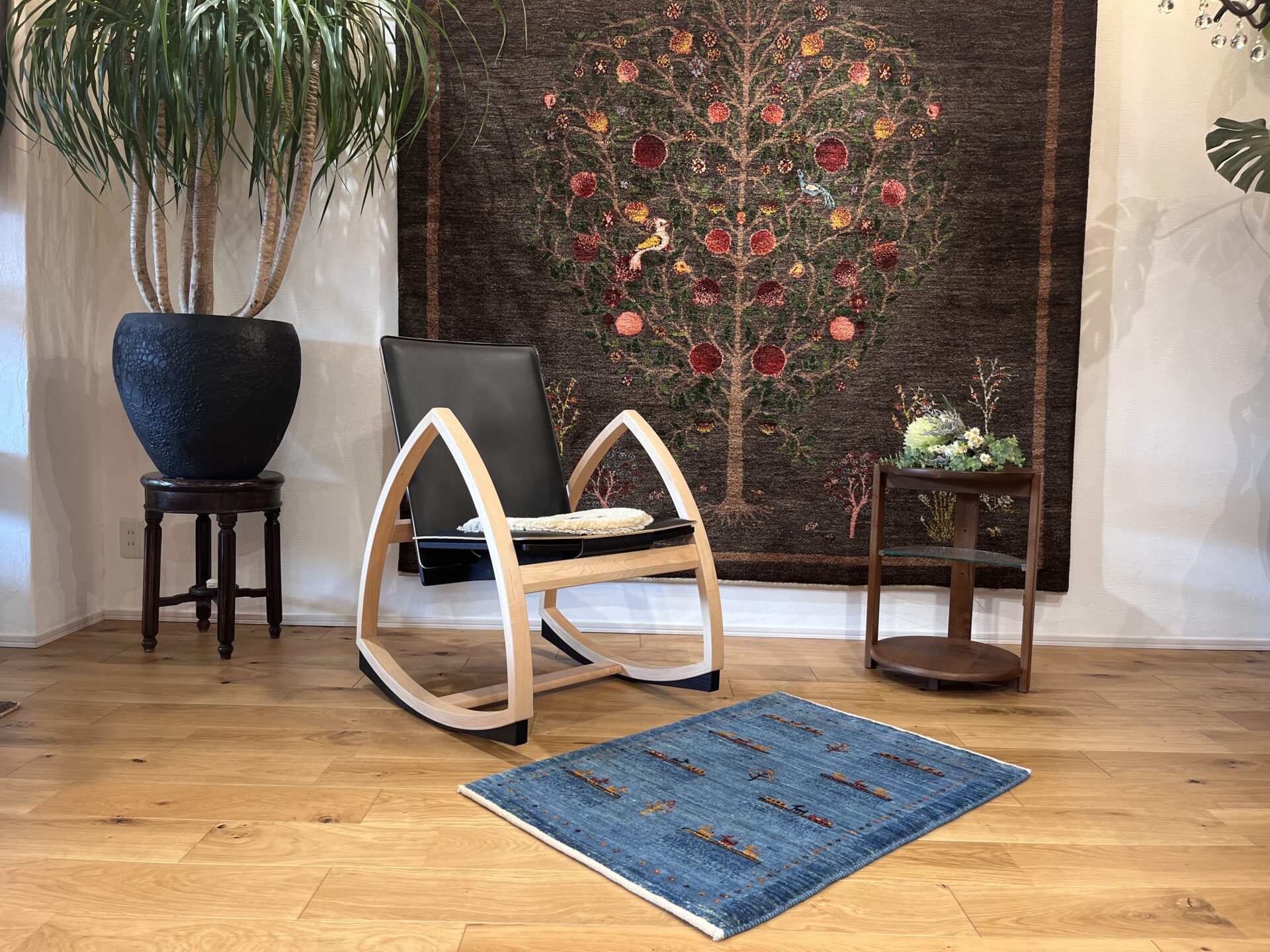 澄んだブルーフィールドには可愛らしい羊のモチーフが規則的に織り込まれています。「羊」は遊牧民にとって生活を支える豊かさの象徴であり、同時に家族の安らぎ・守り・繁栄を願う縁起の良い図案。加えて、中央に織られた「生命の樹」長寿・成長・家族の絆が、このギャッベの優しい世界観をより一層引き立てています。