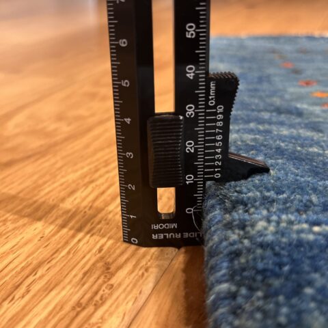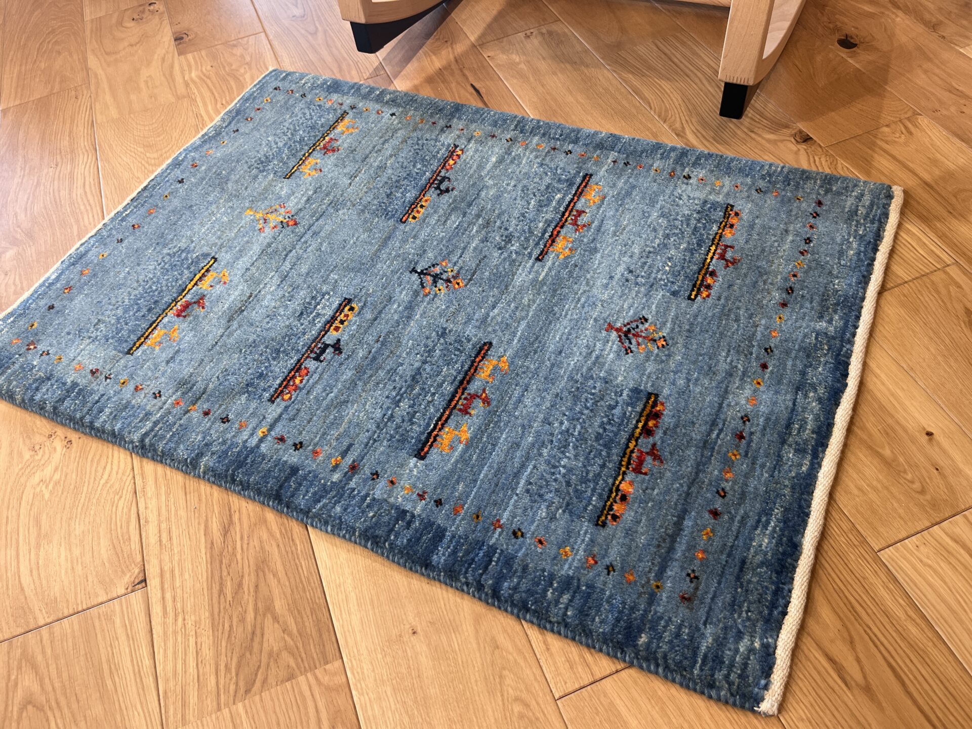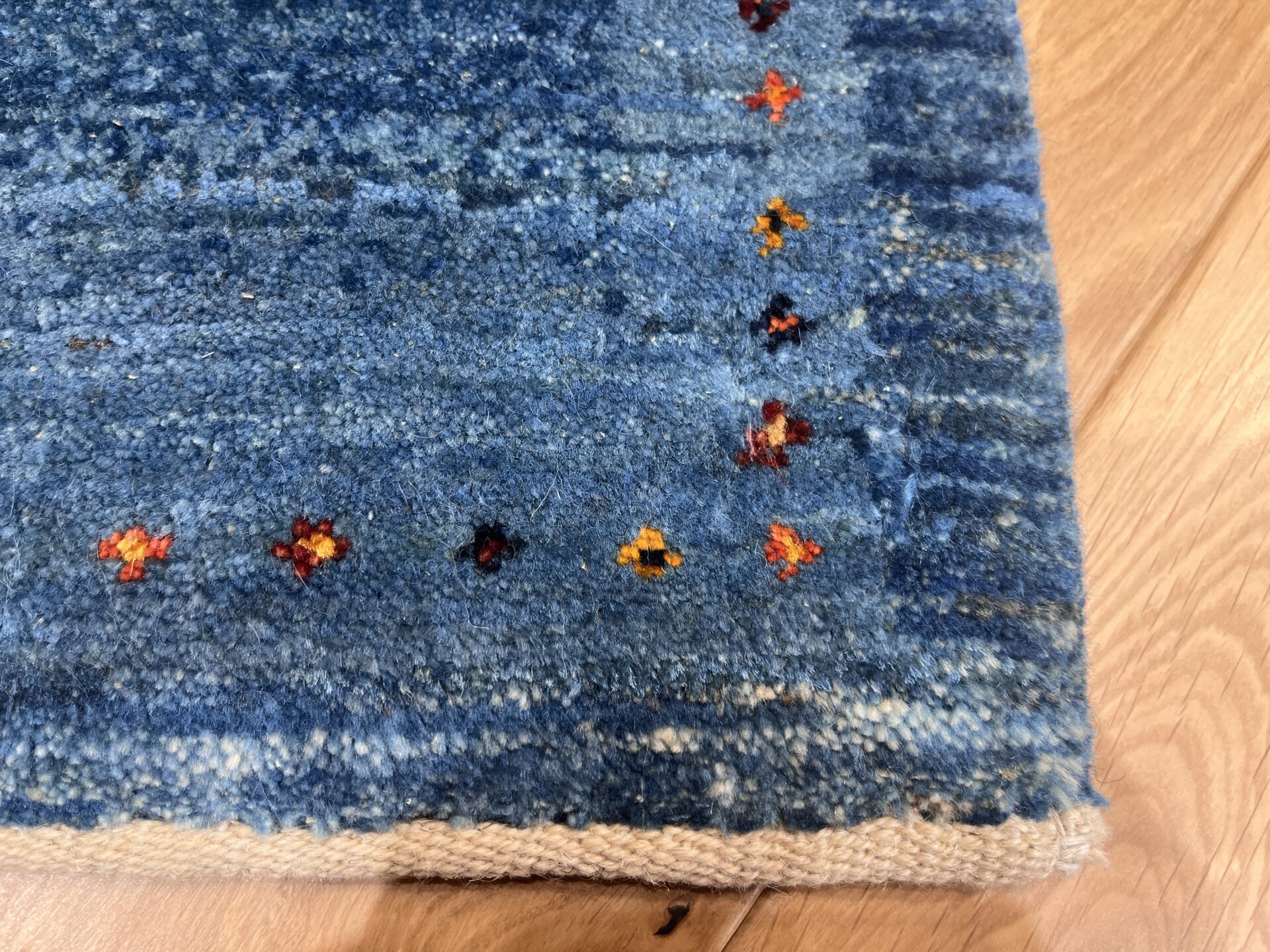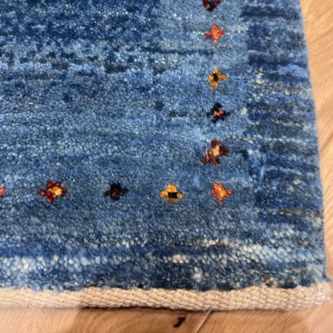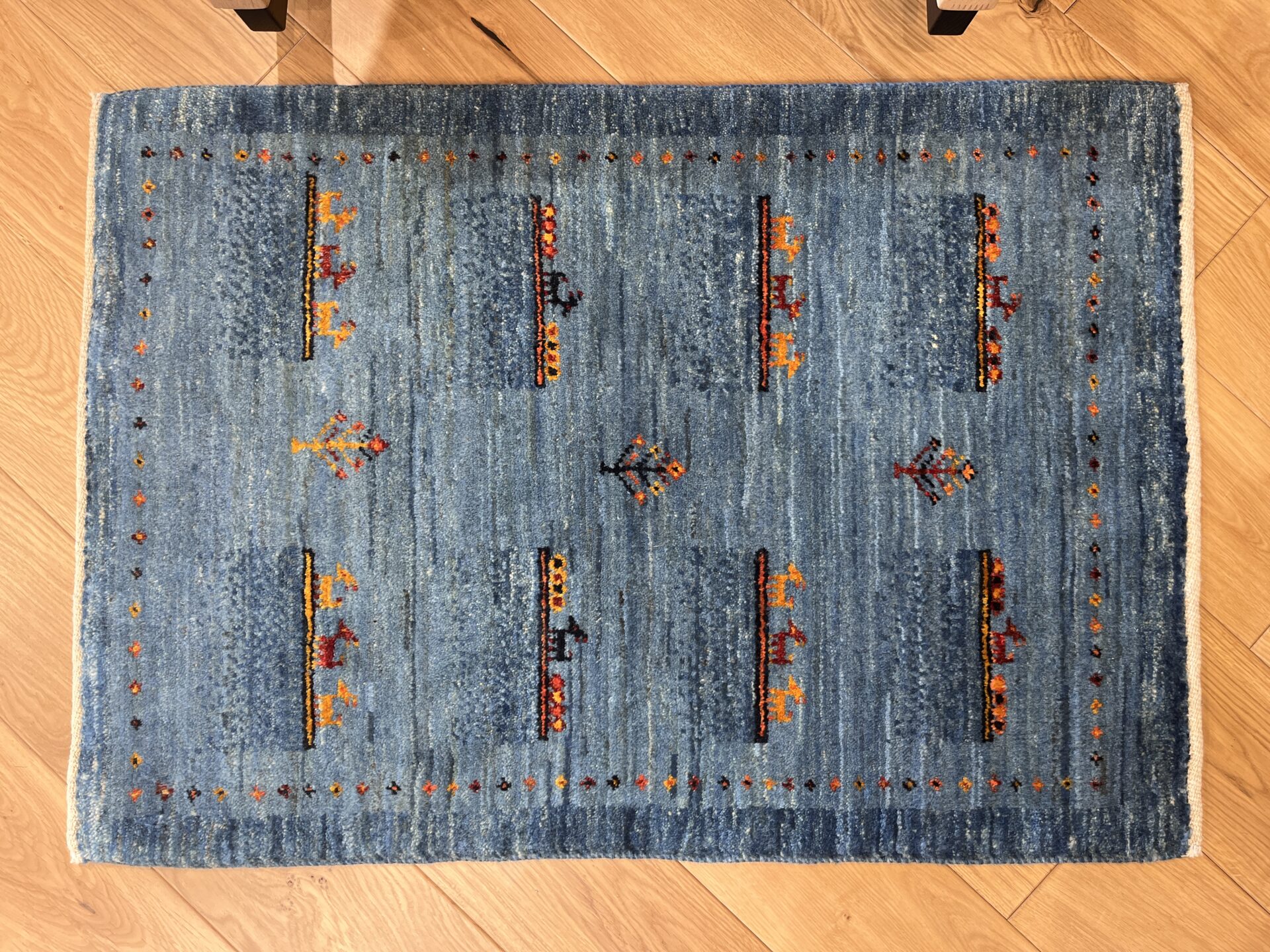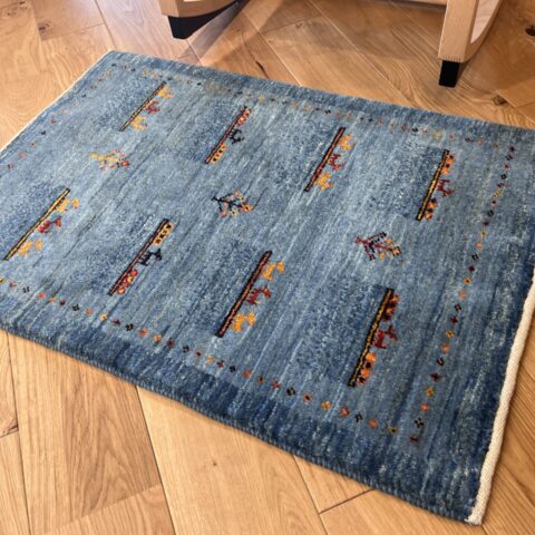 澄んだブルーフィールドには可愛らしい羊のモチーフが規則的に織り込まれています。「羊」は遊牧民にとって生活を支える豊かさの象徴であり、同時に家族の安らぎ・守り・繁栄を願う縁起の良い図案。加えて、中央に織られた「生命の樹」長寿・成長・家族の絆が、このギャッベの優しい世界観をより一層引き立てています。