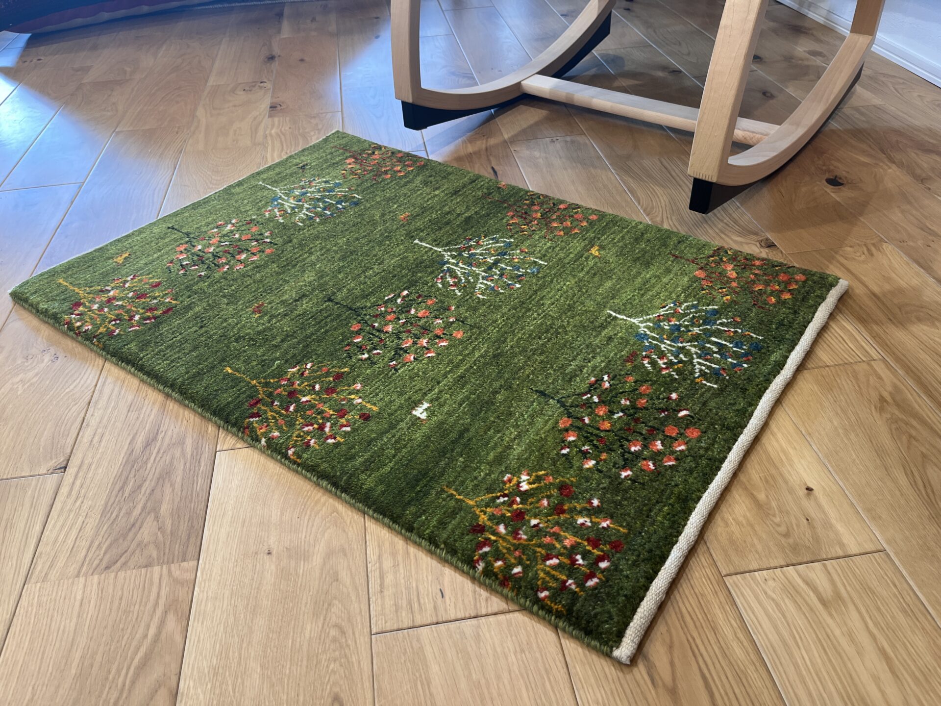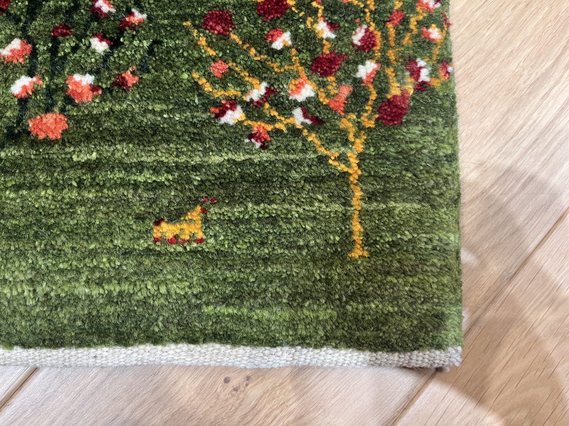 フィールド全体には、ギャッベの代表的な縁起モチーフである生命の樹が左右に美しく並び、まるで楽園の森のような世界観が広がります。「生命の樹 」は家族の繁栄・健康・長寿を象徴し、遊牧民が古くから大切に織り込んできた幸福のシンボルです。さらに、小さく愛らしい「羊」が点在しており、豊かさ・安心・家族の守りを表すとても縁起の良い組み合わせ。生命の樹 × 羊 は、ギャッベの中でも特に人気の高い組み合わせで、空間に優しさと落ち着きを与えてくれます。