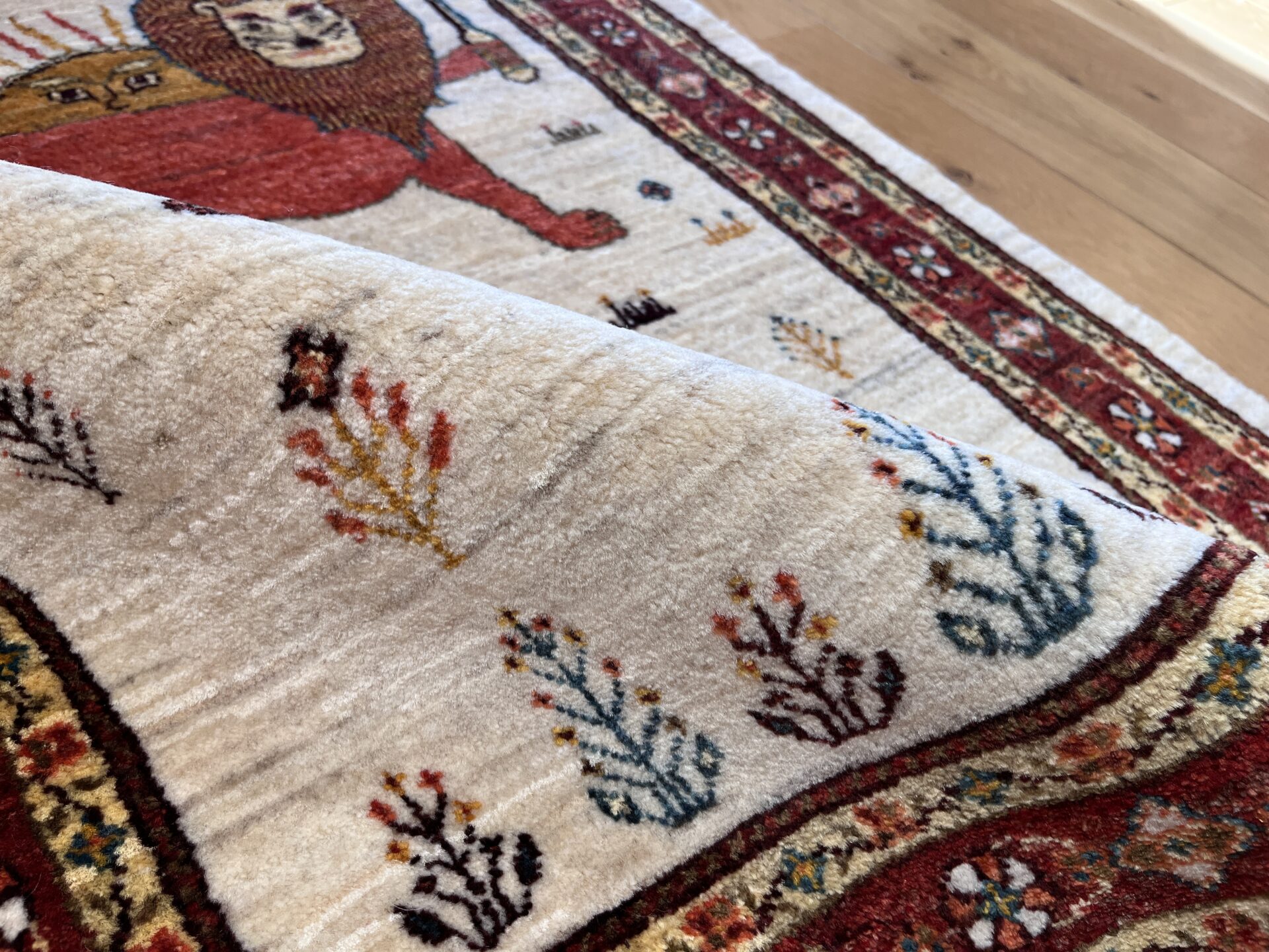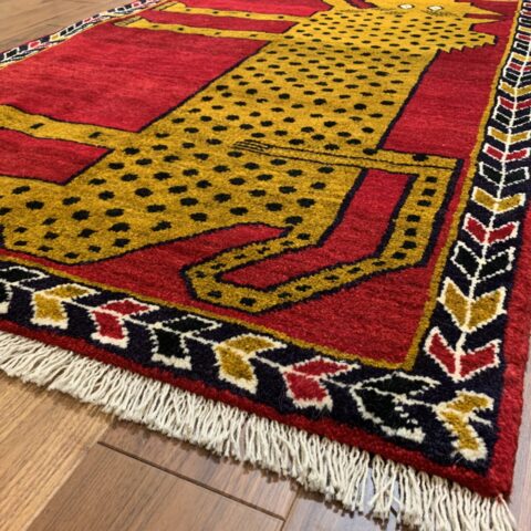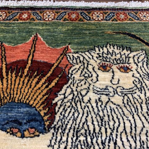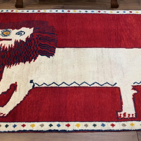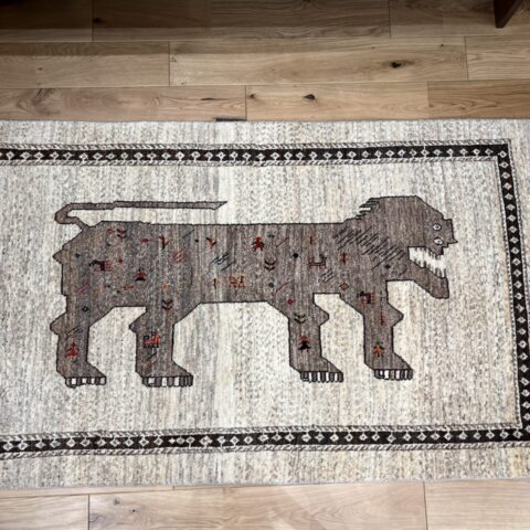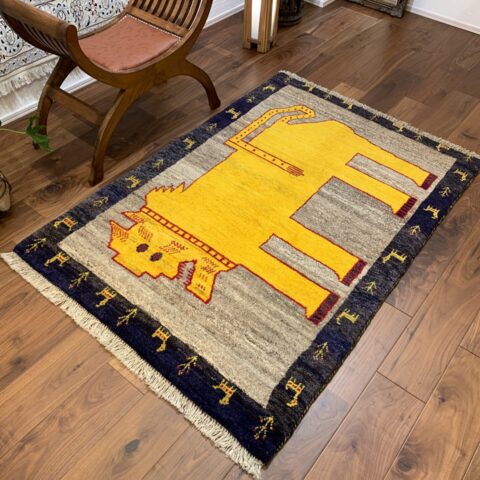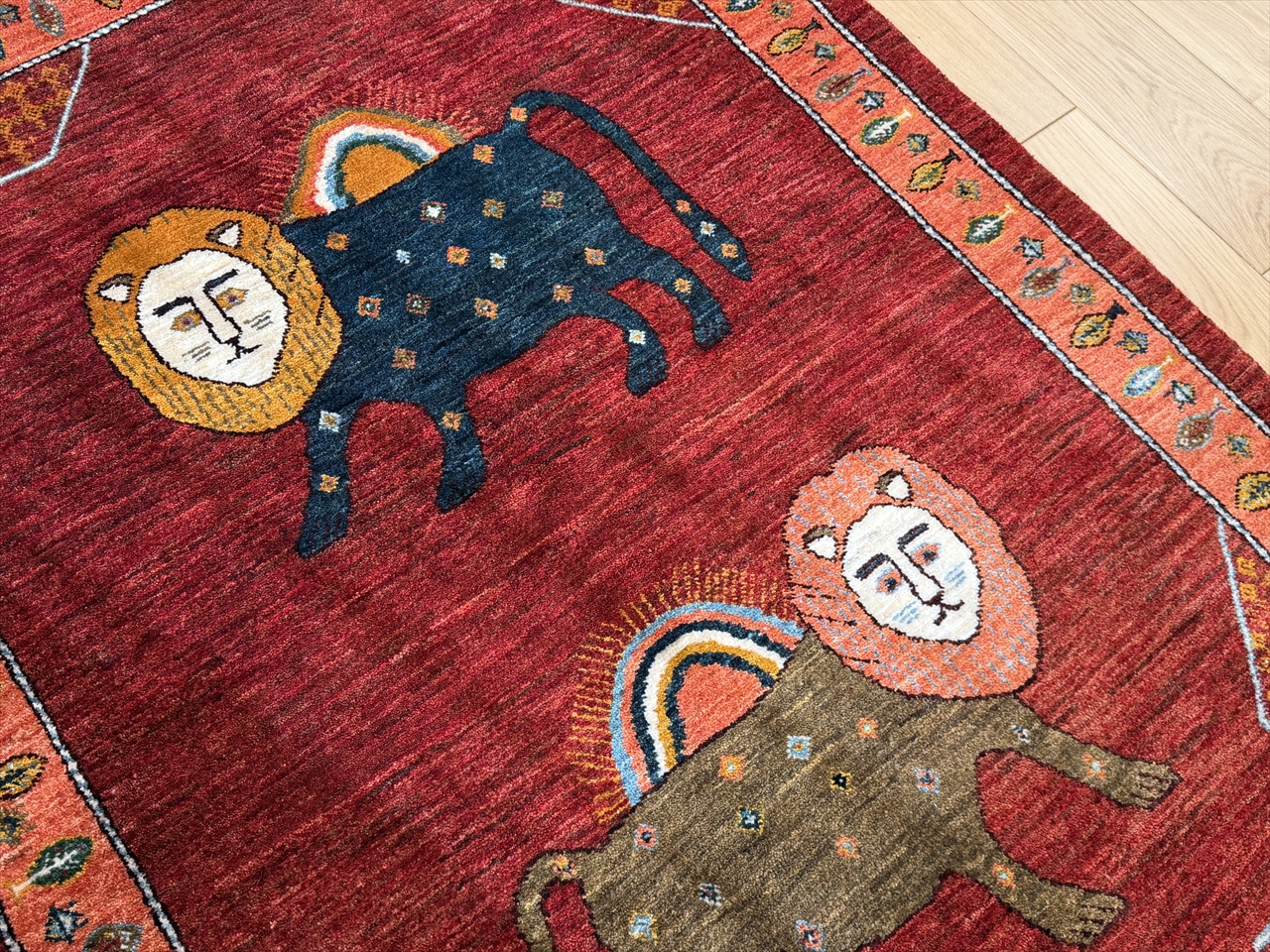 • 胴体に紋様(右): 胴体に様々な模様を持つライオン。比較的新しいギャッベに用いられたデザインです。