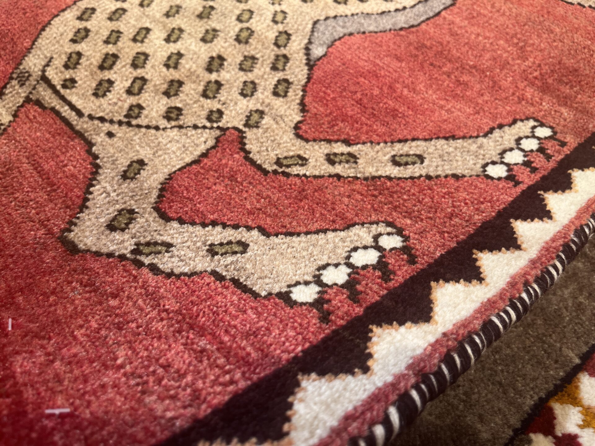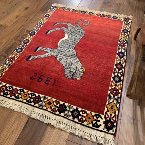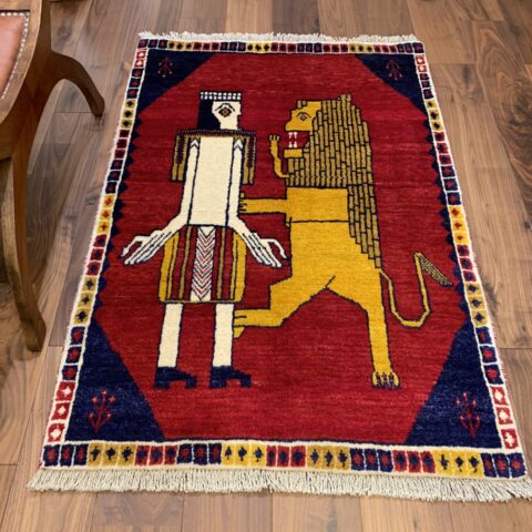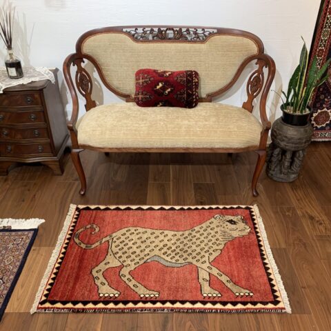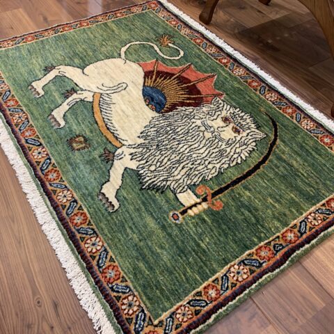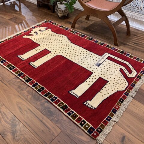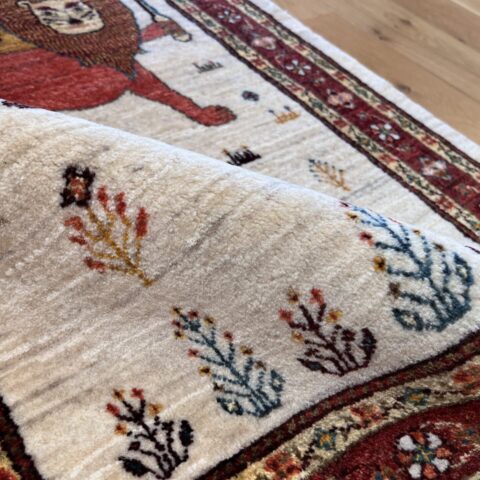 • 胴体に紋様(右): 胴体に様々な模様を持つライオン。比較的新しいギャッベに用いられたデザインです。
