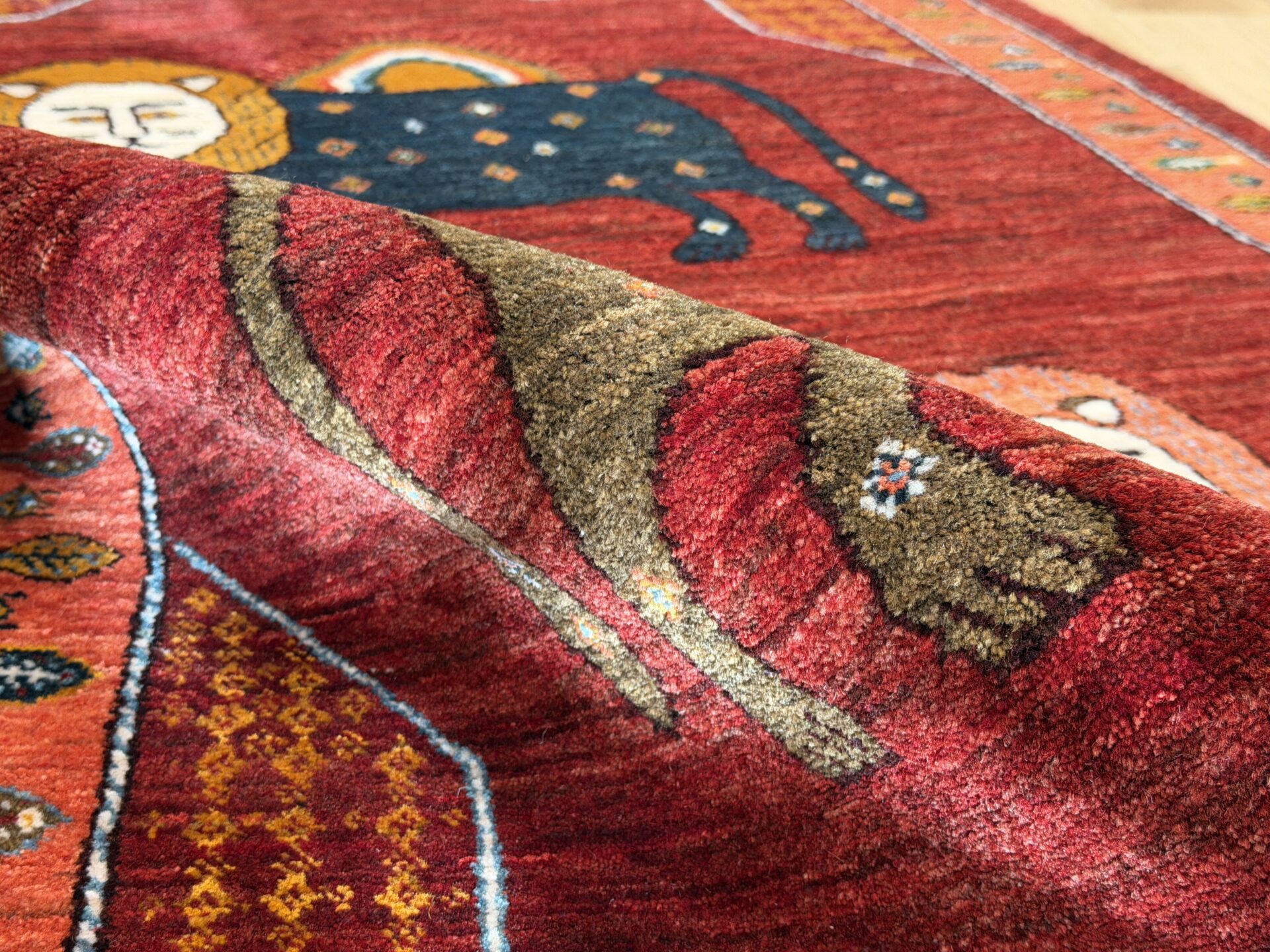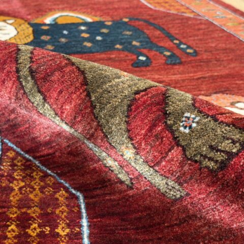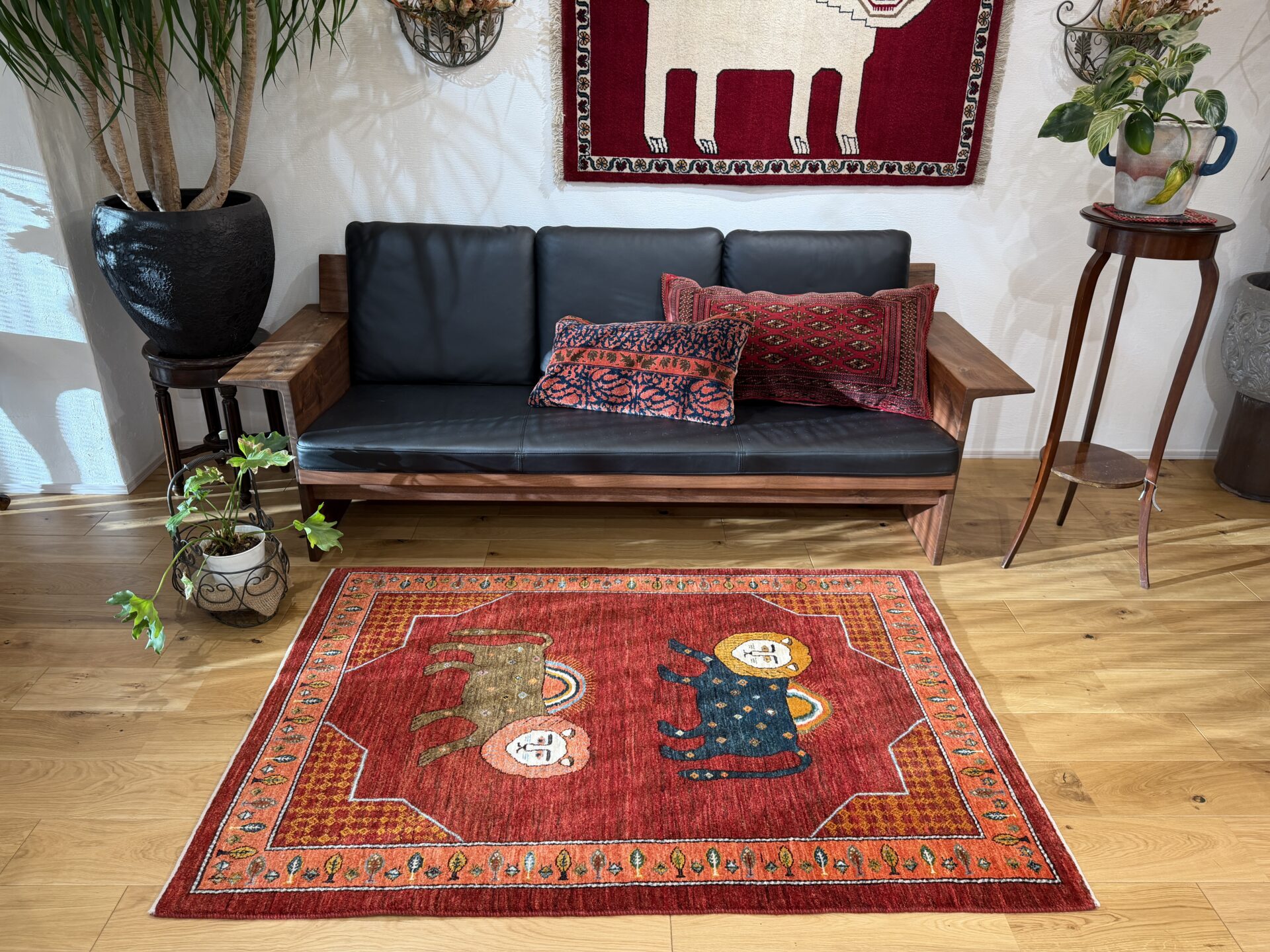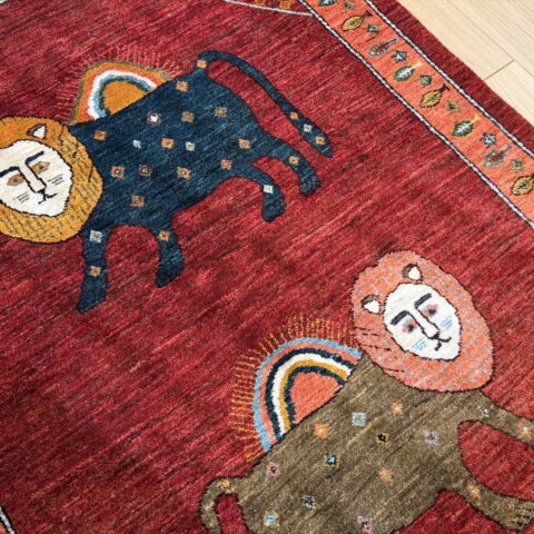 下記、燃えるようは茜色に二匹のライオンギャッベは、最高峰の緻密さを誇る「ルリバフ」。ペルシャ絨毯並みの織り密度を誇り、芸術性の高さで世界的に評価されています。細い糸で丁寧に織り上げられ、模様の表現はまさに絵画のよう。時間をかけて織られるため生産数が少なく、「ルリバフ ギャッベ」は希少価値の高いランクです。