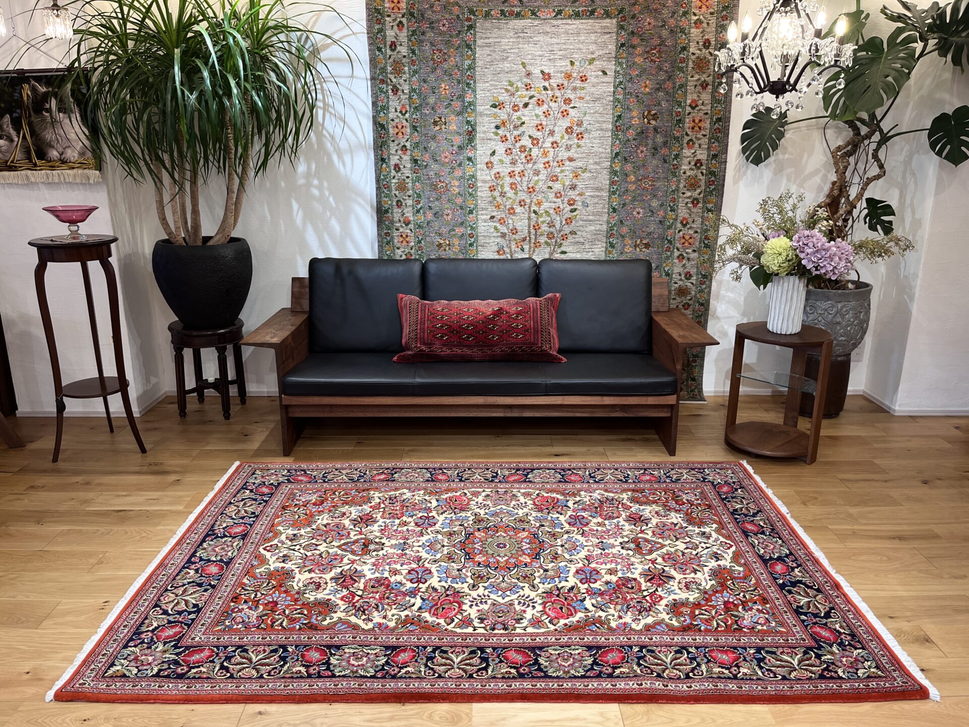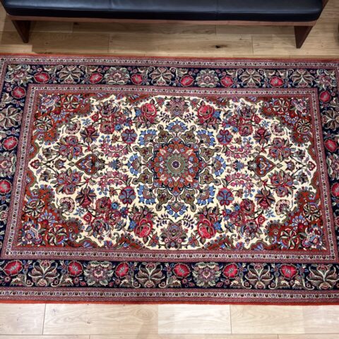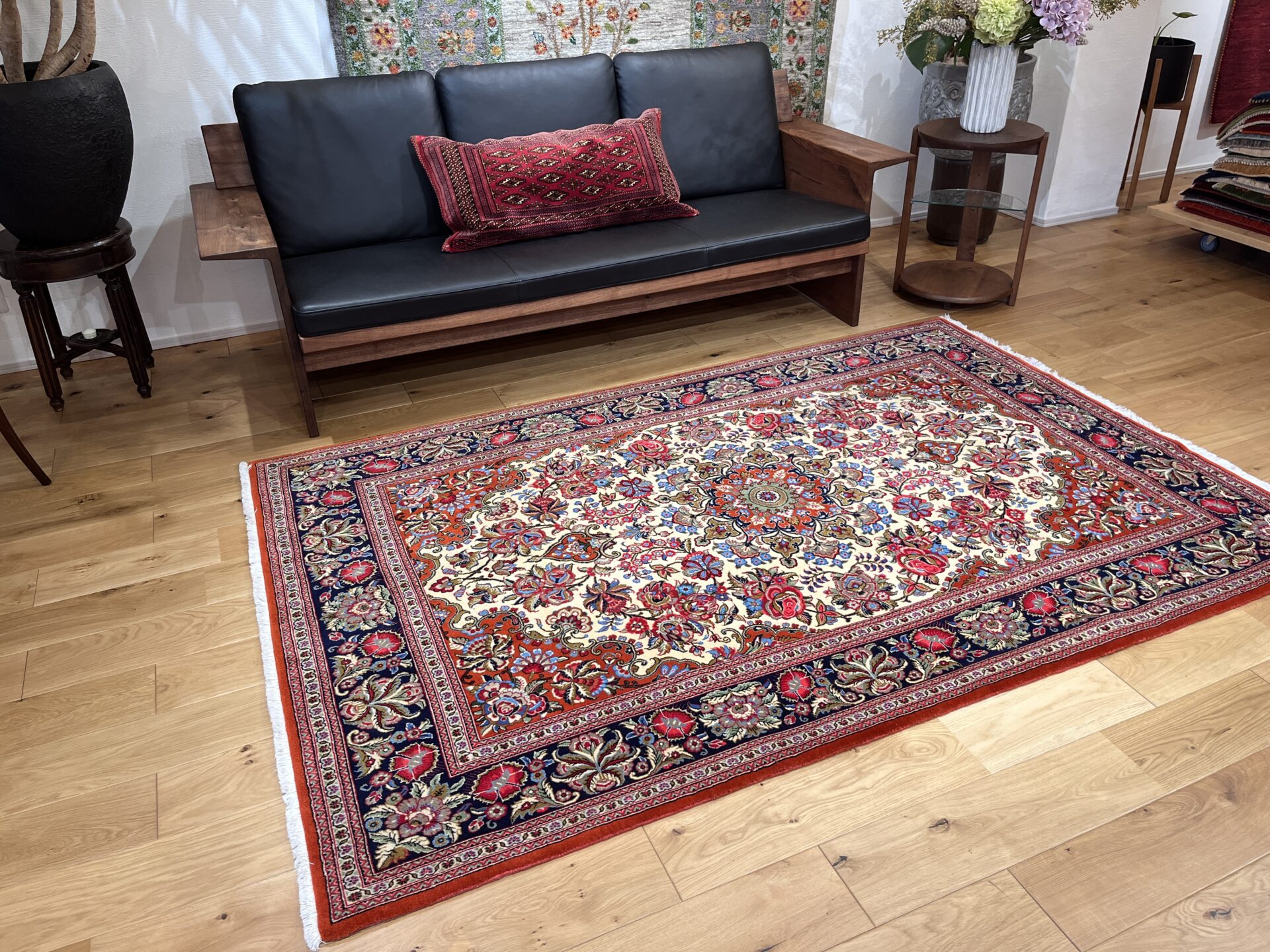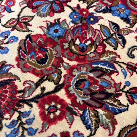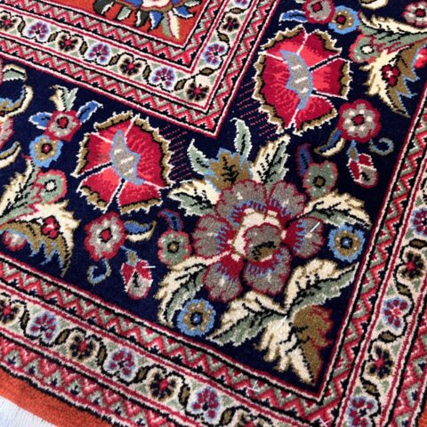 クム産ペルシャ絨毯の魅力が詰まった、大ぶりの花柄が印象的な一枚。