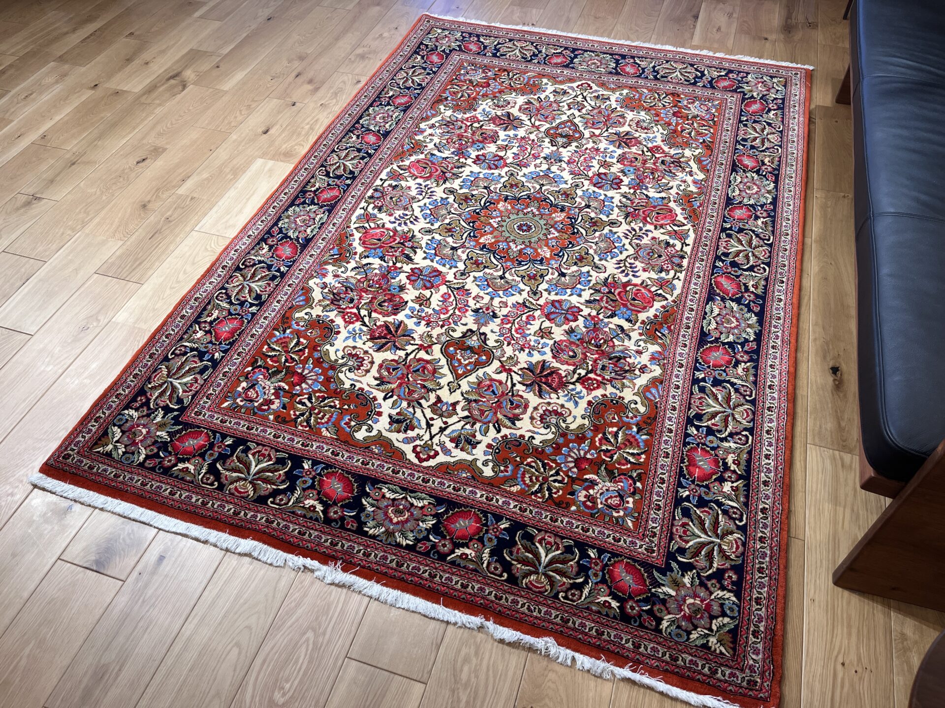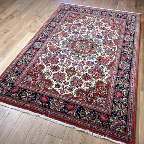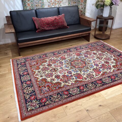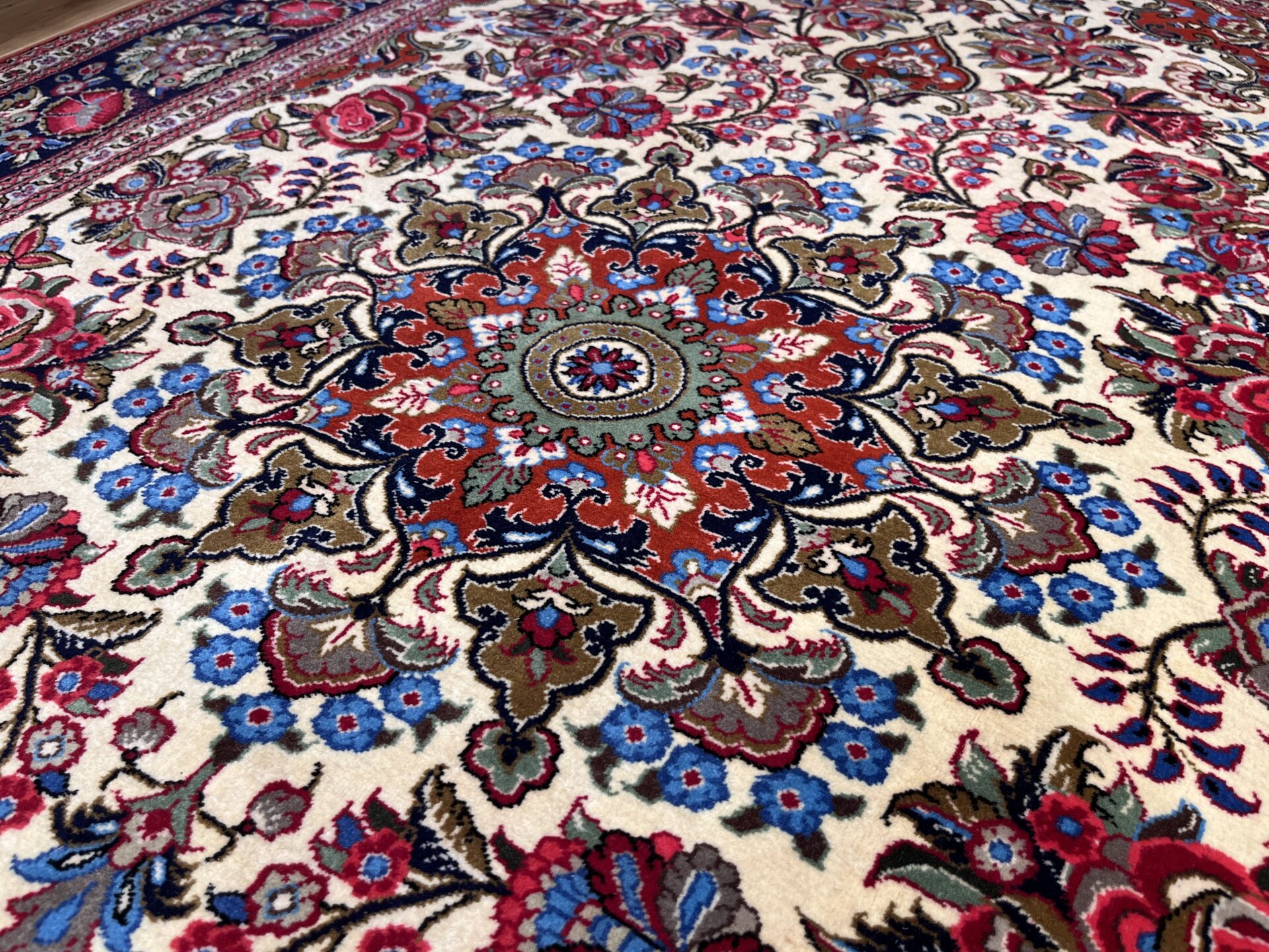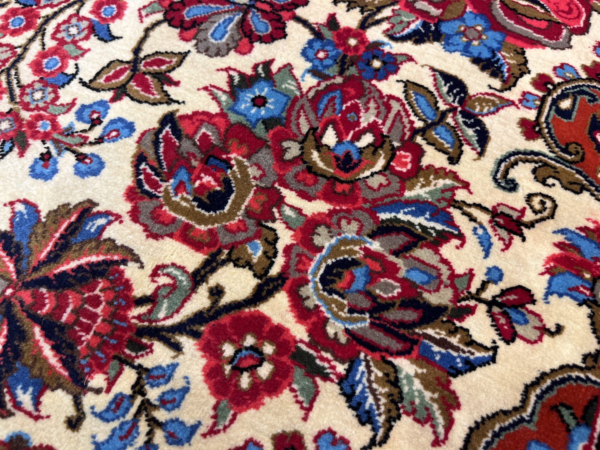 クム産ペルシャ絨毯の魅力が詰まった、大ぶりの花柄が印象的な一枚。