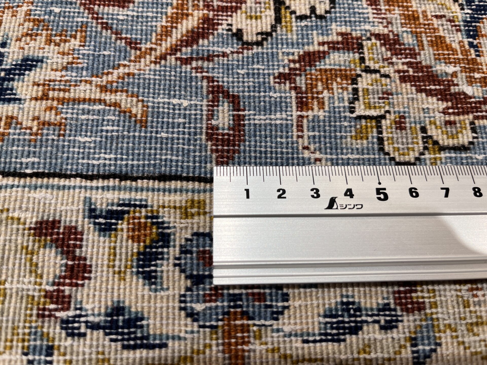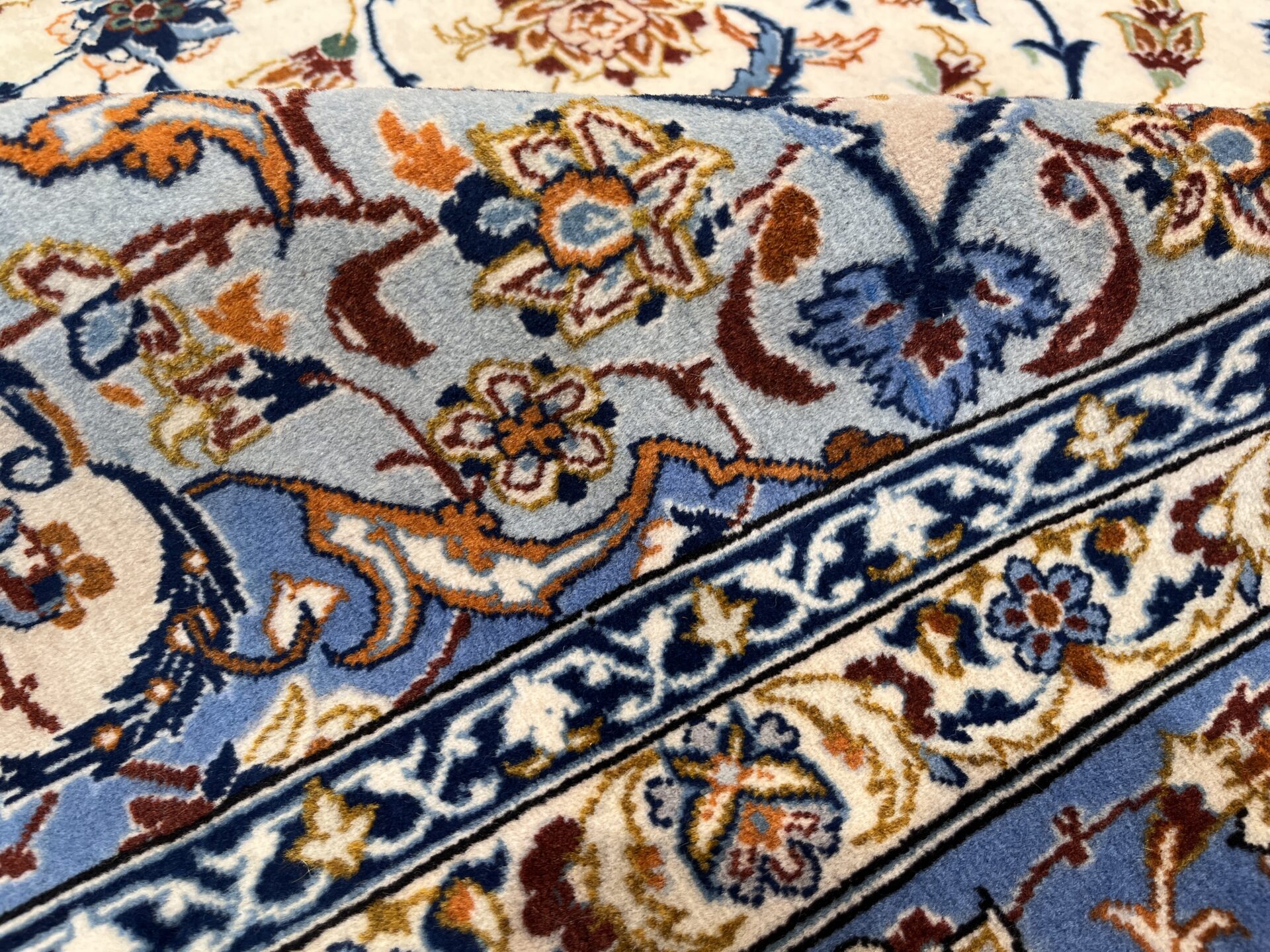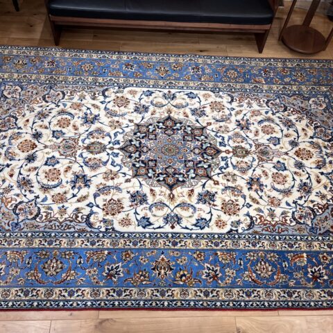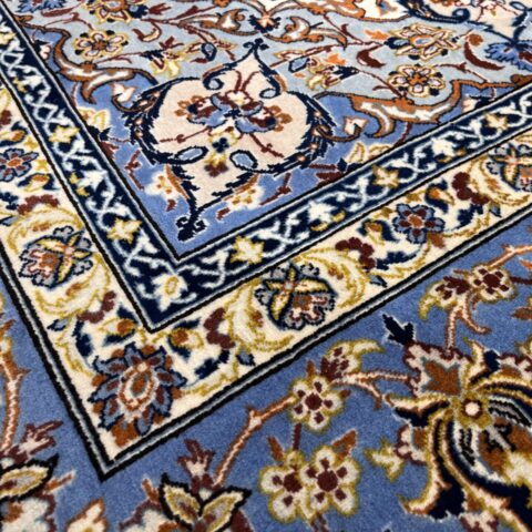 この一枚は、柔らかなブルーと優しいアイボリーを基調に、中央に咲く花のようなメダリオンと、そのまわりを埋め尽くすように織り込まれた小花紋様が特徴。