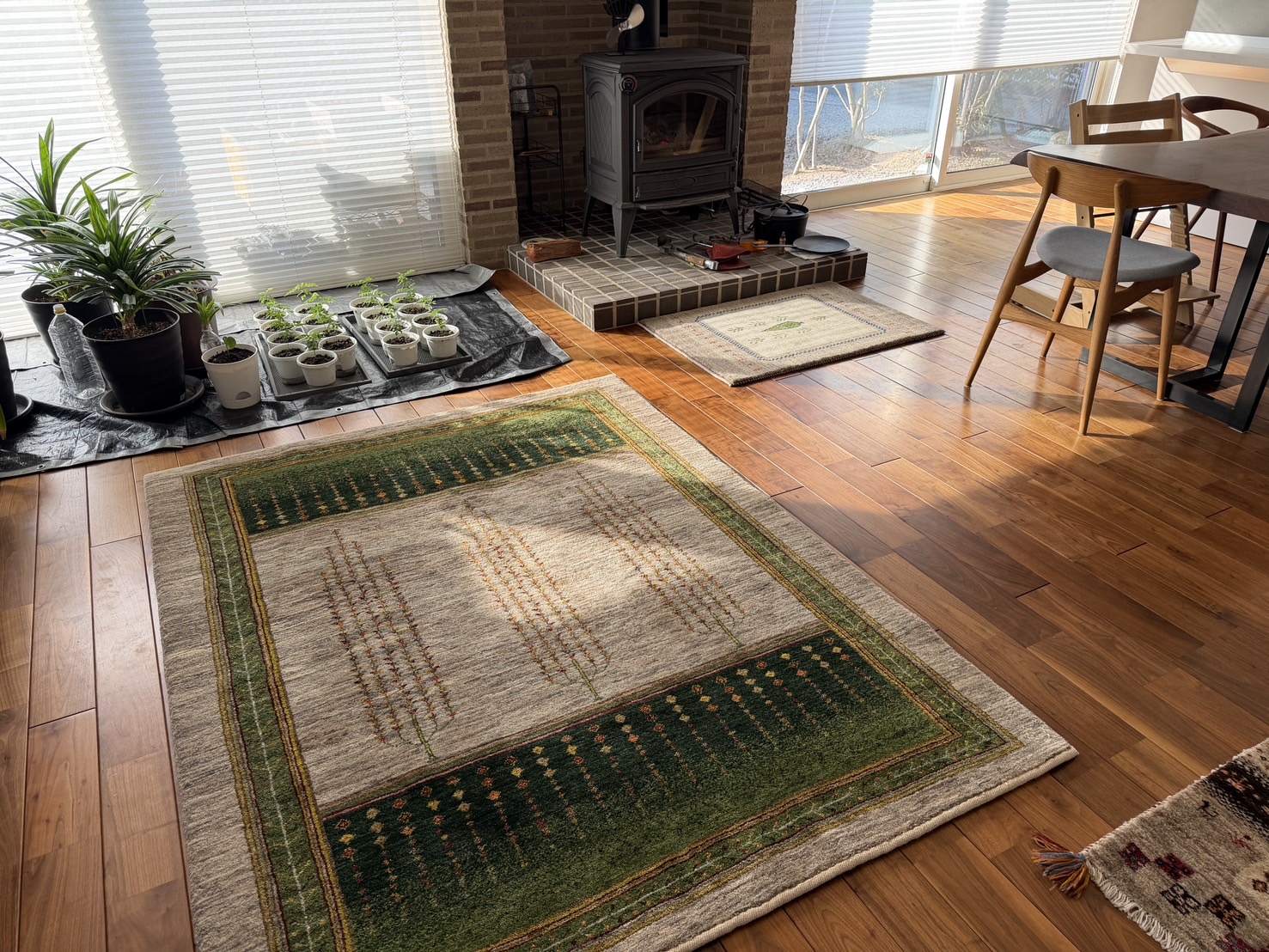 リビングには、これまたおしゃれなカシュクリギャッベ。
