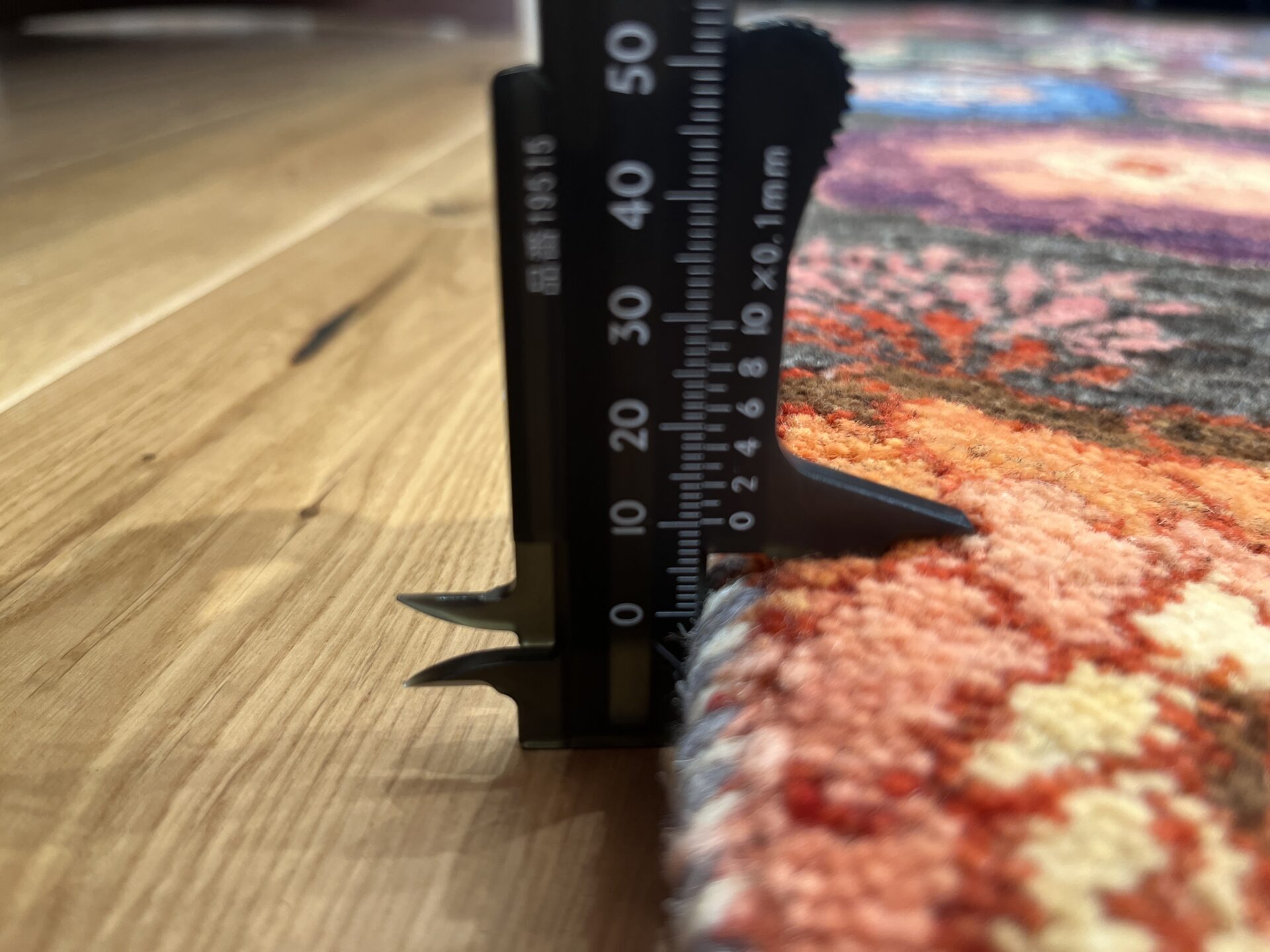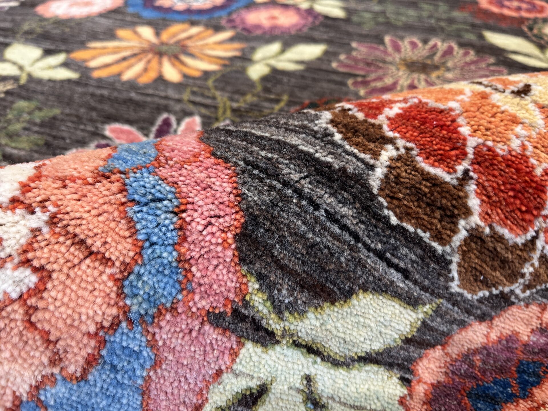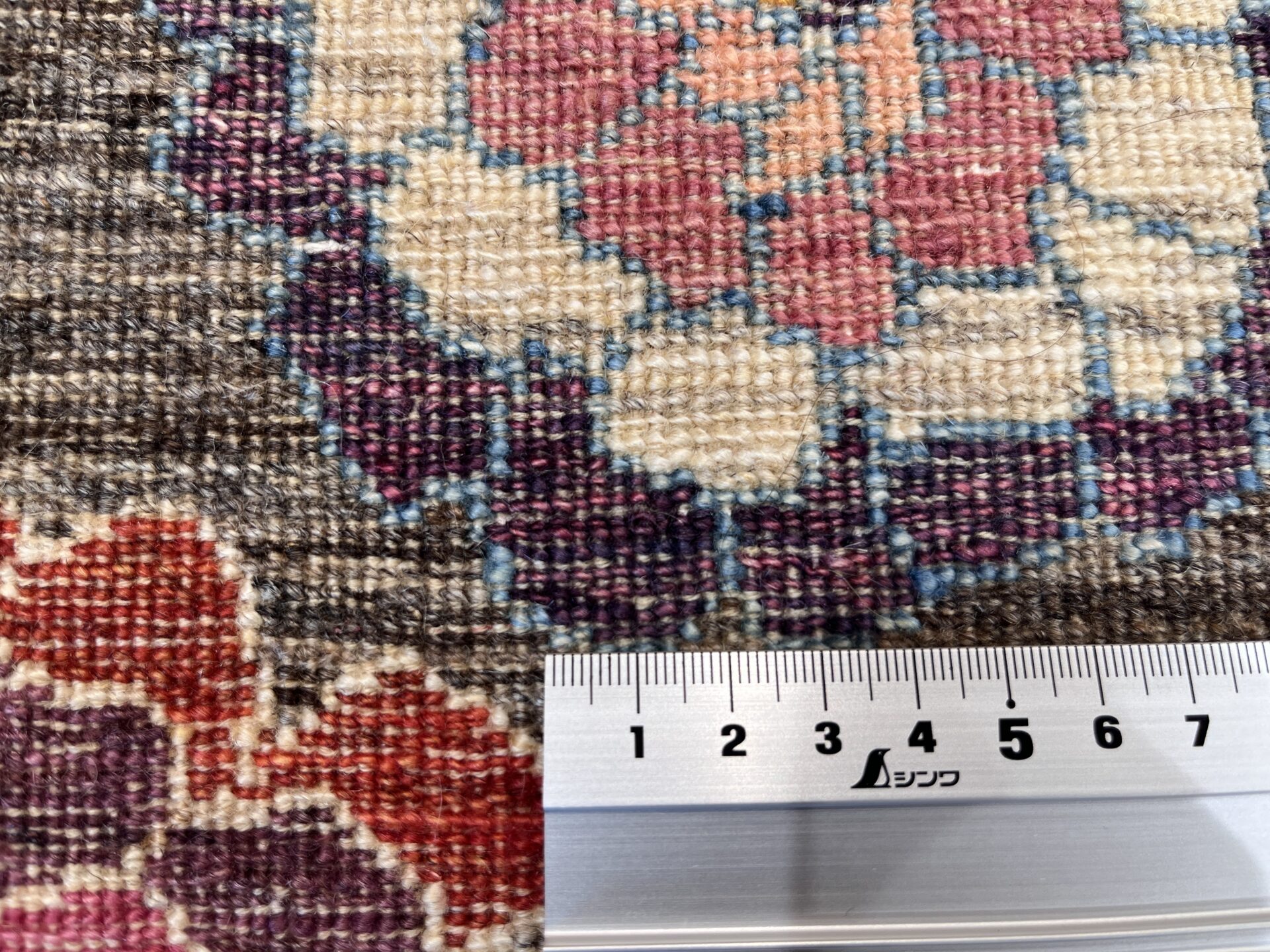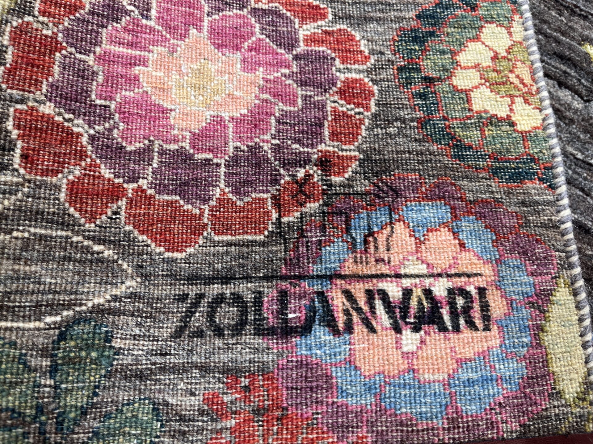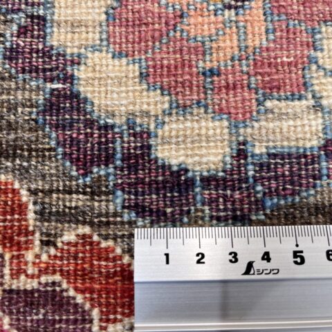 背景のグレーの部分は、染色がない原毛を使用。技術の高い職人が丹精込めて制作した織りの目の最も細かいルリバフランクです。