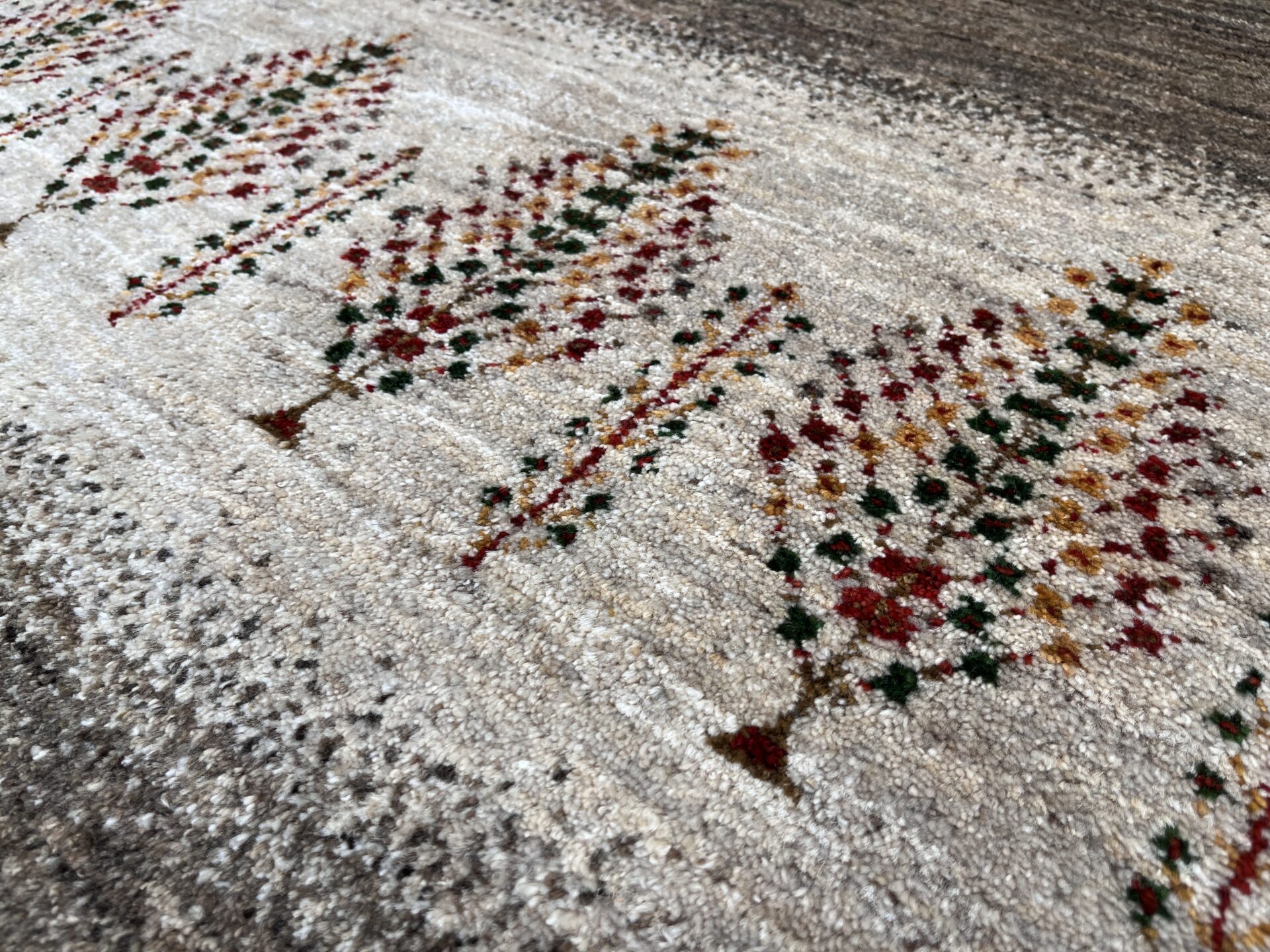 お部屋を明るくさせる柔らかな黄色と落ち着いたグレーの原毛。。上へ上へと伸びる生命の木が、私たちに癒しと活力を与えてくれますね。厚みもあり、踏み心地柔らかな1枚です。
