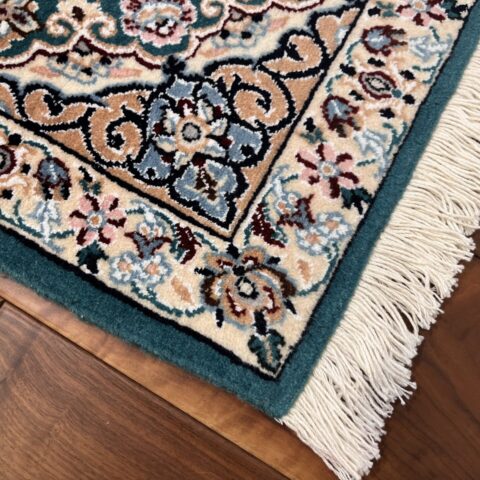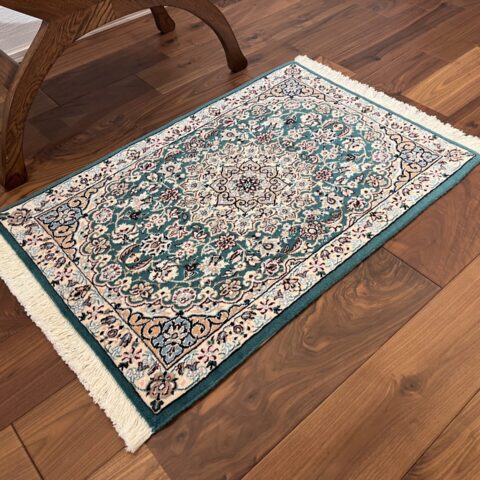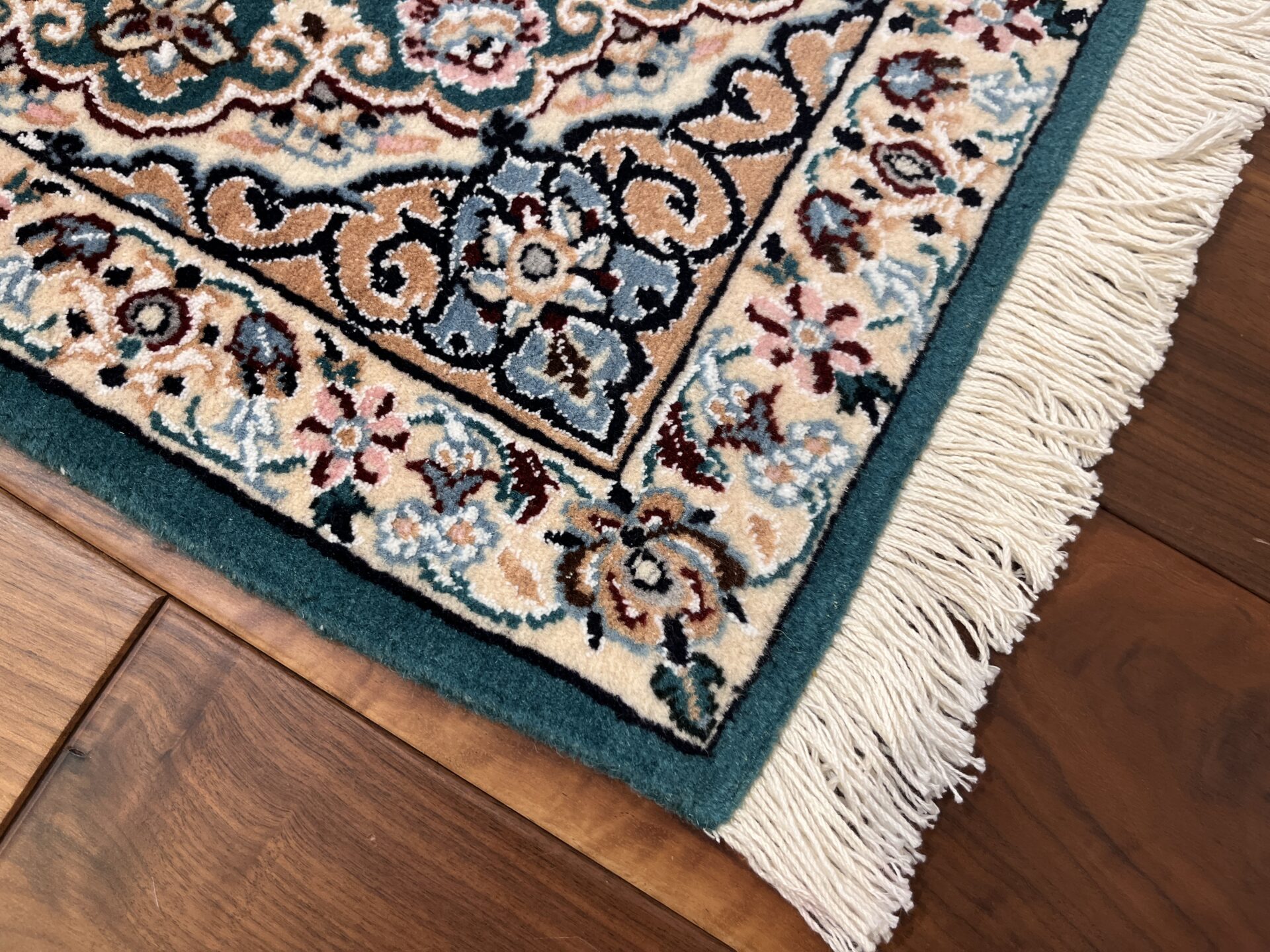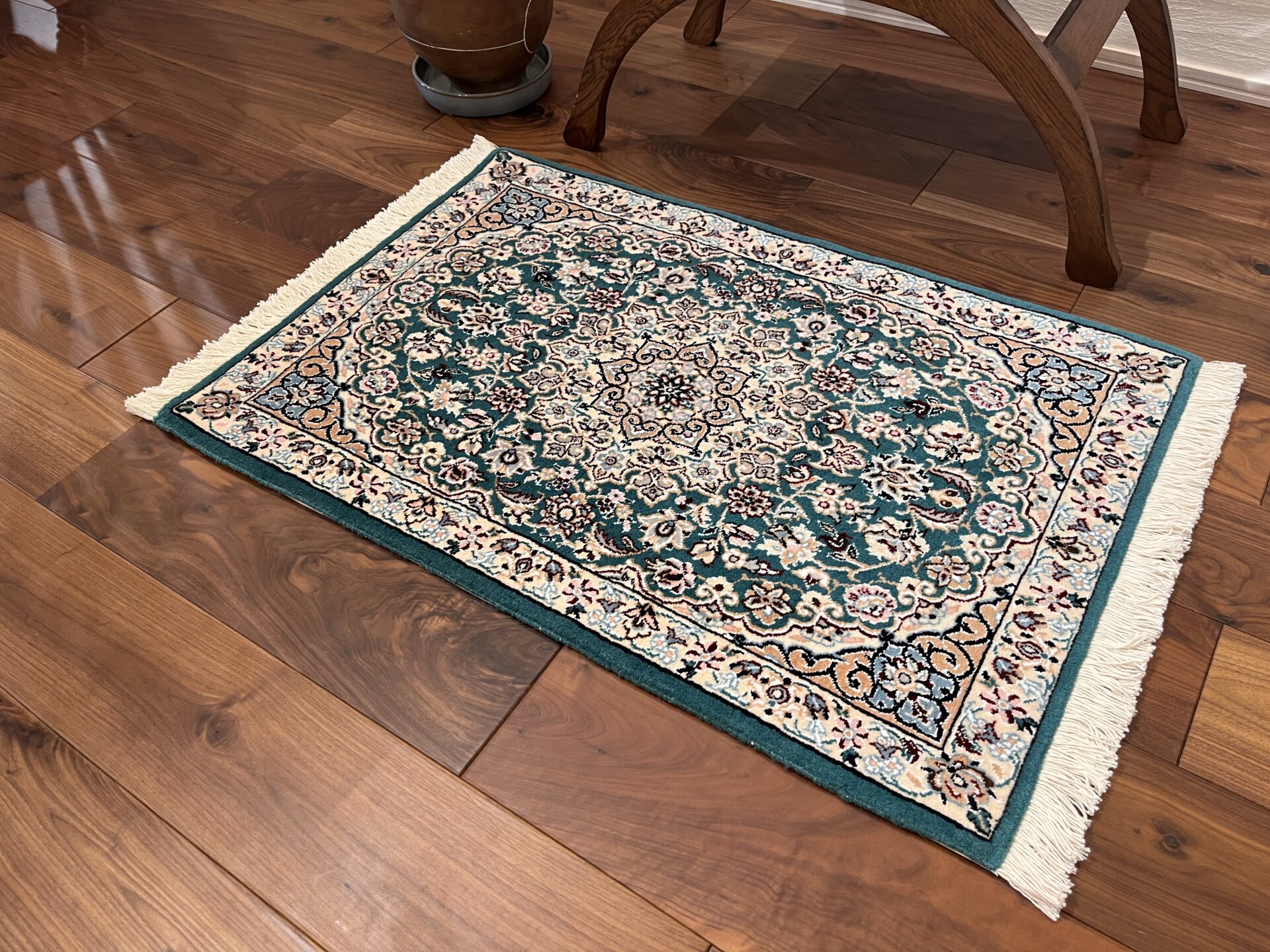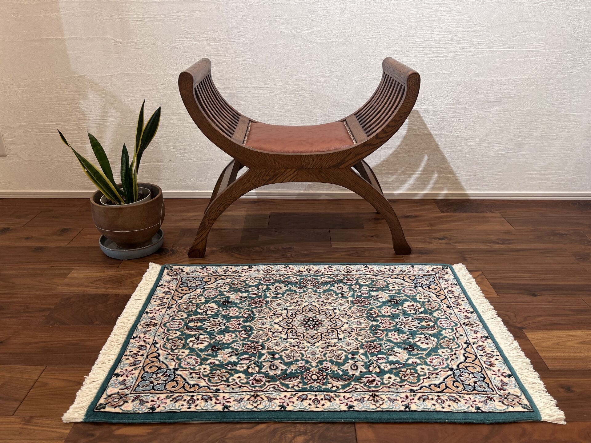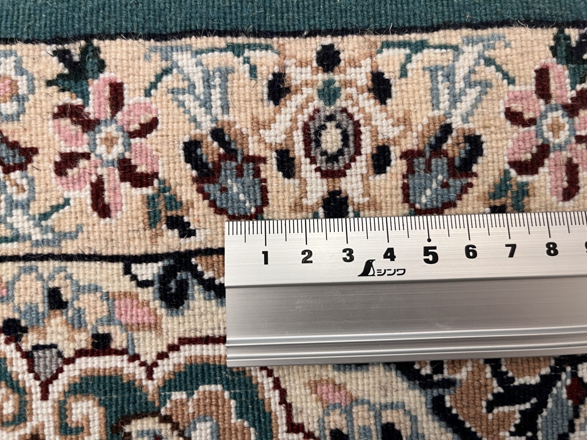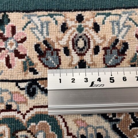 気品のあるグリーンが美しい、ナインのペルシャ絨毯。落ち着いた色調の絨毯で知られるナイン産らしく、深みのあるグリーンを基調に、繊細で緻密な文様が丁寧に織り込まれています。派手さを抑えた上品な色使いが特徴で、空間に穏やかで洗練された雰囲気をもたらしてくれる一枚です。光の当たり方や見る角度によって表情が変わり、日々の暮らしの中でその美しさをじっくりと楽しんでいただけます。
