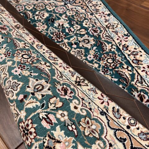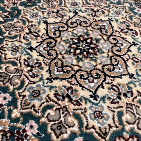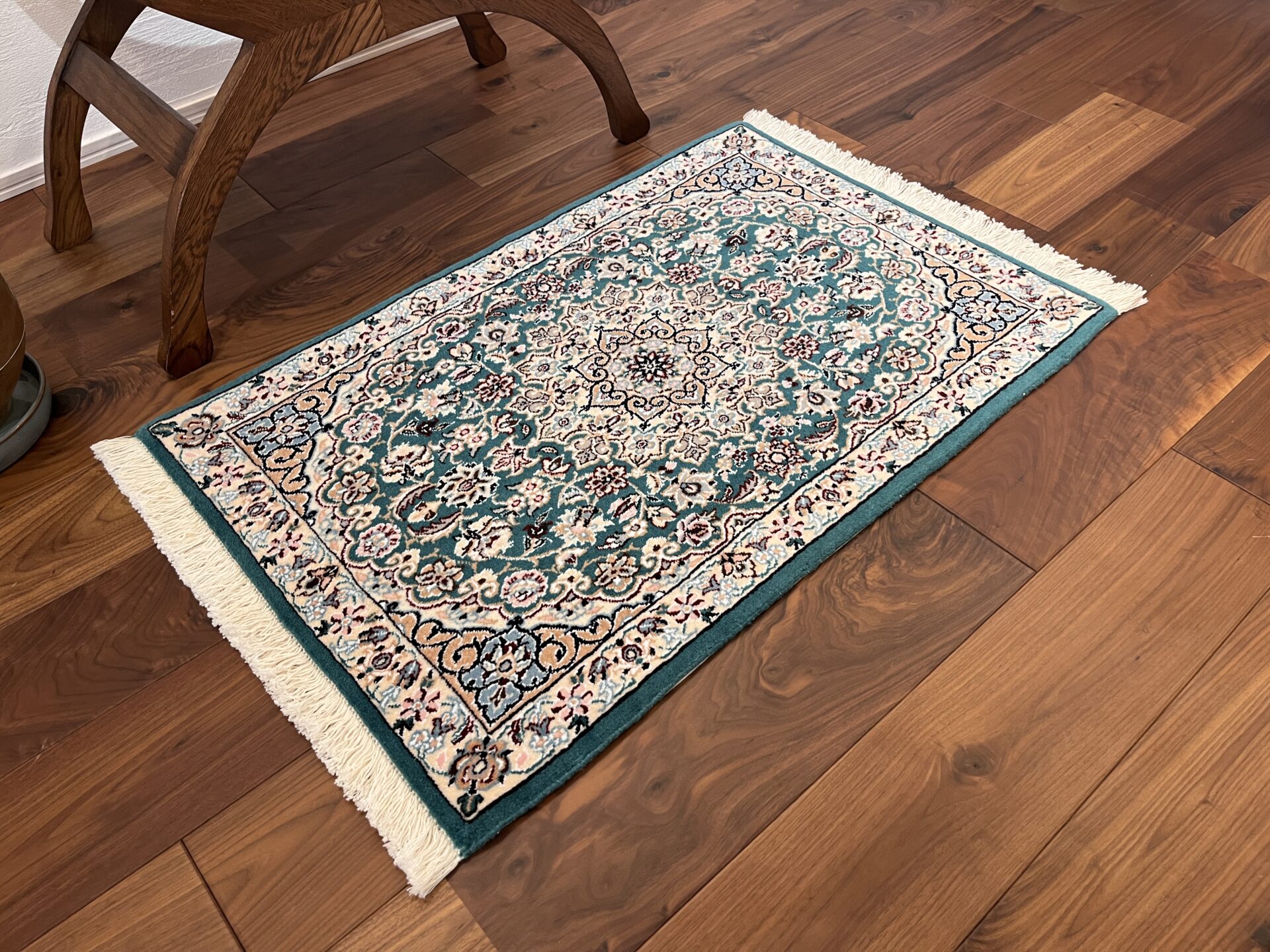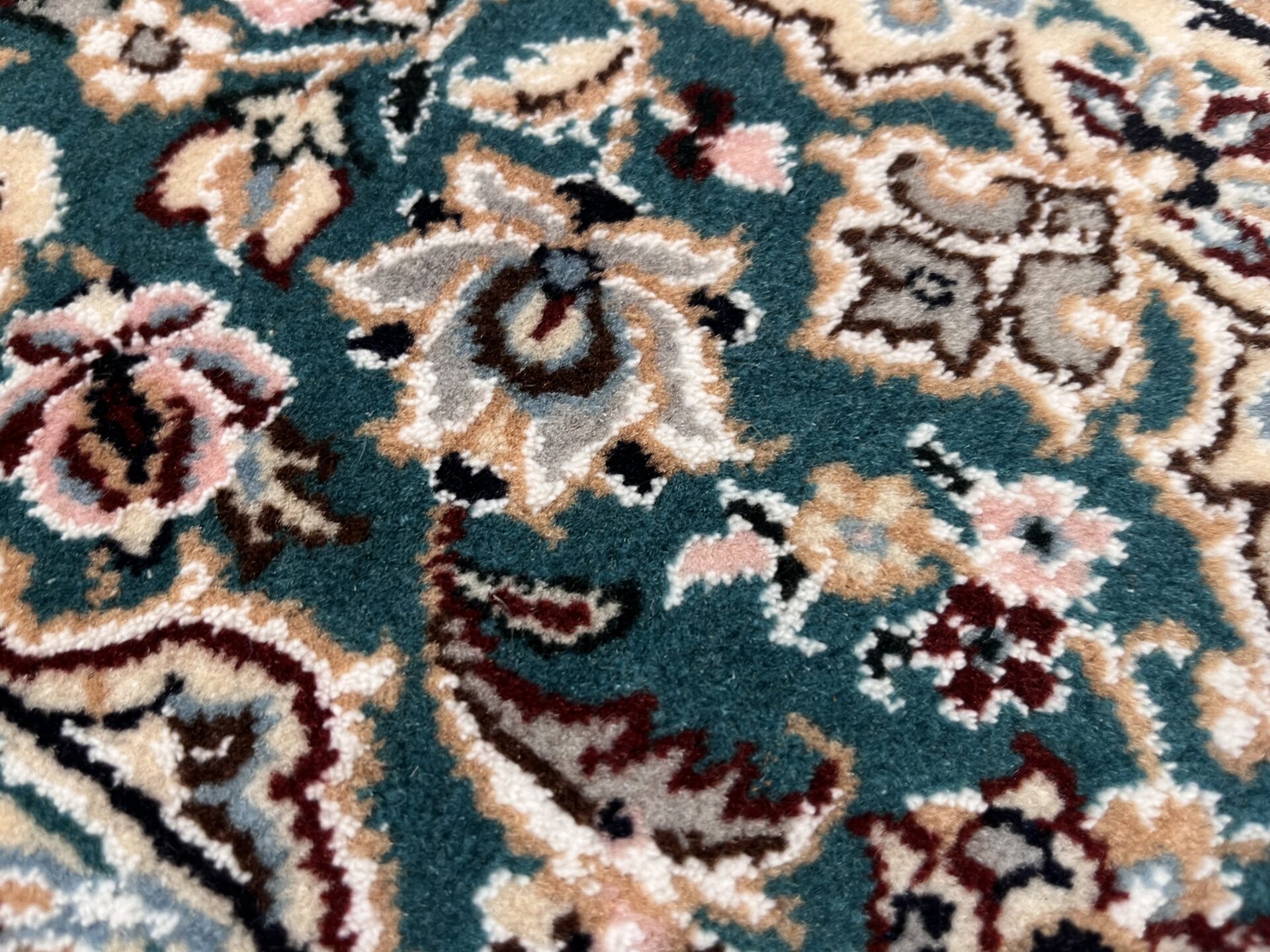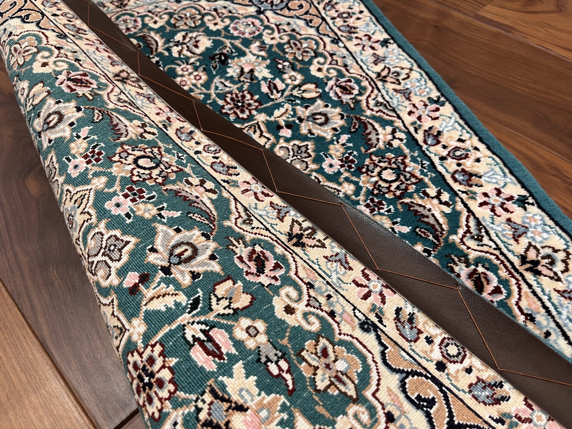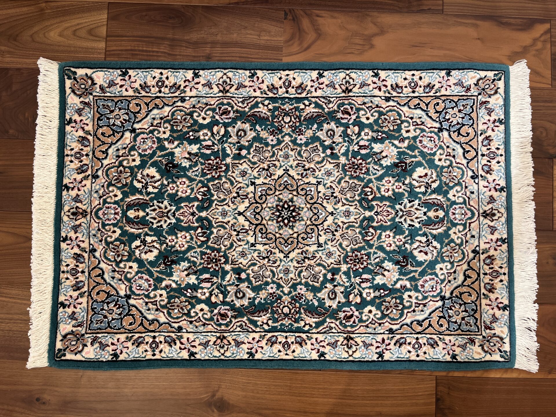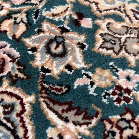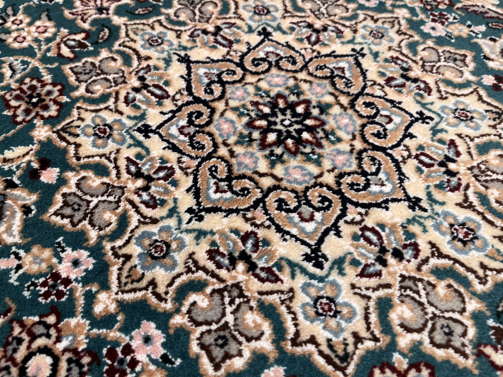気品のあるグリーンが美しい、ナインのペルシャ絨毯。落ち着いた色調の絨毯で知られるナイン産らしく、深みのあるグリーンを基調に、繊細で緻密な文様が丁寧に織り込まれています。派手さを抑えた上品な色使いが特徴で、空間に穏やかで洗練された雰囲気をもたらしてくれる一枚です。光の当たり方や見る角度によって表情が変わり、日々の暮らしの中でその美しさをじっくりと楽しんでいただけます。