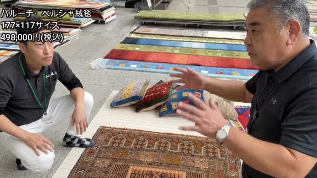 我らがバイヤー、三代目亀川雅史がオススメする絨毯を絨毯販売歴40年の佐藤氏とご紹介する人気のコーナー。