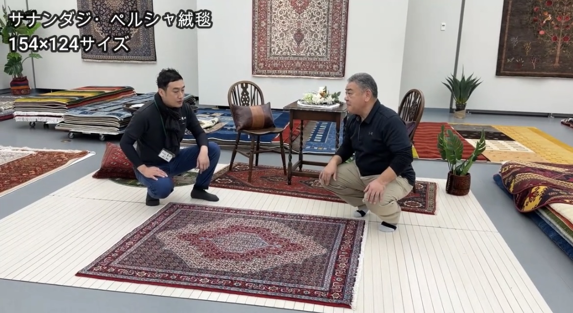 現在のサナンダジは、かつてのペルシャ結びから、ビジャーと同じトルコ結びへと技法を転換させています。これは、より頑丈な絨毯を求める市場のニーズに応えた結果です。 「アイアンカーペット(鉄の絨毯)」と称されるビジャーと似た折り方を目指したサナンダジは、ずっしりとした厚みを持ち、非常にタフな作りが特徴です。佐藤氏は、その強さを「外で使ってもいいほど」と評し、実用性の高さを強調しています。