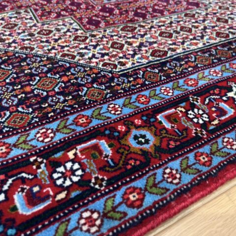サナンダジの品質を支えているのは、地元クルデスタン州で育つ羊の毛です。この地の羊毛は非常に強靭で質が高く、最高級産地であるイスファハンのパイル(毛足)にも使われていると言われるほどです。 この一流のケイト(毛糸)を使い、コツコツと緻密に織り上げられることで、サナンダジ特有の「しなやかでありながら狂靭」な質感が生まれます。