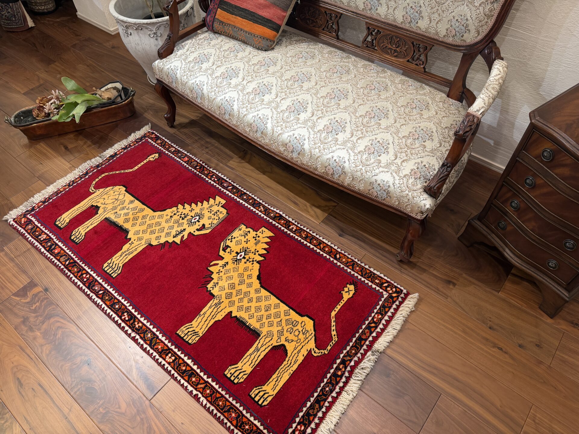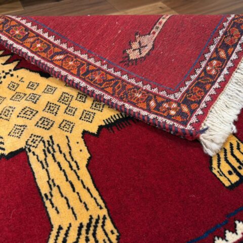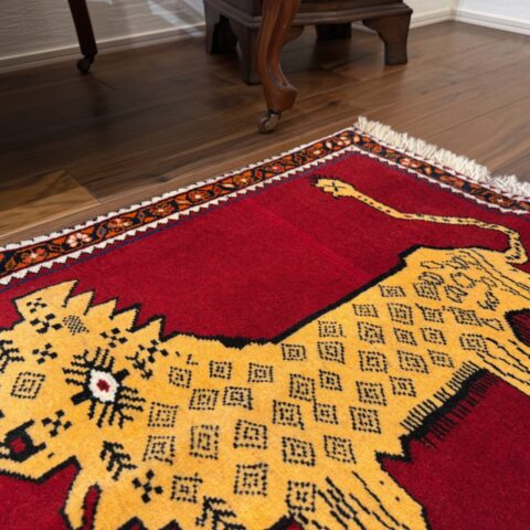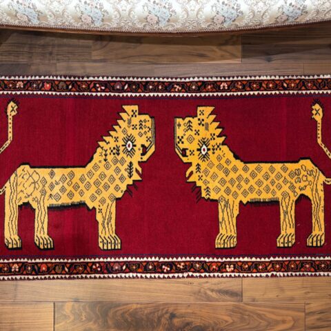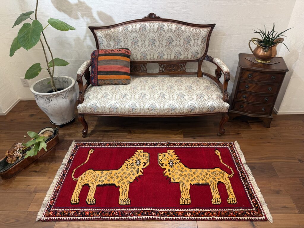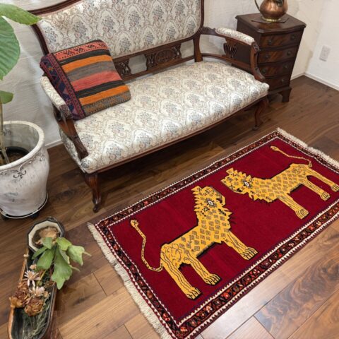 鮮やかな赤色に、2頭のライオンが向かい合う姿がなんとも可愛らしいギャッベです,。