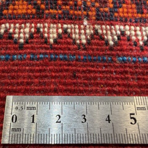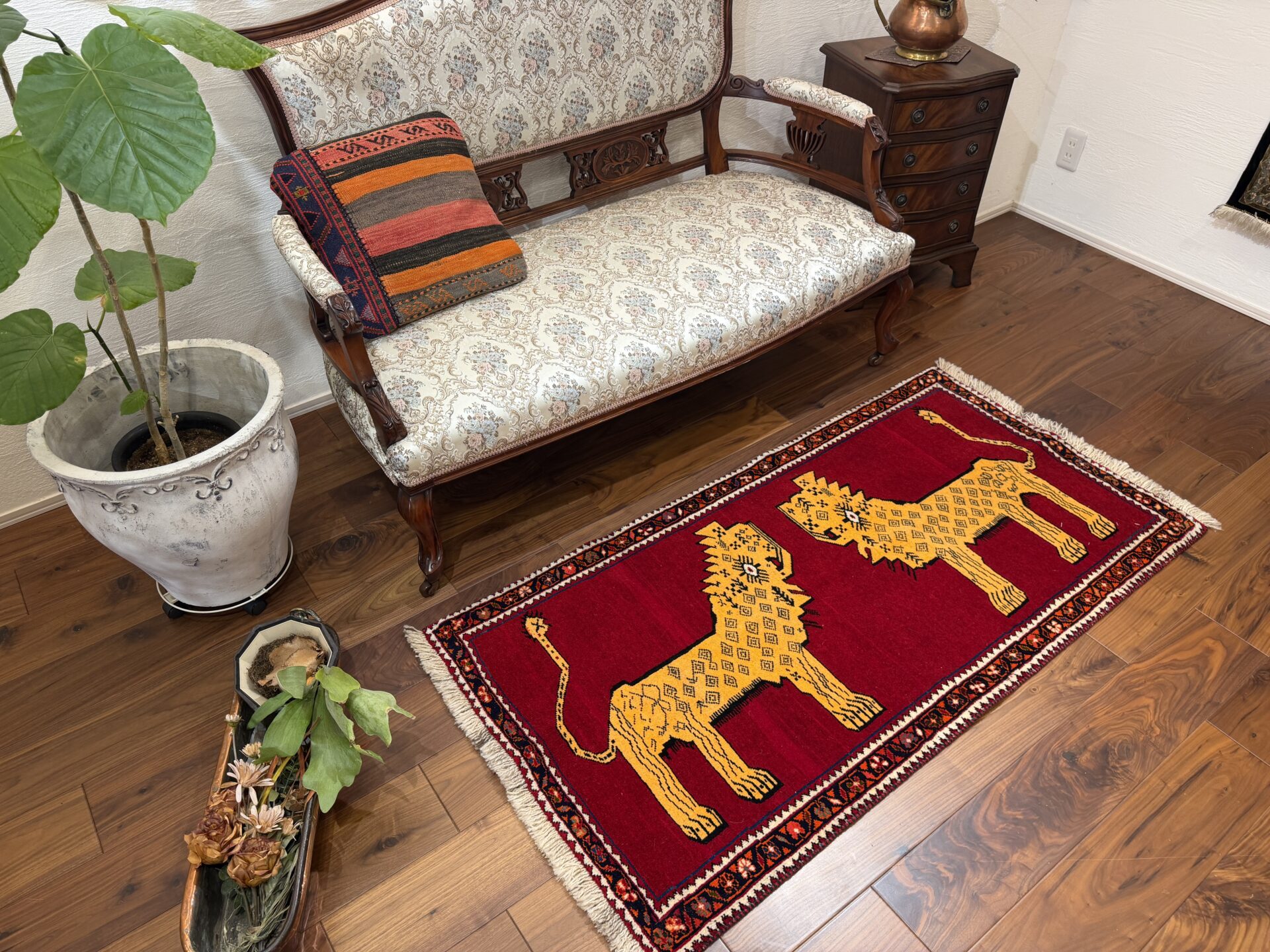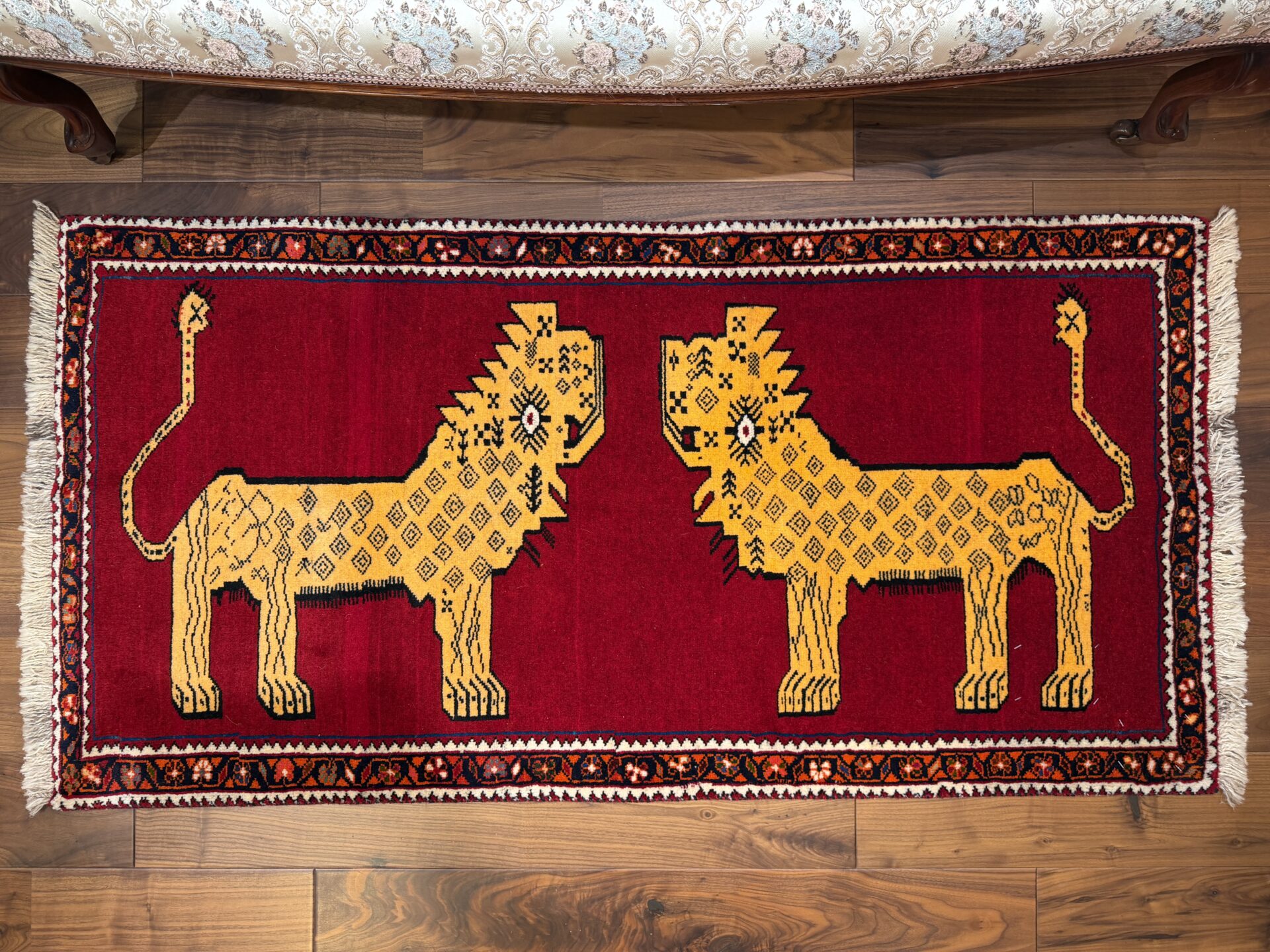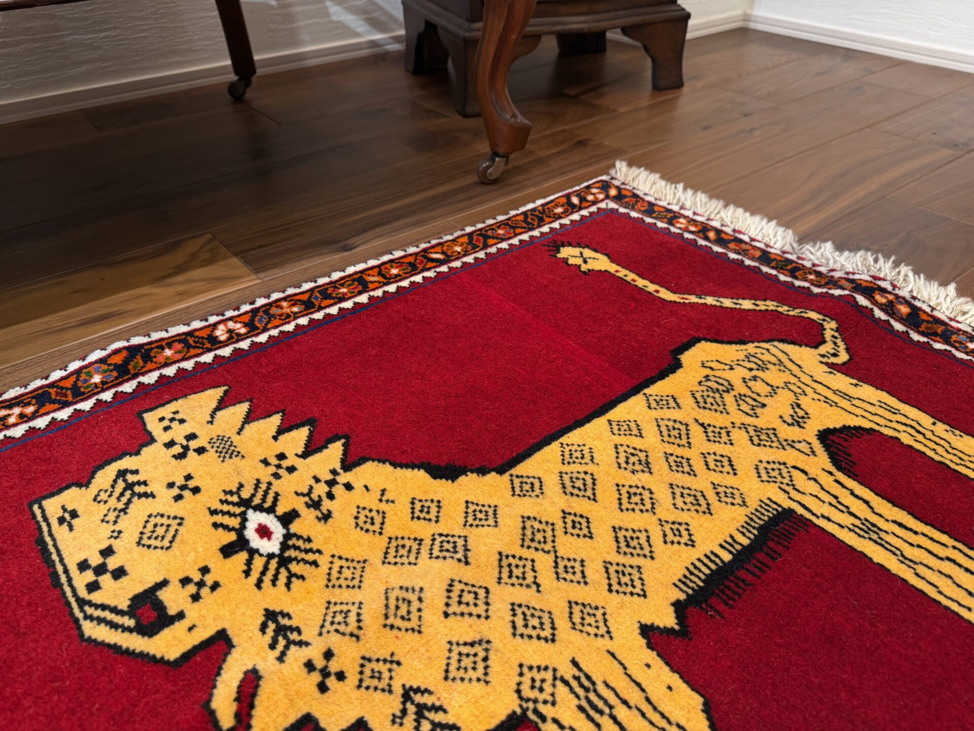 鮮やかな赤色に、2頭のライオンが向かい合う姿がなんとも可愛らしいギャッベです,。