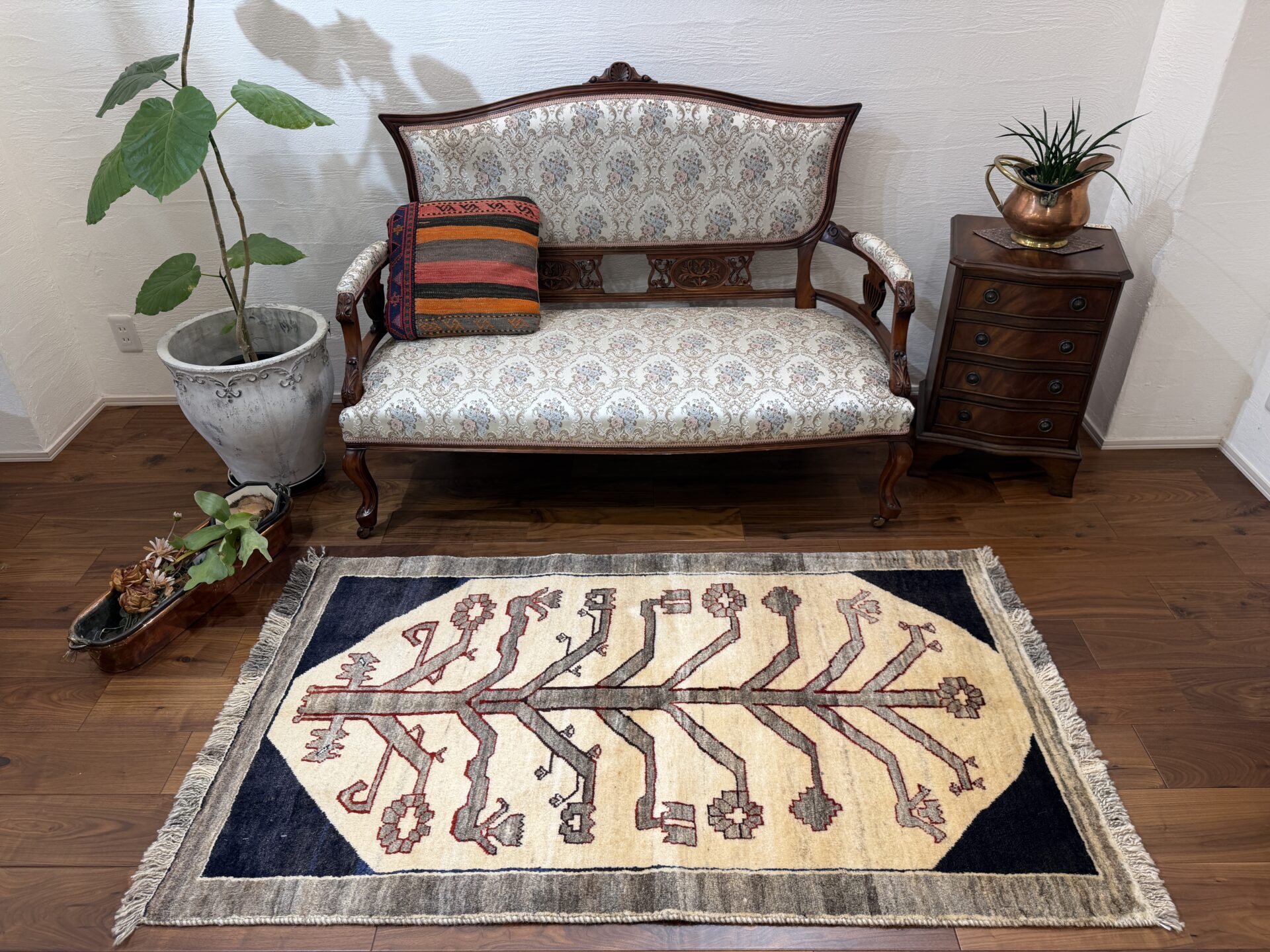 中央に力強く伸びるこの「生命の樹」は、大地に根を張り天へと広がる姿から、家族の「長寿」や「健康」、そして「永遠の幸せ」を象徴する大変縁起の良いモチーフです。枝の先に織り込まれた多彩な幾何学模様には、日々の平穏や豊かさへの祈りが込められており、部族の感性が光るモダンなアートのような趣があります。