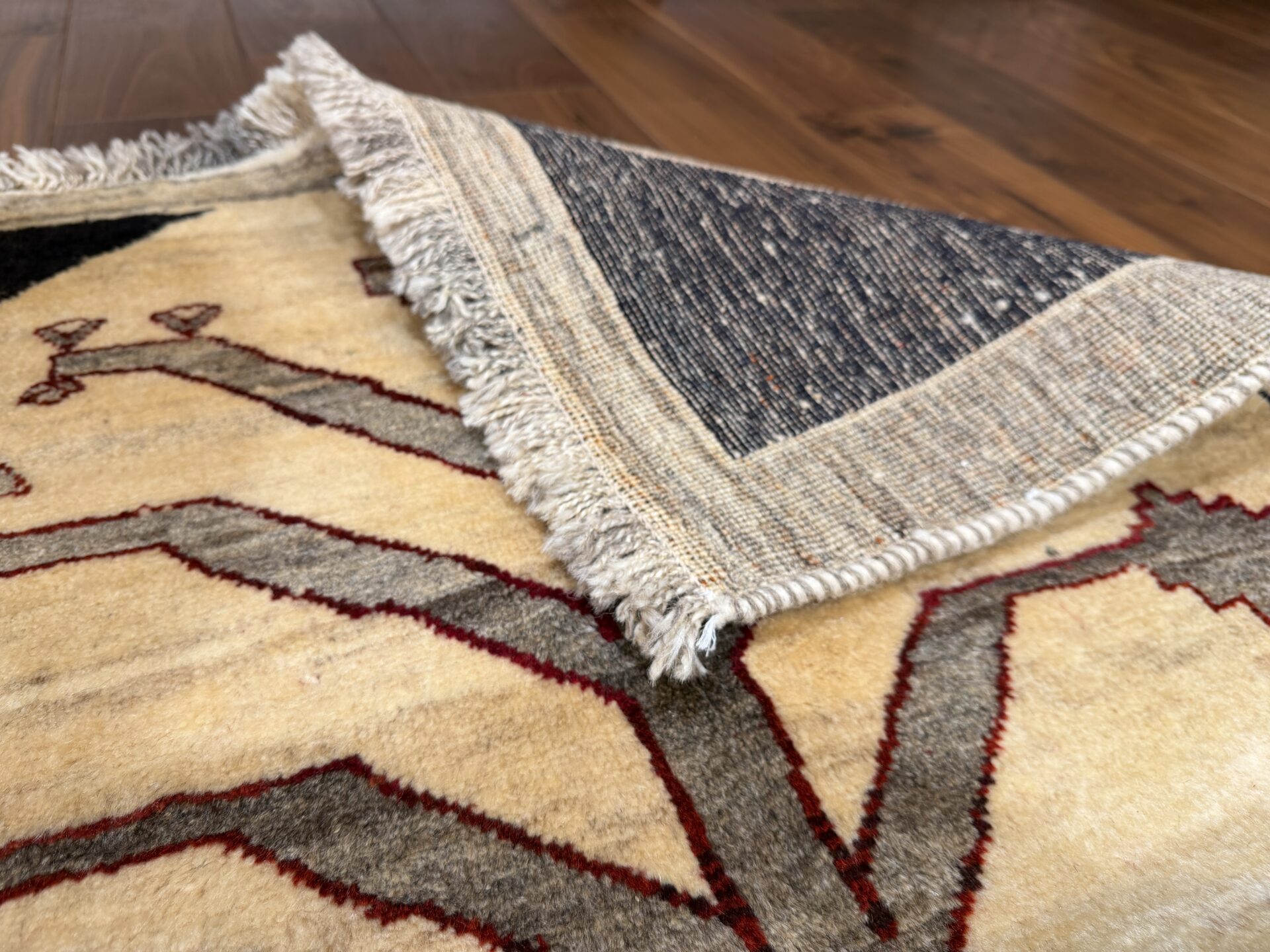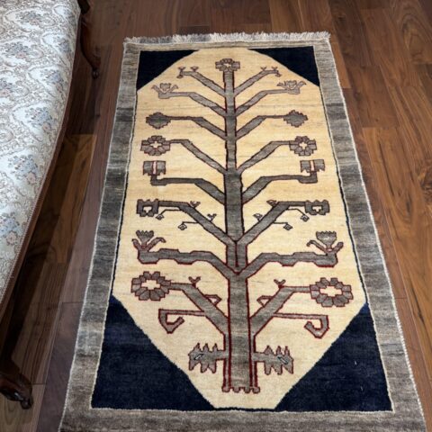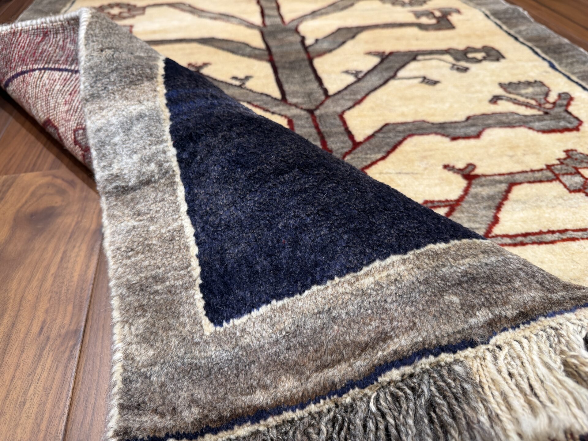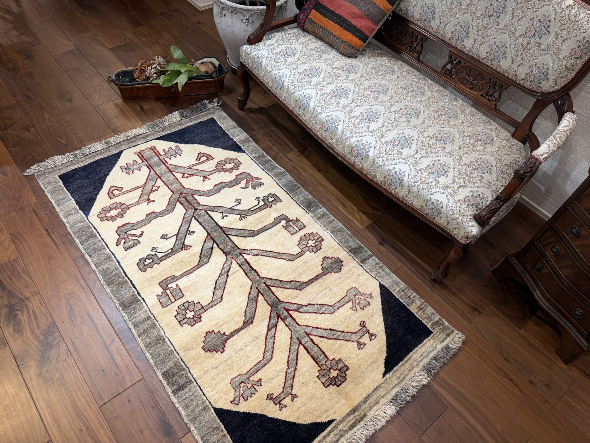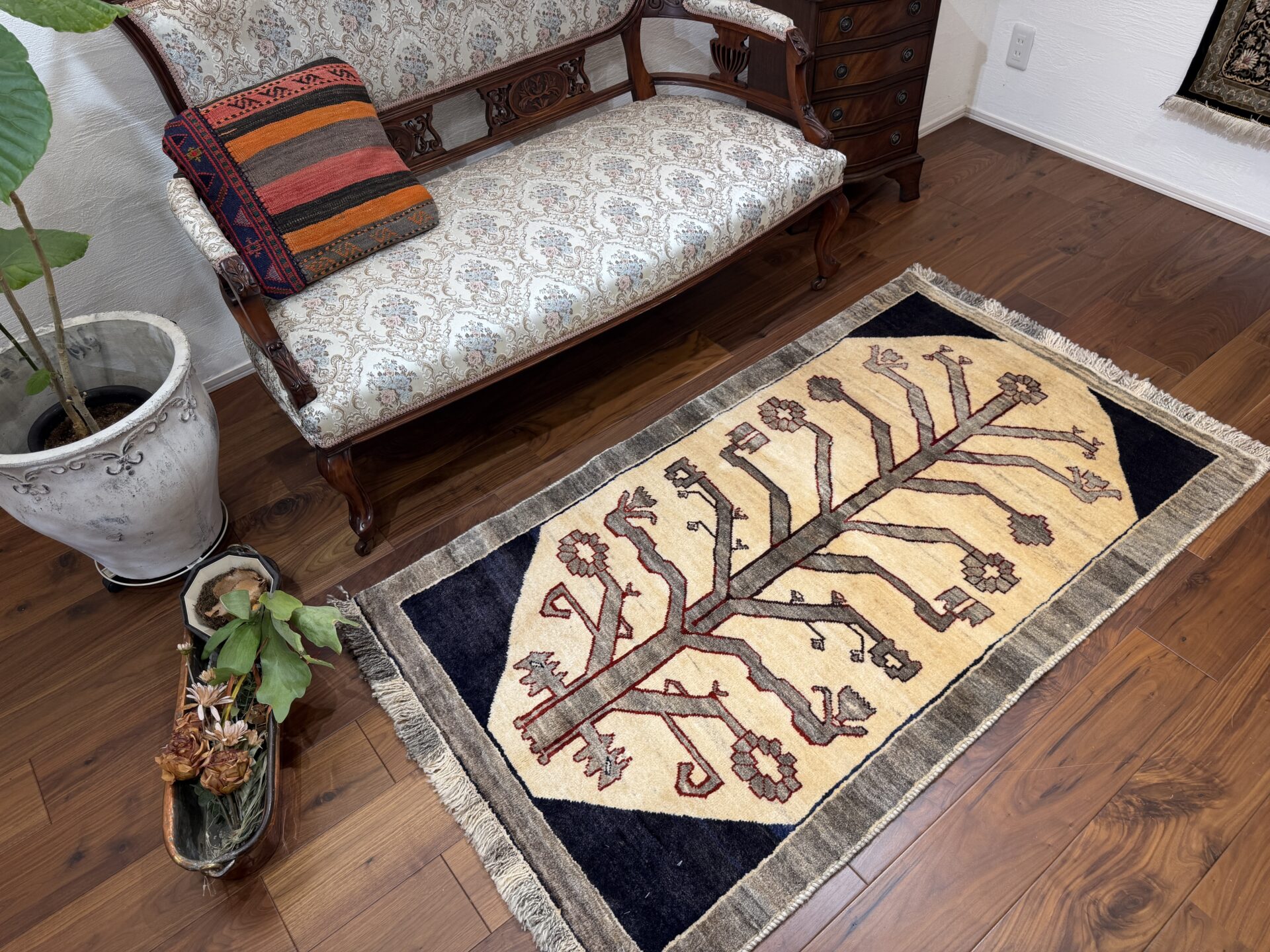 明るいベージュの背景に、一本の大きな樹木が大胆に描き出された、バルーチ族による独創的な一枚です。