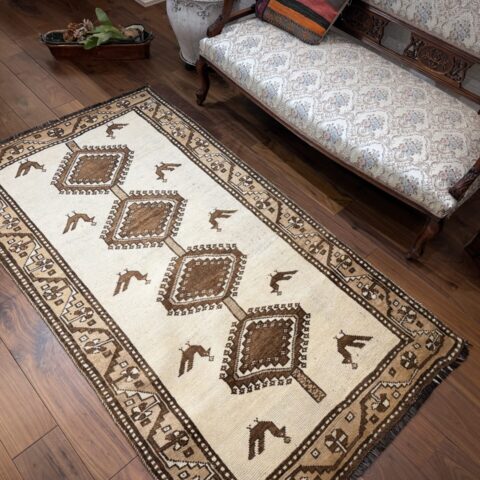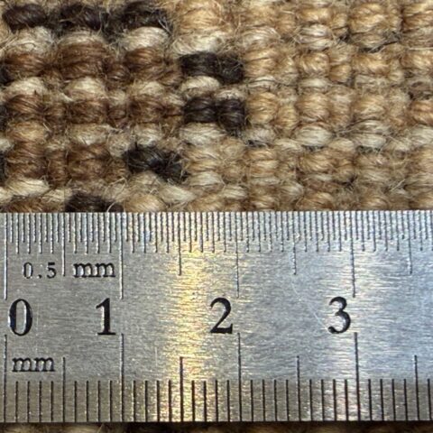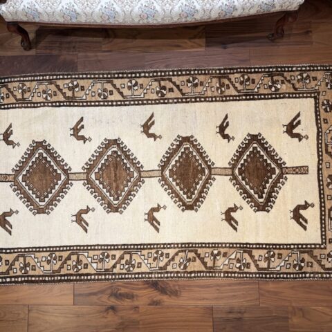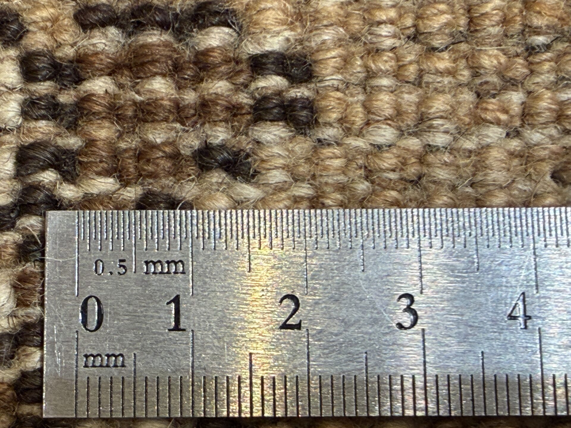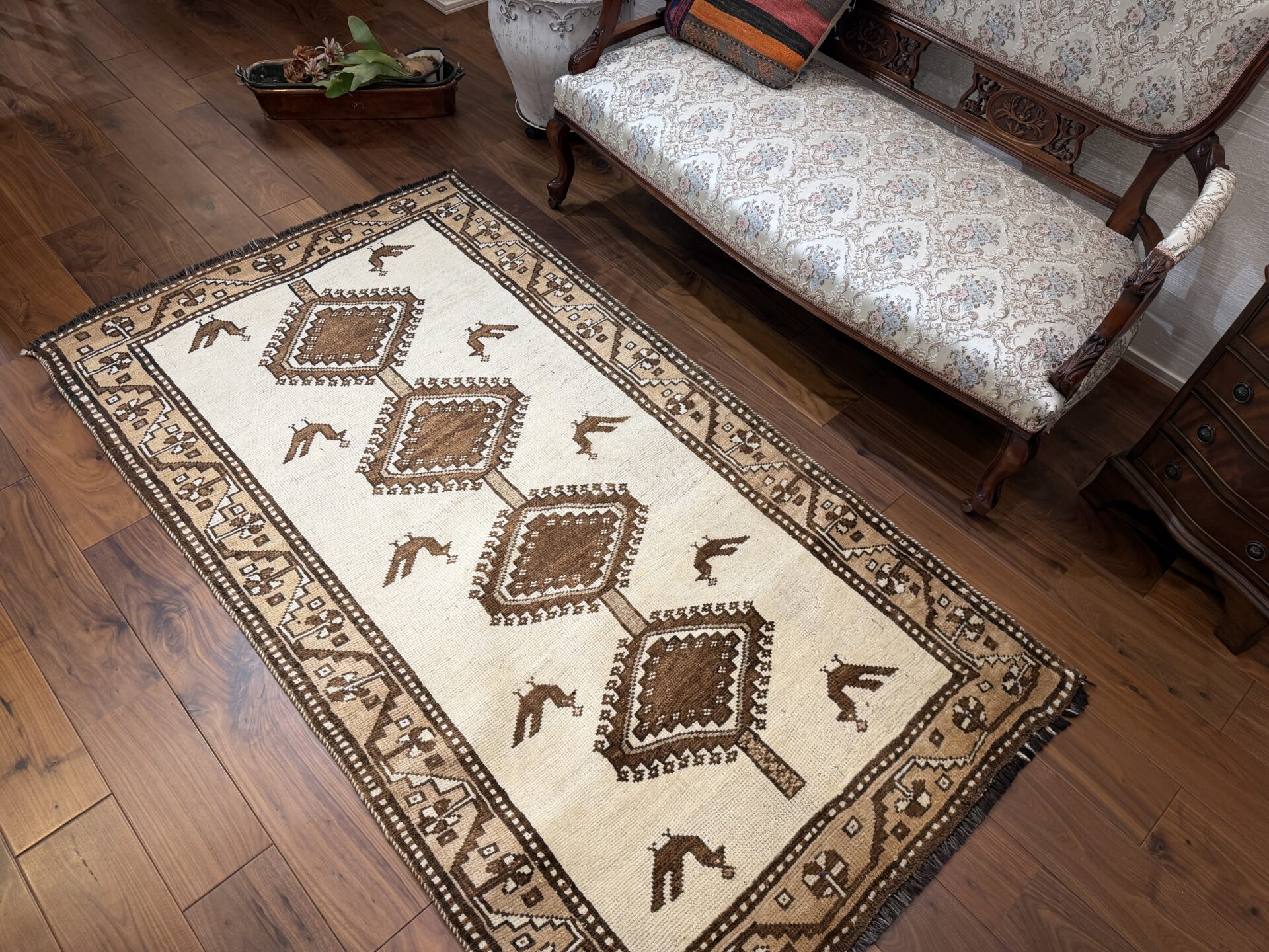 柔らかなアイボリーの地色に、大地を思わせるブラウンで描かれたひし形と、その周りを歩く可愛らしい鹿の紋様が目を引きます。年月を経てしなやかさを増したウールの質感と、無染色の羊毛ならではの絶妙な色のグラデーションです。