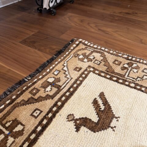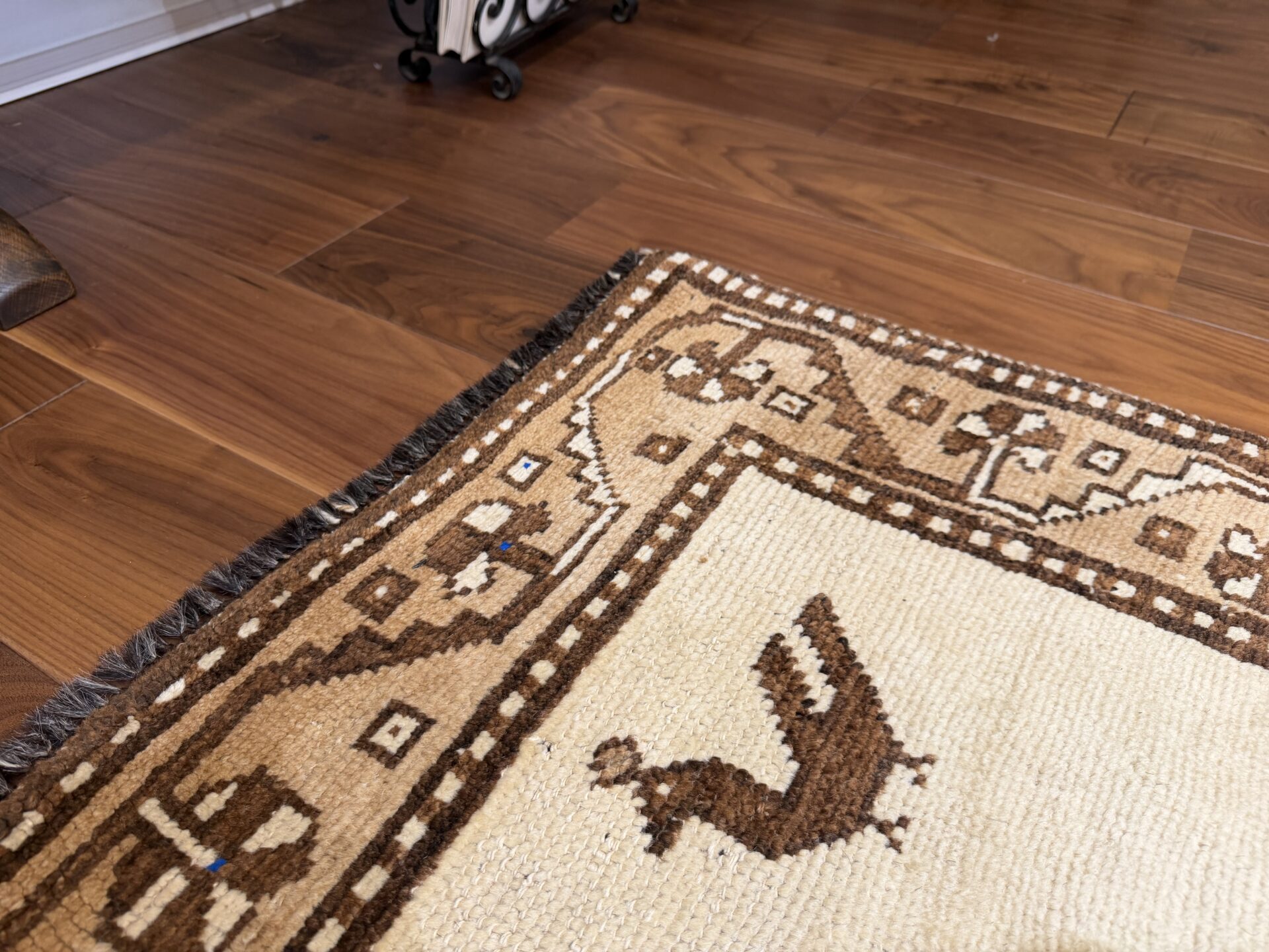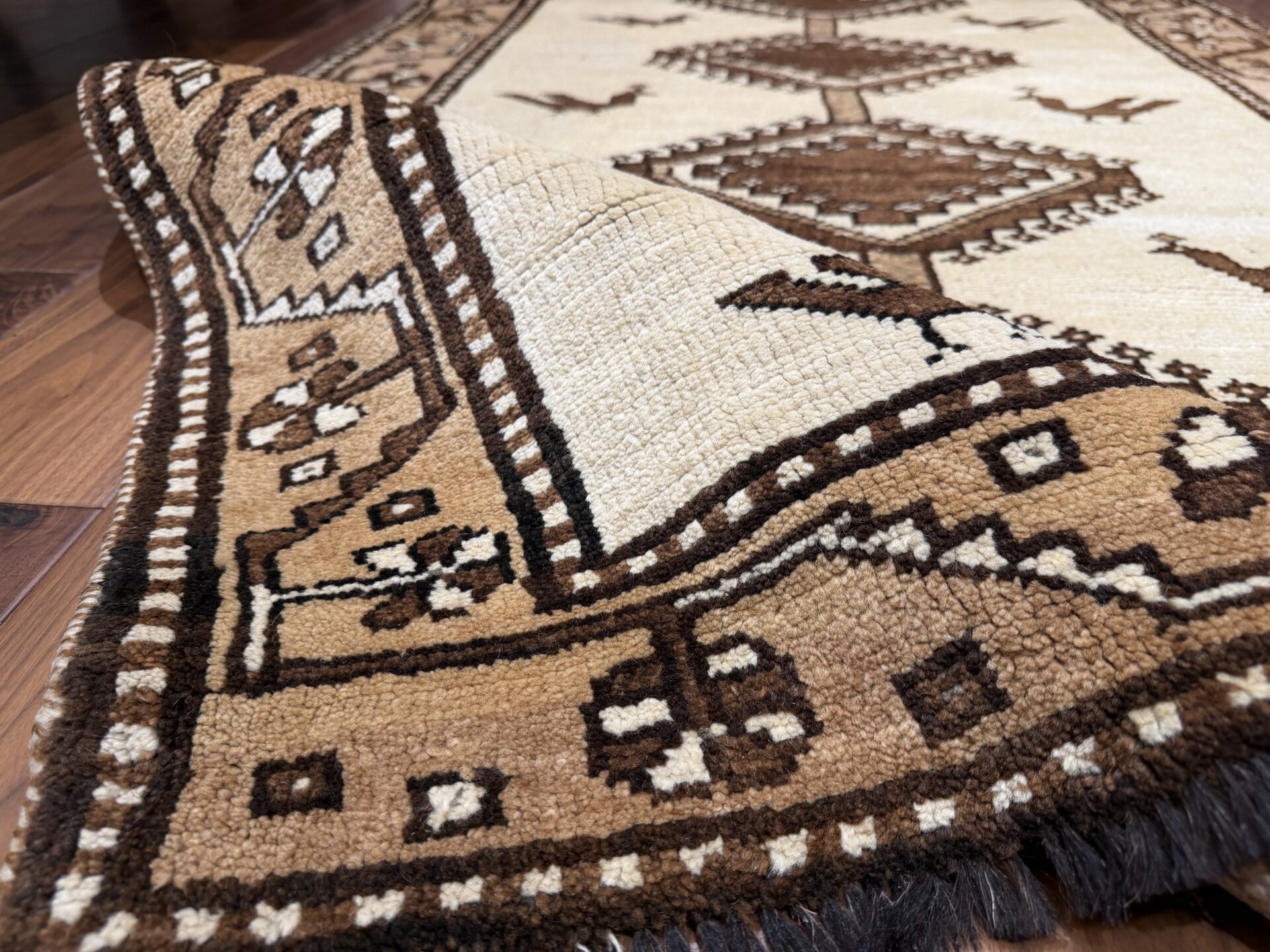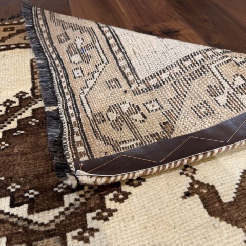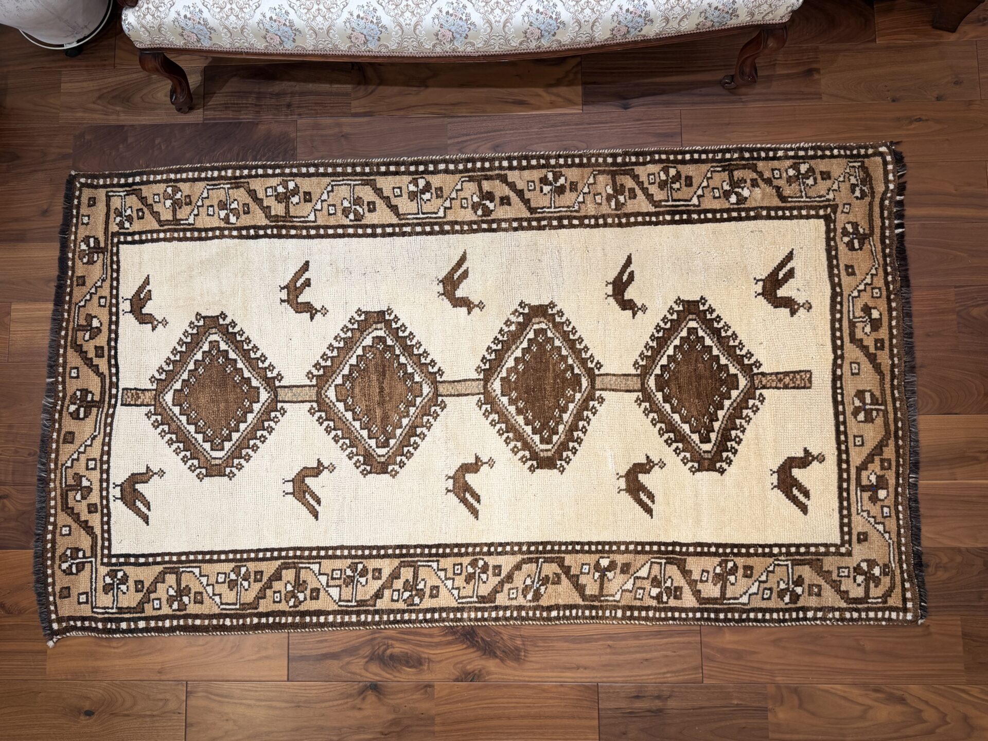 柔らかなアイボリーの地色に、大地を思わせるブラウンで描かれたひし形と、その周りを歩く可愛らしい鹿の紋様が目を引きます。年月を経てしなやかさを増したウールの質感と、無染色の羊毛ならではの絶妙な色のグラデーションです。