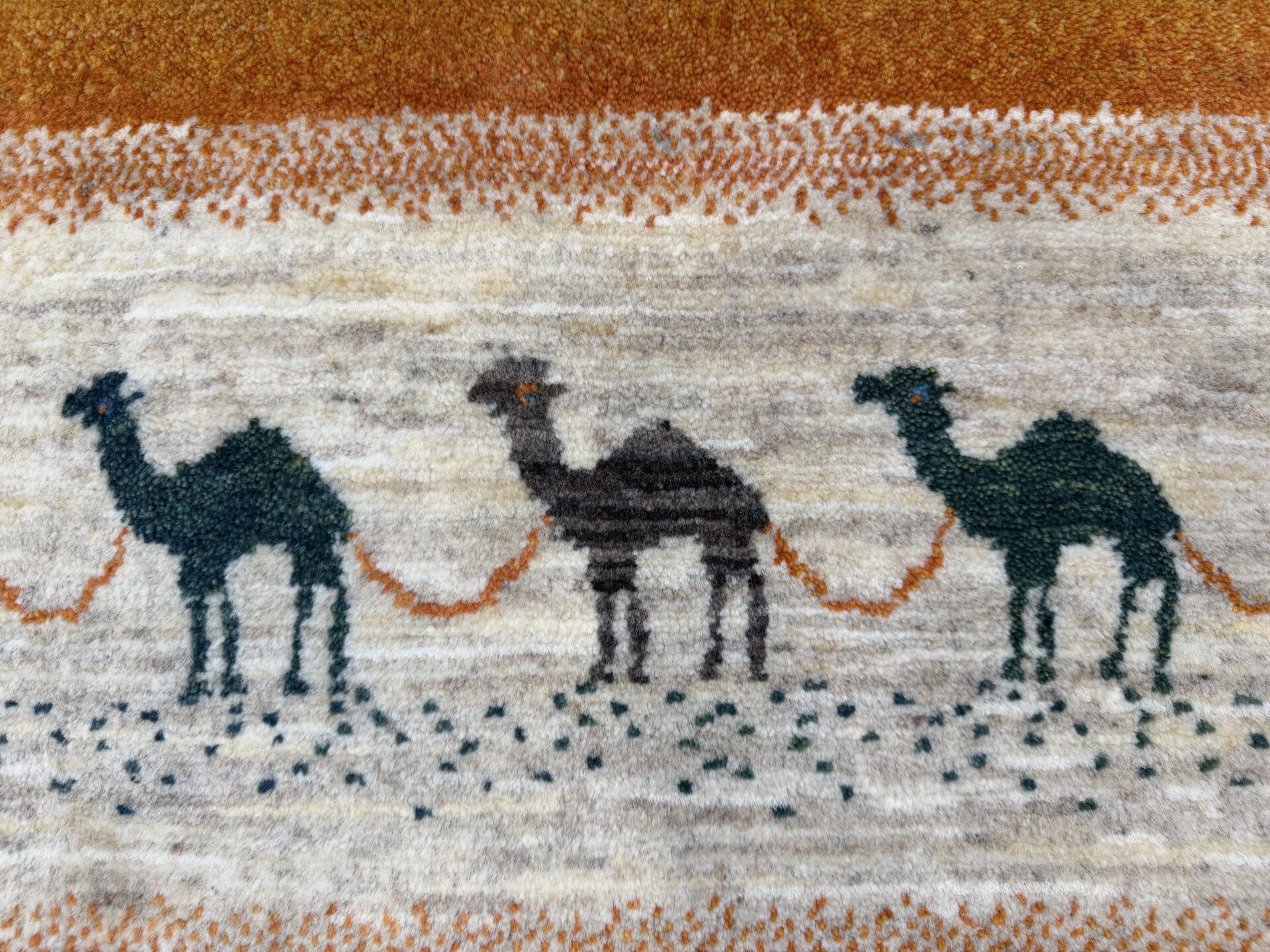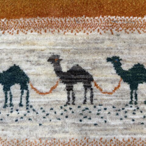 その豊かな地色を背景に、中央を横切る白い帯には、悠々と歩く「ラクダ」たちの姿が描かれています。遊牧民にとって財産であり、長距離の旅を支えるラクダは、「成功」や「富」を象徴する縁起の良いモチーフ。