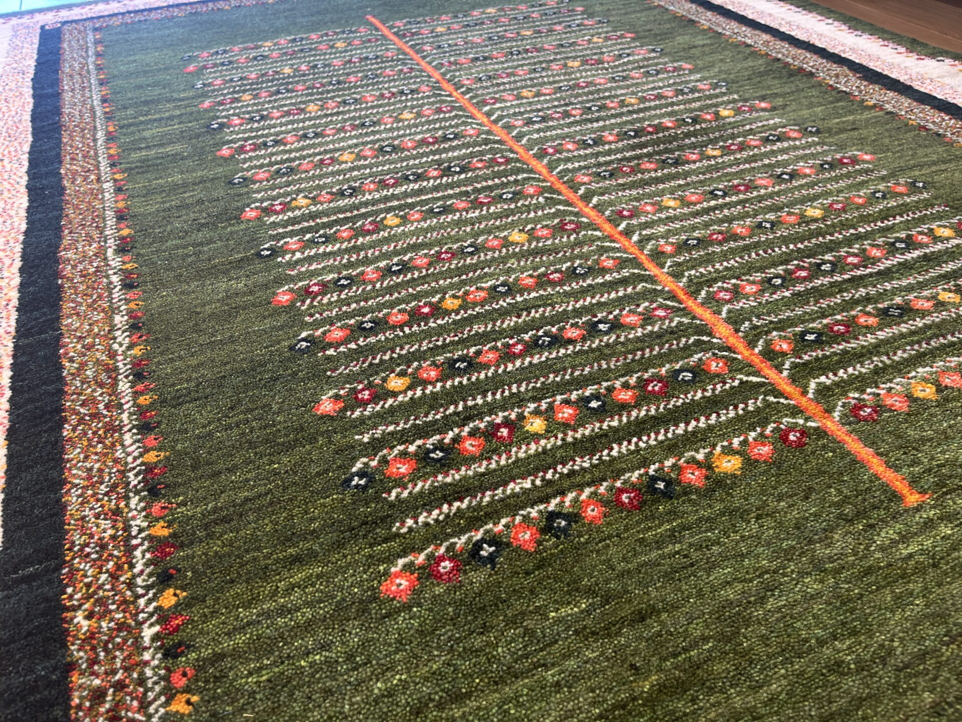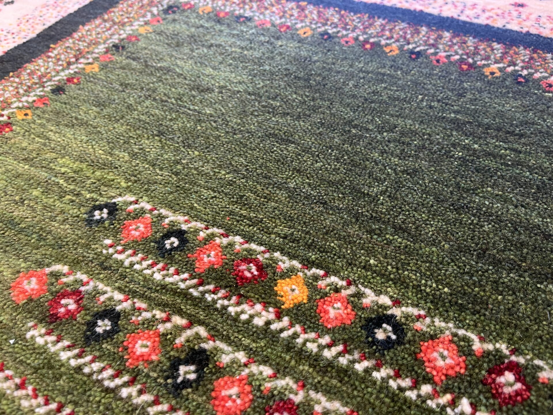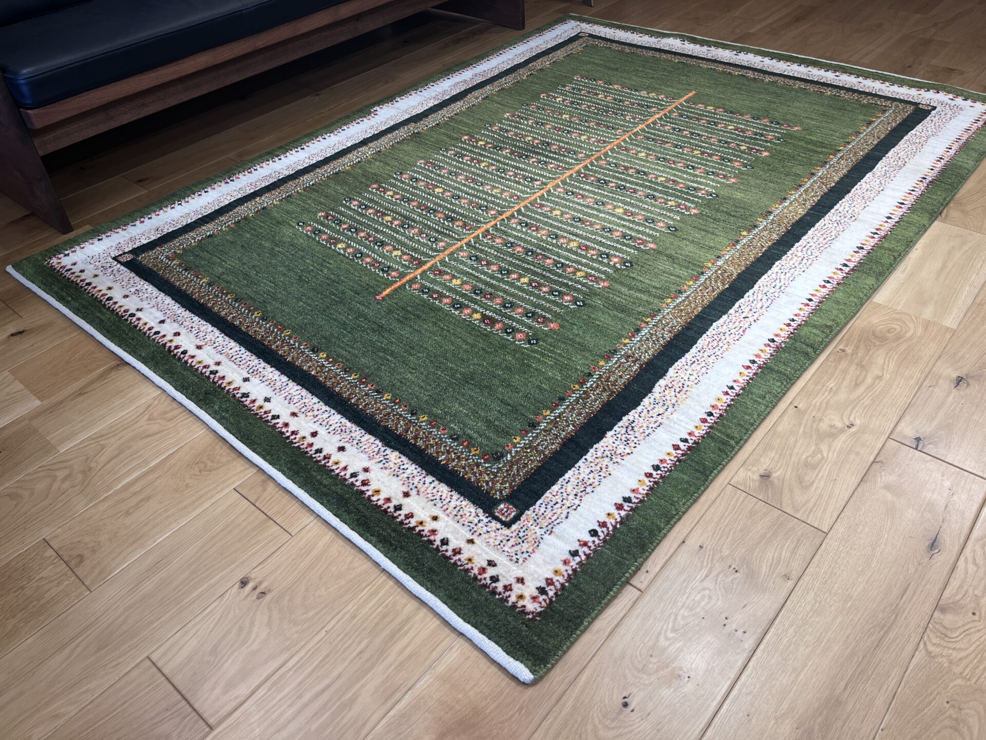 木の枝の先に咲く花々だけでなく、絨毯の端を囲む白いボーダーにも優しく広がるカラフルな花模様です。整然としたデザインの中に咲くこの花々が、お部屋全体をすっきりと上品に、そして華やかに彩ってくれます。