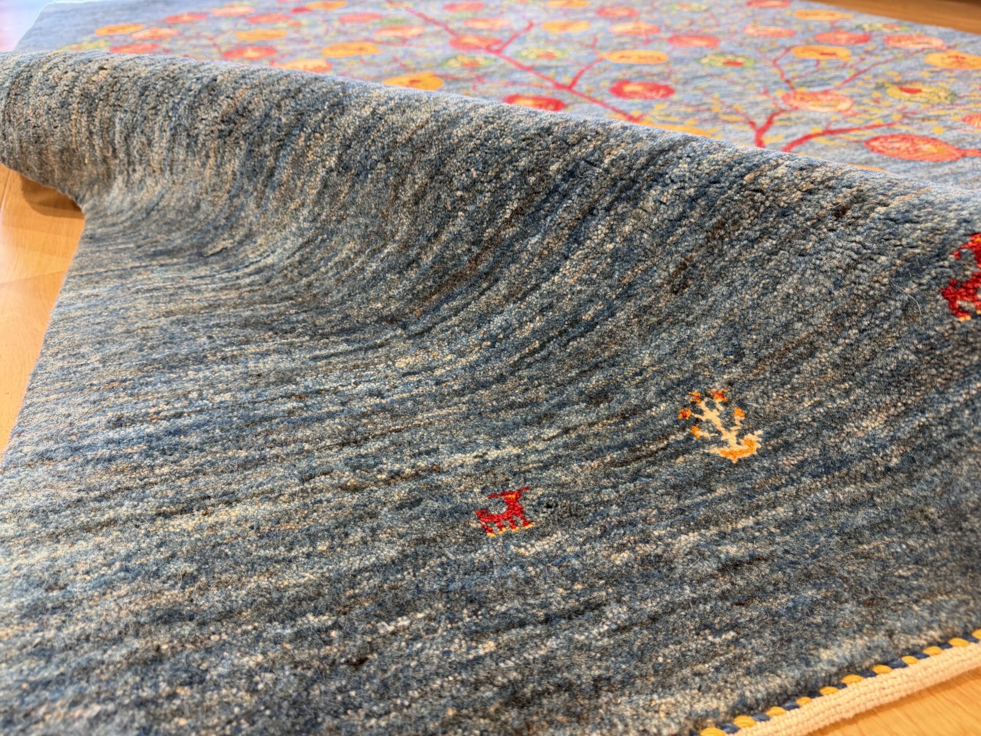 ギャッベはアマレよりも細かな糸を使い、より緻密で滑らかな織りが特徴です。草木染めの色が美しく映え、模様の表現力も豊か。品質と軽やかさのバランスに優れ、使い心地と見た目の両方にこだわりたい方に最適な「カシュクリ ギャッベ」です。
