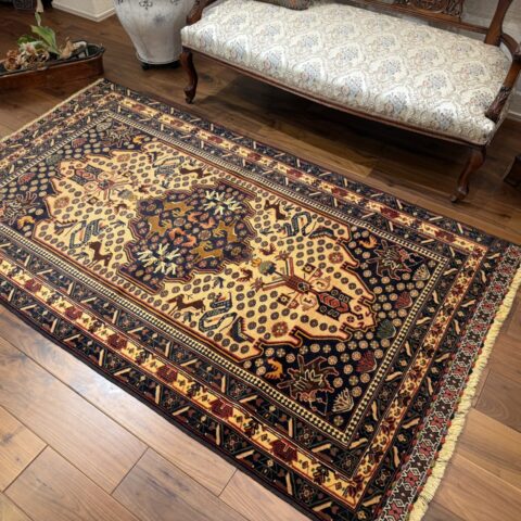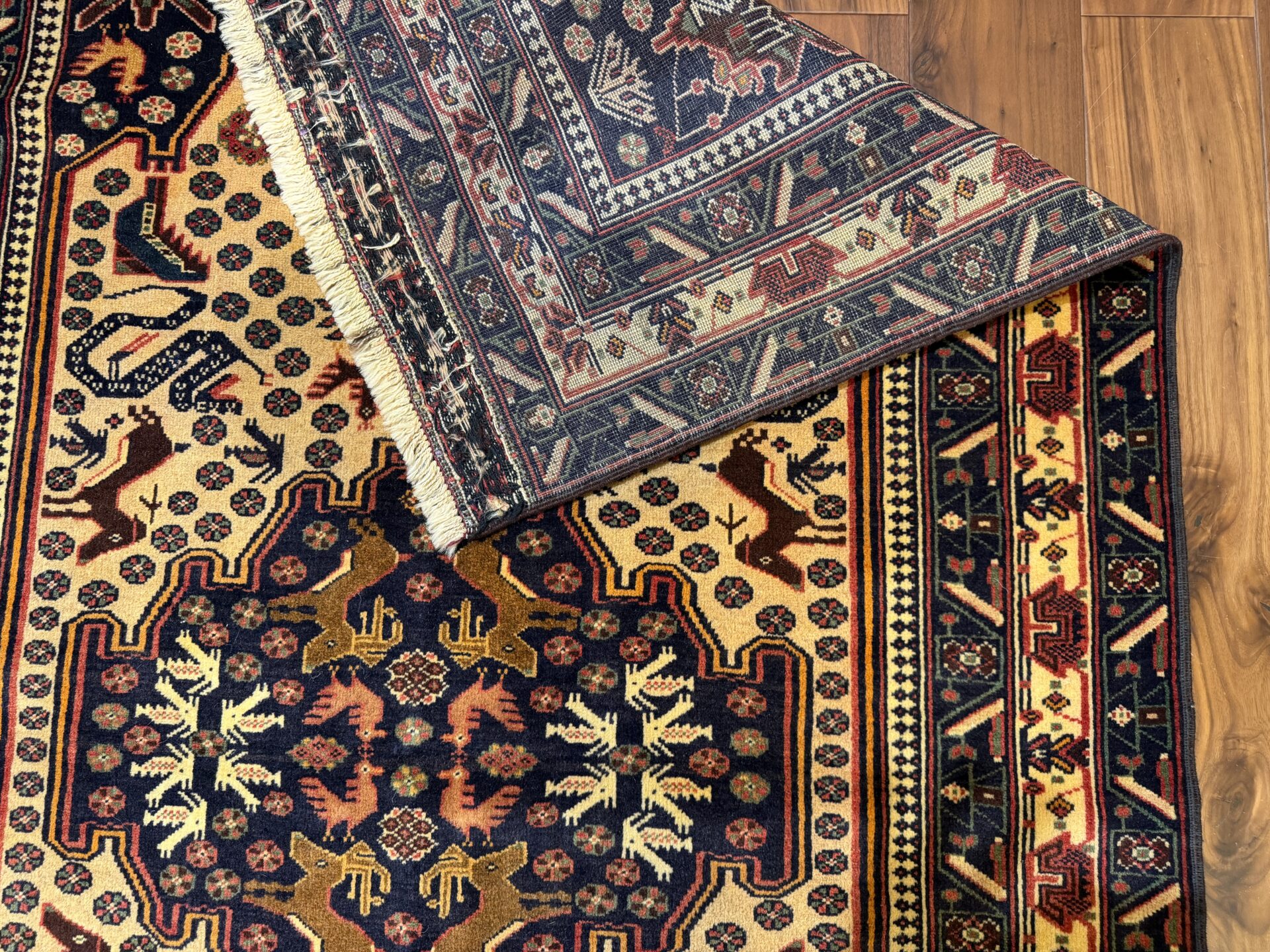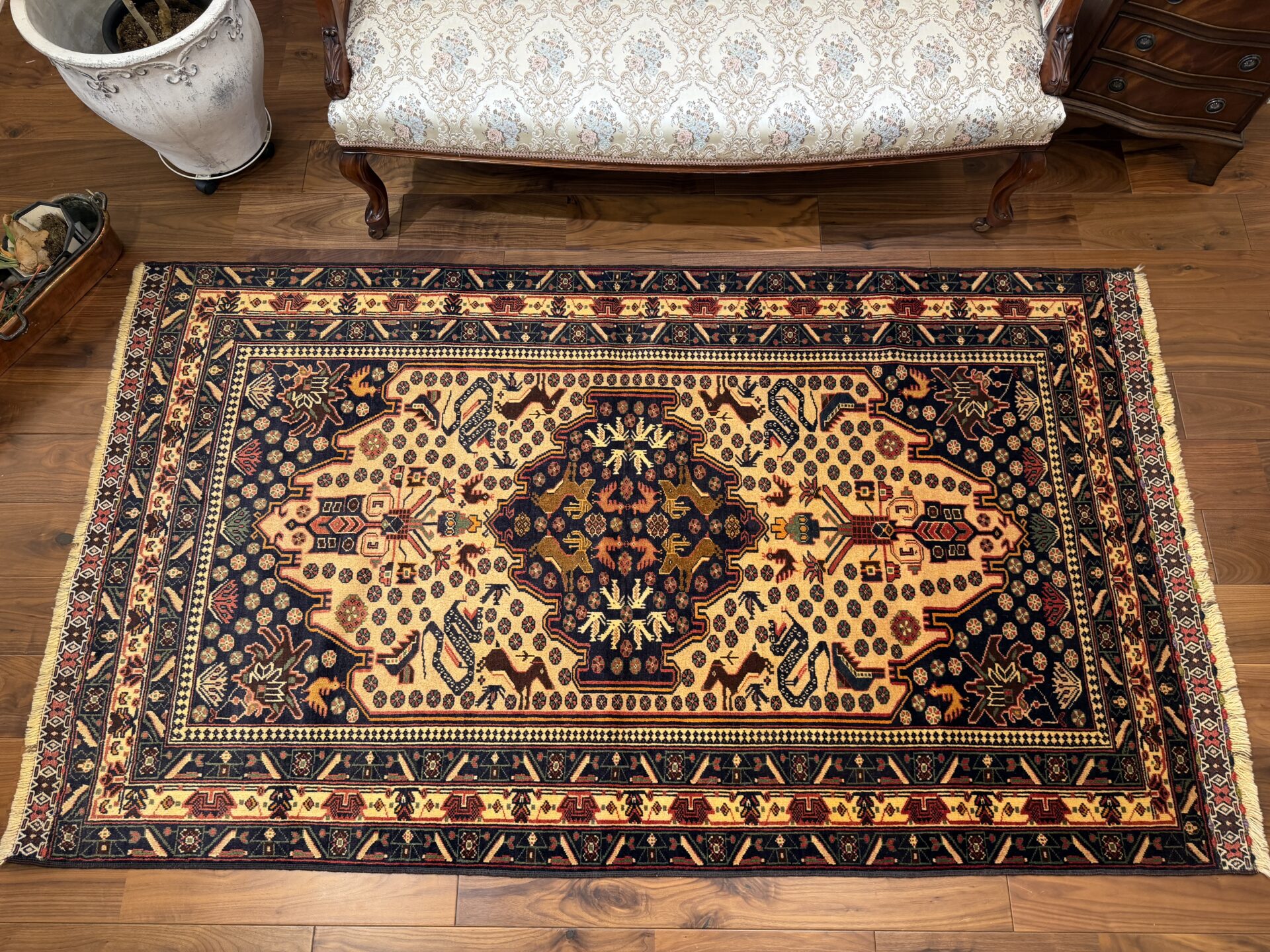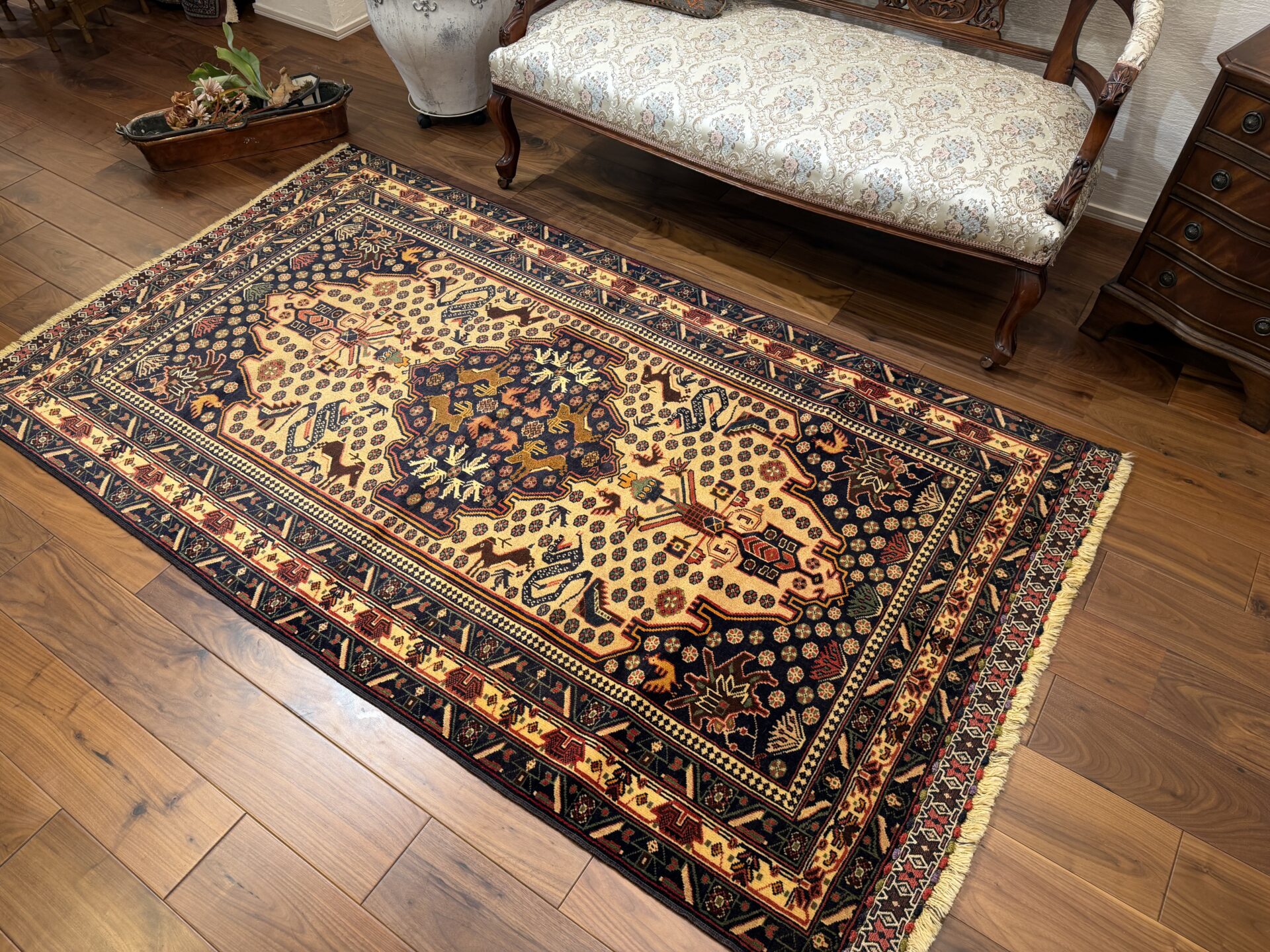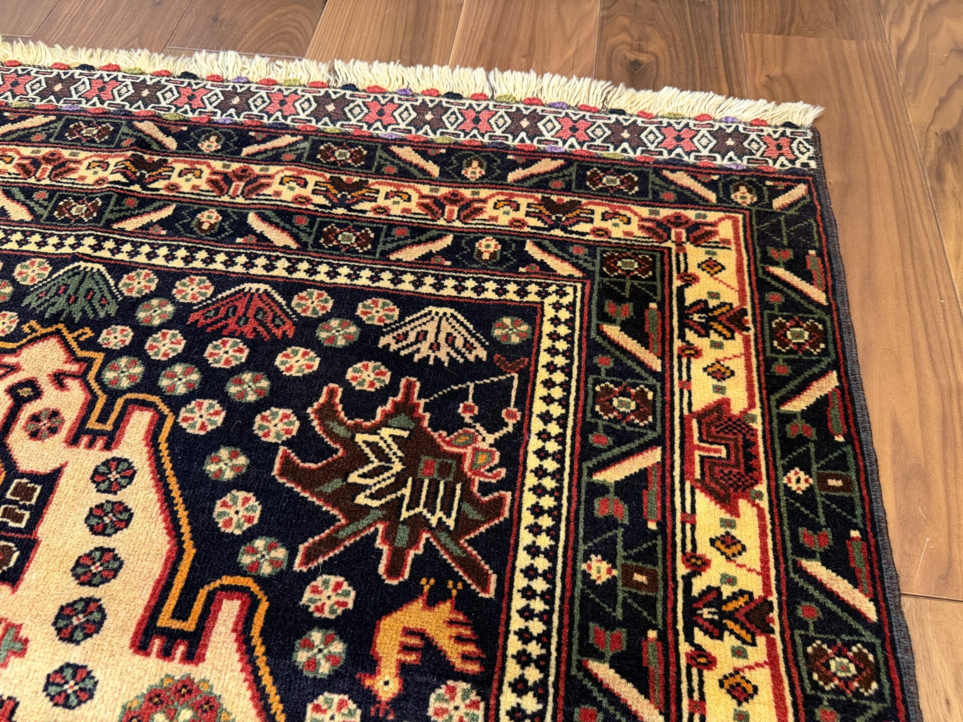 中心のメダリオンや周囲には、ラクダなどの動物や部族の伝統的なモチーフが規則的に配置されています。深いネイビーや赤の縁取りが全体の印象を引き締め、素朴ながらも力強い存在感を感じさせます。手織りならではの不均一な揺らぎが、紋様一つ一つに温かみのある表情を与えています。