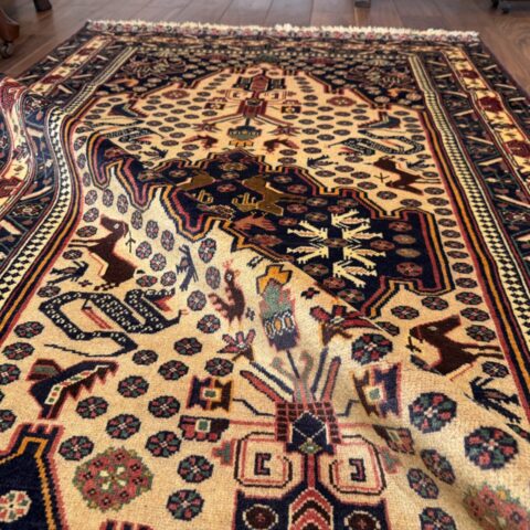 落ち着いたベージュの地色に、バルーチ族らしい独特の動物紋様が描かれた一枚です。