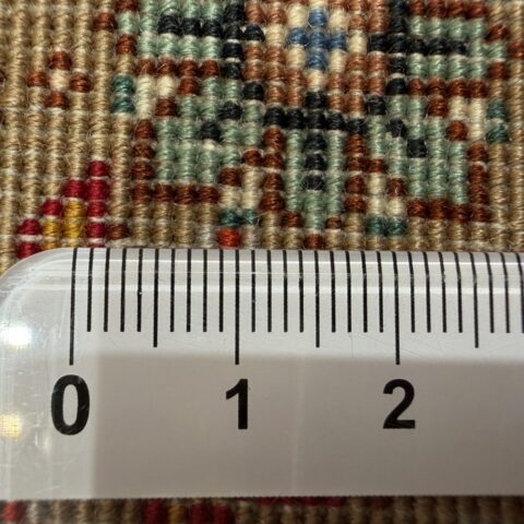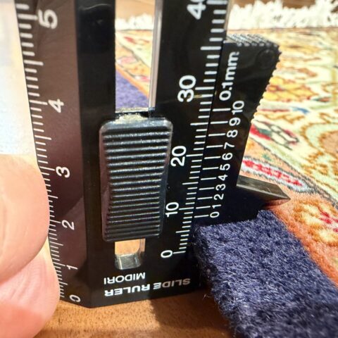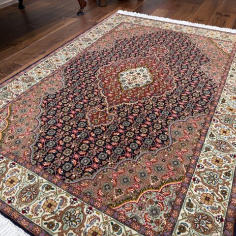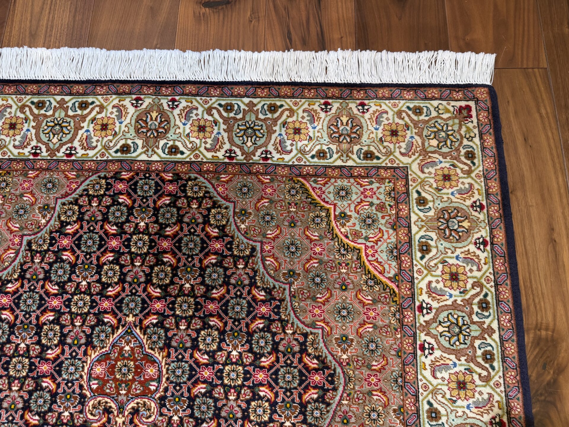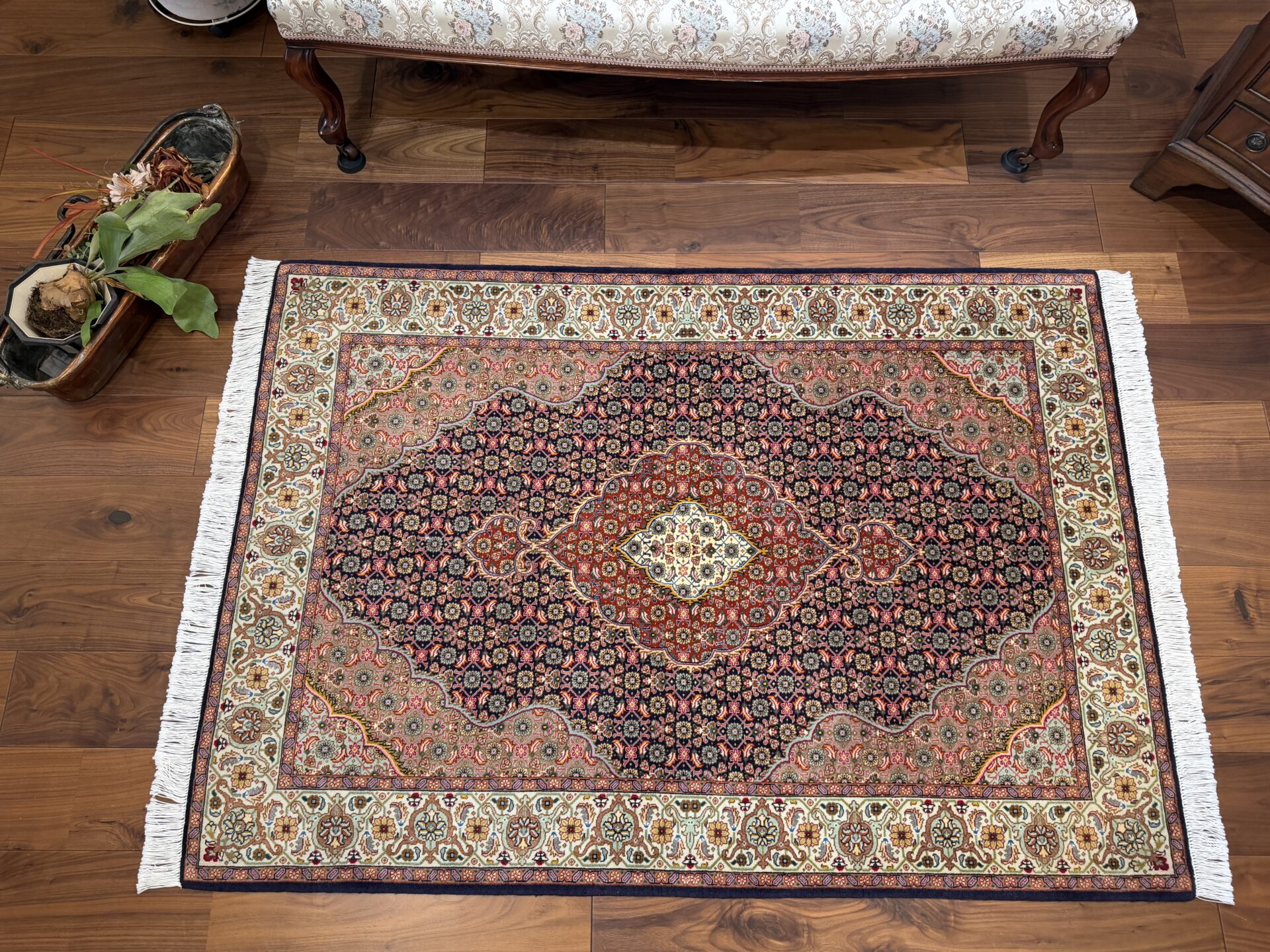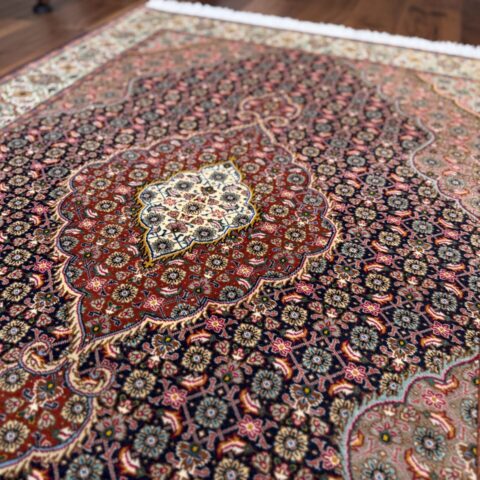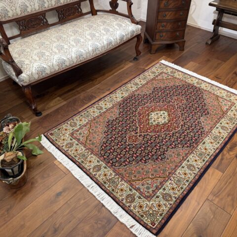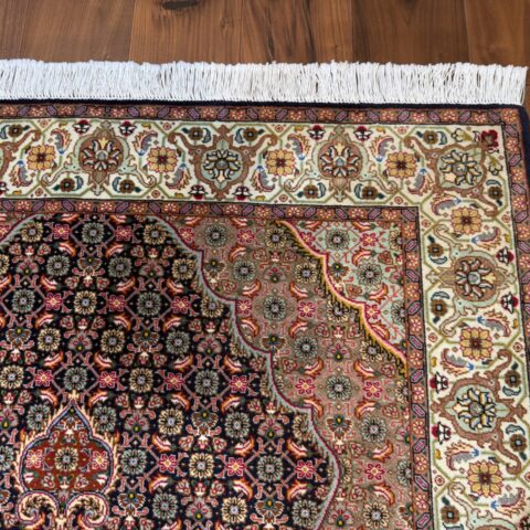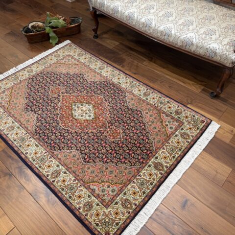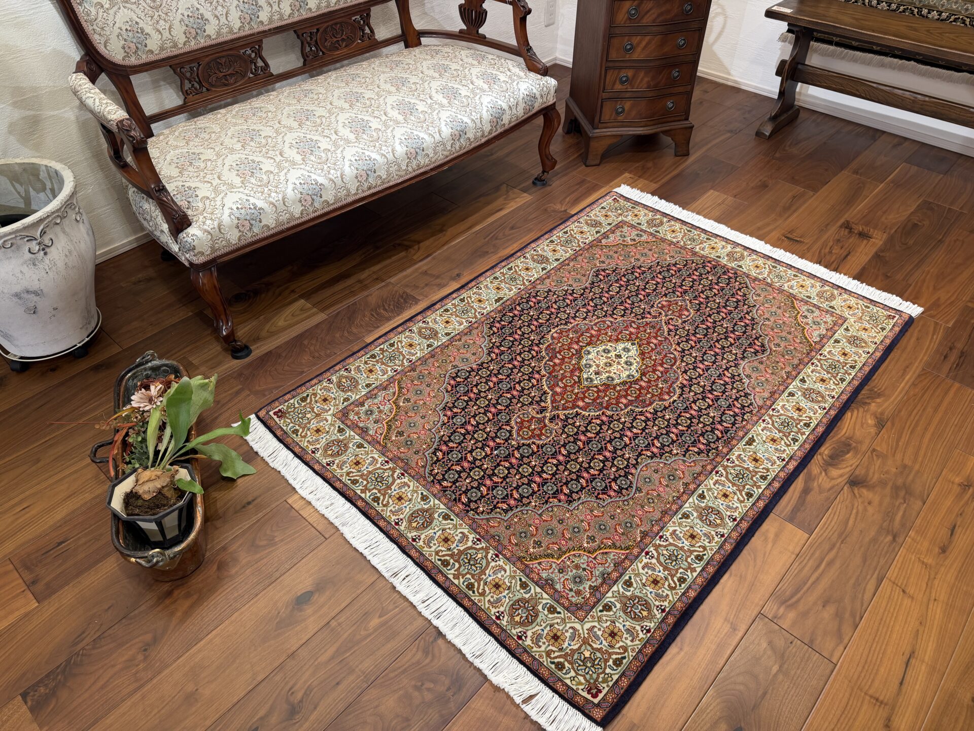 深いネイビーの地色を縁取るように、落ち着いたベージュと細やかな花々の紋様が重なり合い、気品あふれる空間を演出します。中心に配された夕日のような温かみのあるオレンジ色のメダリオンが、全体を柔らかな印象でまとめ上げています。タブリーズ(マララン)特有の非常に細やかで正確な織りにより、曲線の一つ一つのディテールまで美しく表現された逸品です。