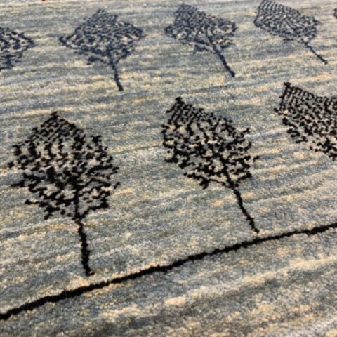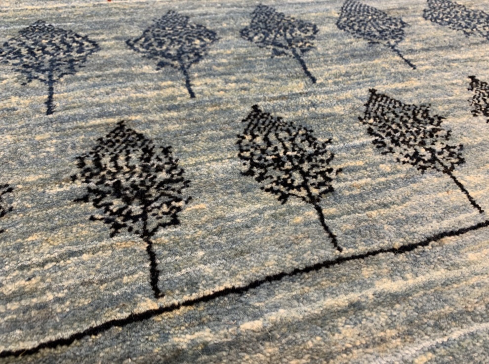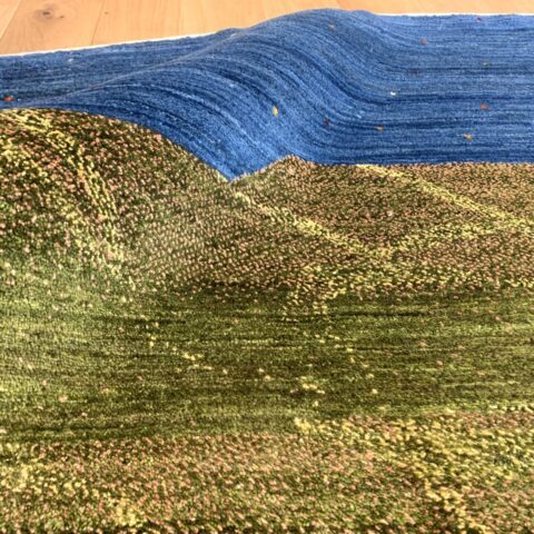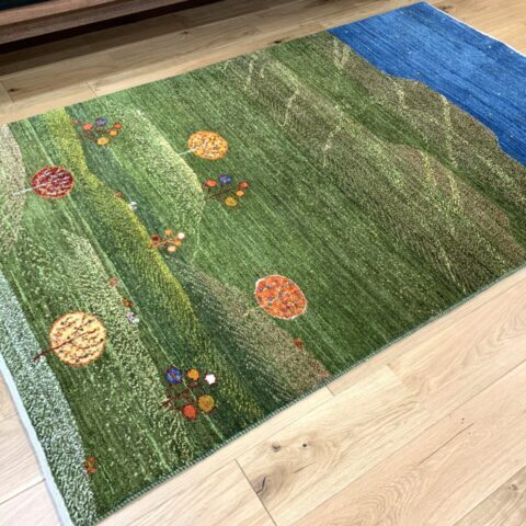 まるでイランの大地を旅しているかのような、風景画のように美しいギャッベ。緑豊かな草原と、澄みわたる青空、遠くにそびえる山並み。そこに点在する木々は、どこかユーモラスで可愛らしく、遊牧民の感性とあたたかさを感じさせてくれます。草木染めによる深みのあるグリーンと、藍で染めた空のブルーが見事に調和し、空間に爽やかな風を運んでくれる一枚。