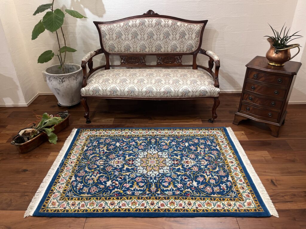 鮮やかなブルーの地色が目を引く、エスファハン産の一枚です。