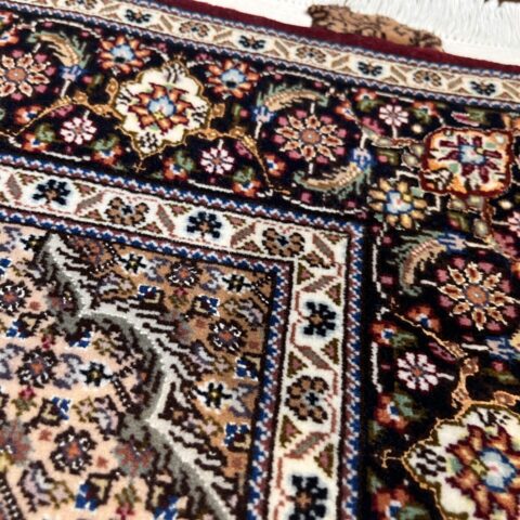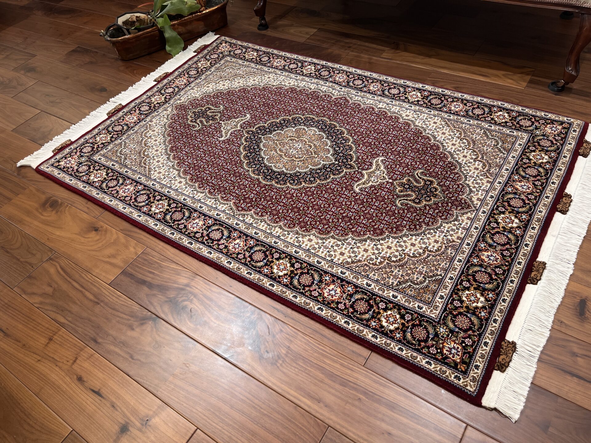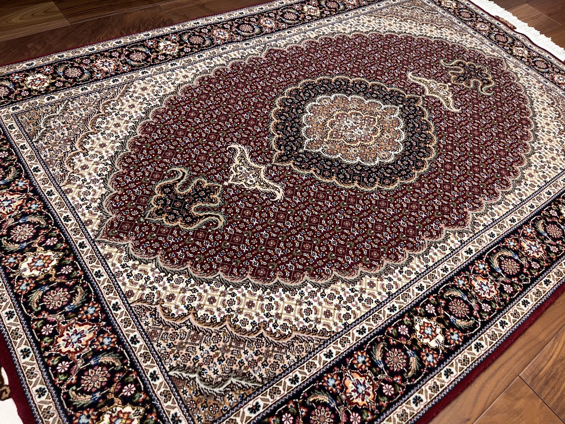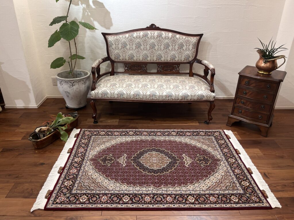 中心のメダリオンから外側へと広がる優雅な曲線美と、落ち着いたベージュや黒の糸で縁取られた繊細な意匠が、空間に知的な重厚感をもたらします。タブリーズ絨毯の代名詞とも言える、非常に堅牢で正確な織り技術により、細かなディテールまで浮き立つように美しく表現されています。クラシックな華やかさの中に、どこか凛とした静寂を感じさせるデザインは、まさに「用の美」を極めた芸術品です。