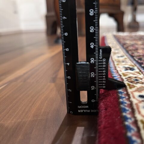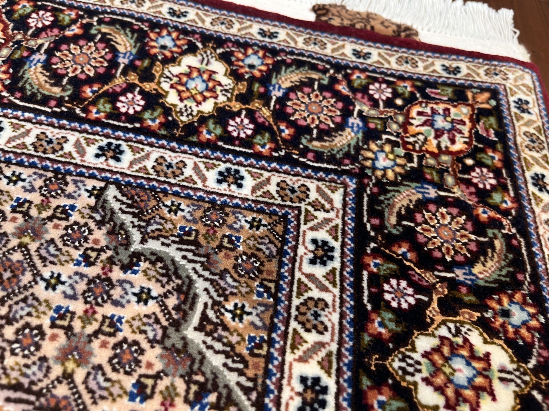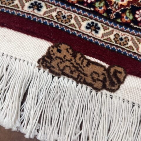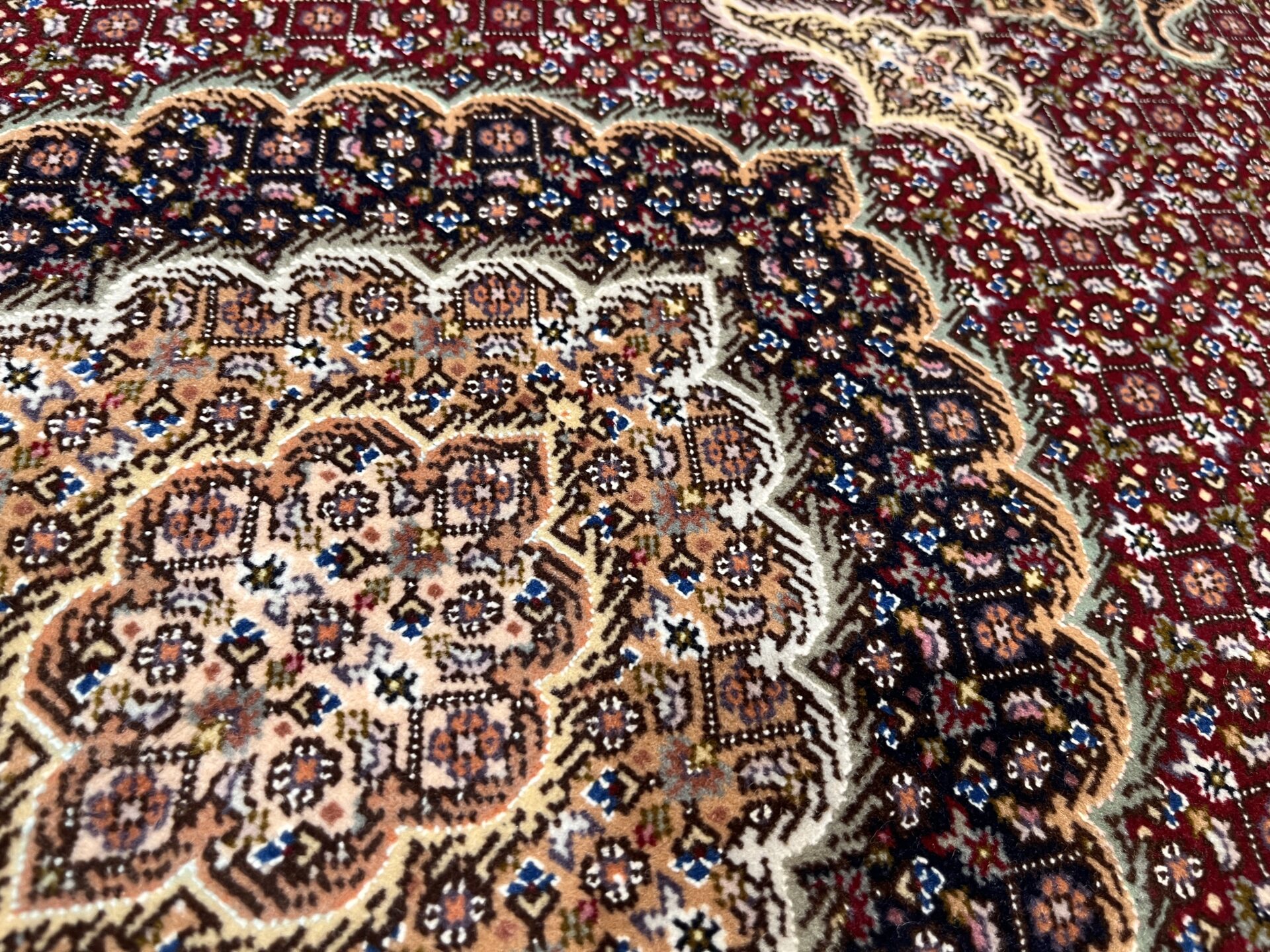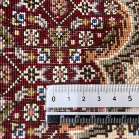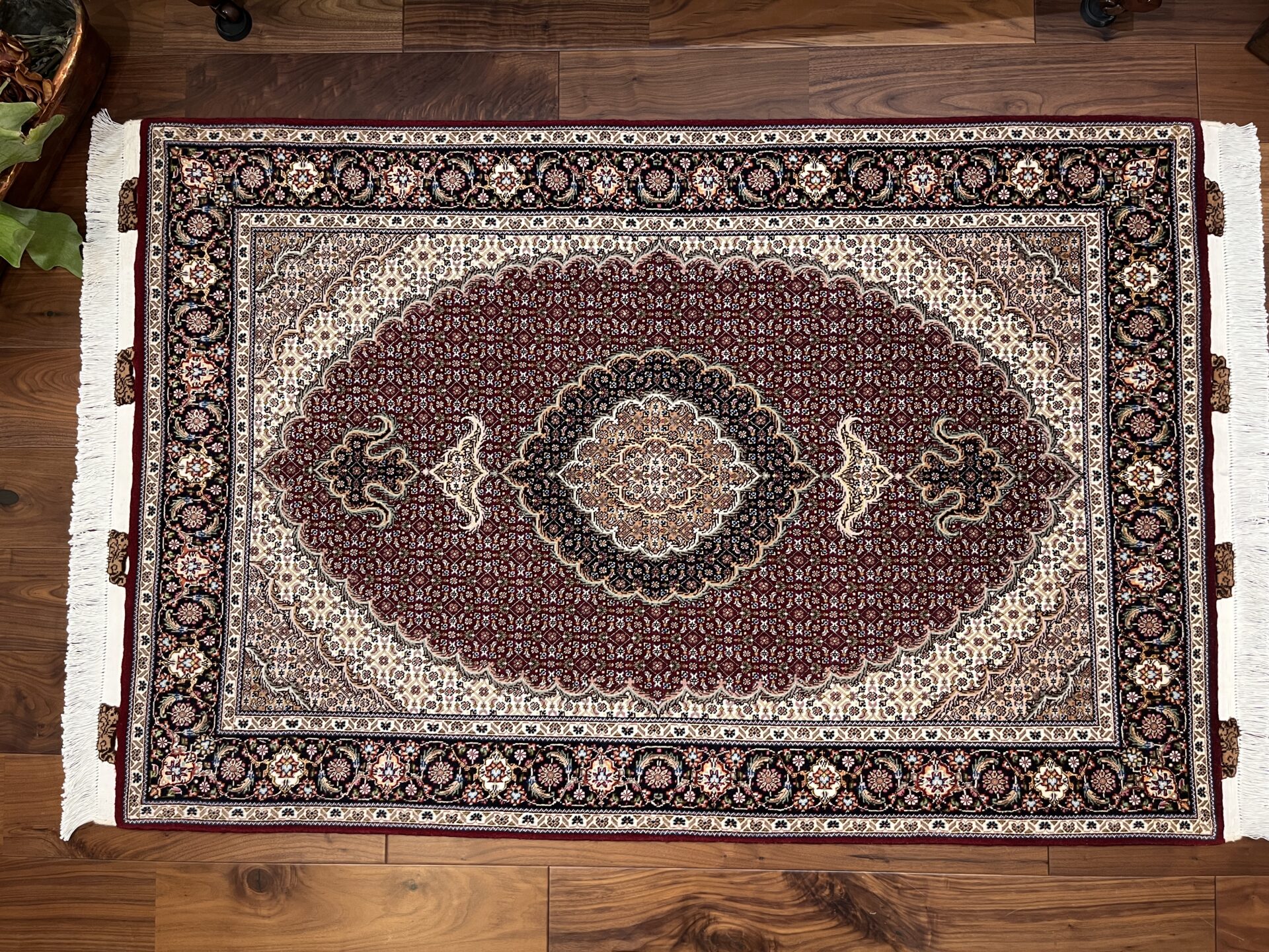 中心のメダリオンから外側へと広がる優雅な曲線美と、落ち着いたベージュや黒の糸で縁取られた繊細な意匠が、空間に知的な重厚感をもたらします。タブリーズ絨毯の代名詞とも言える、非常に堅牢で正確な織り技術により、細かなディテールまで浮き立つように美しく表現されています。クラシックな華やかさの中に、どこか凛とした静寂を感じさせるデザインは、まさに「用の美」を極めた芸術品です。