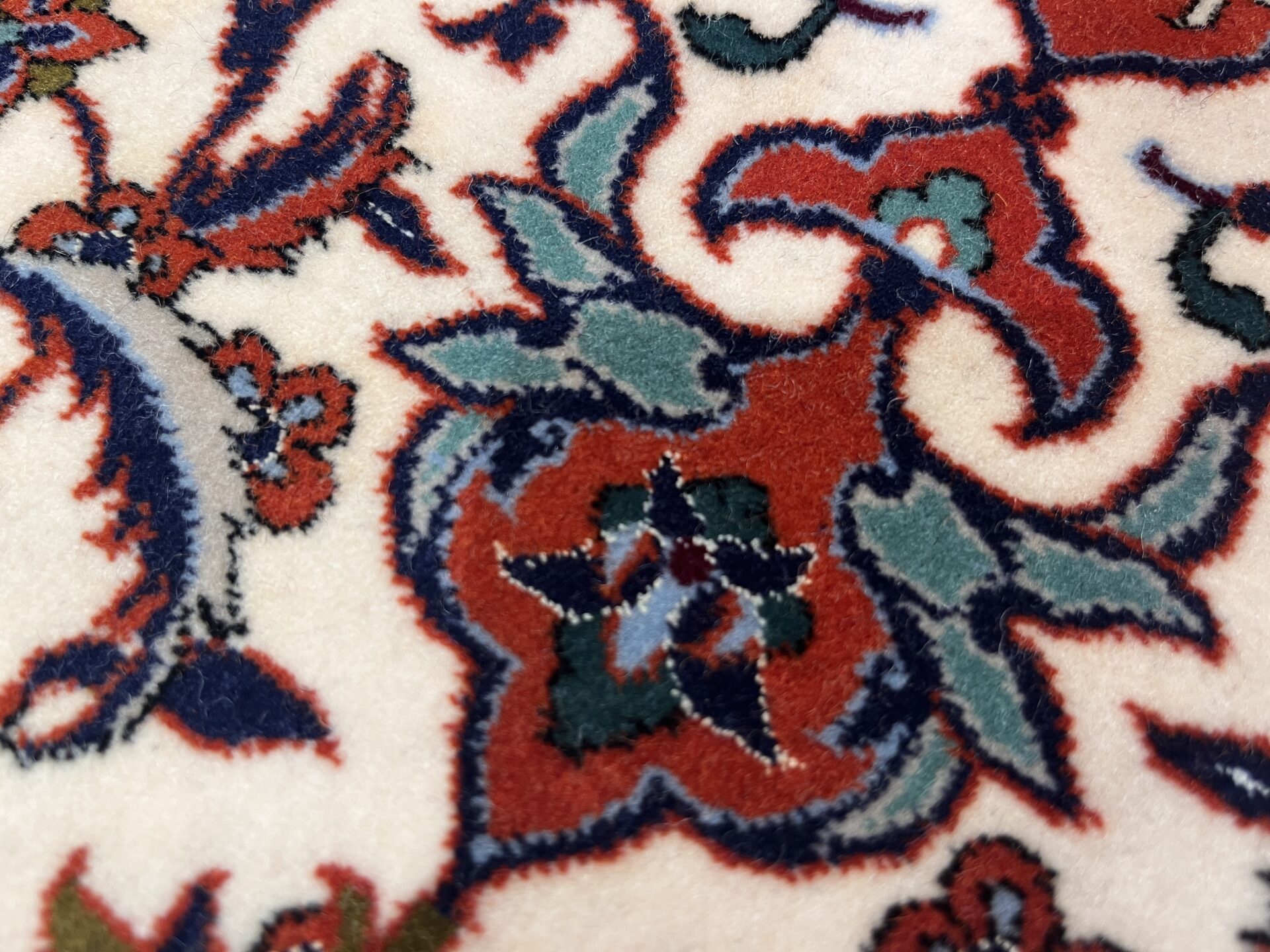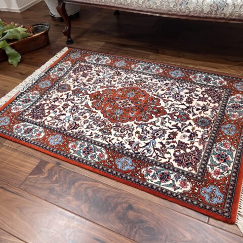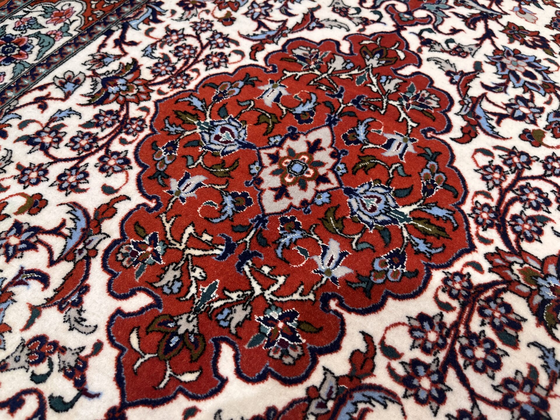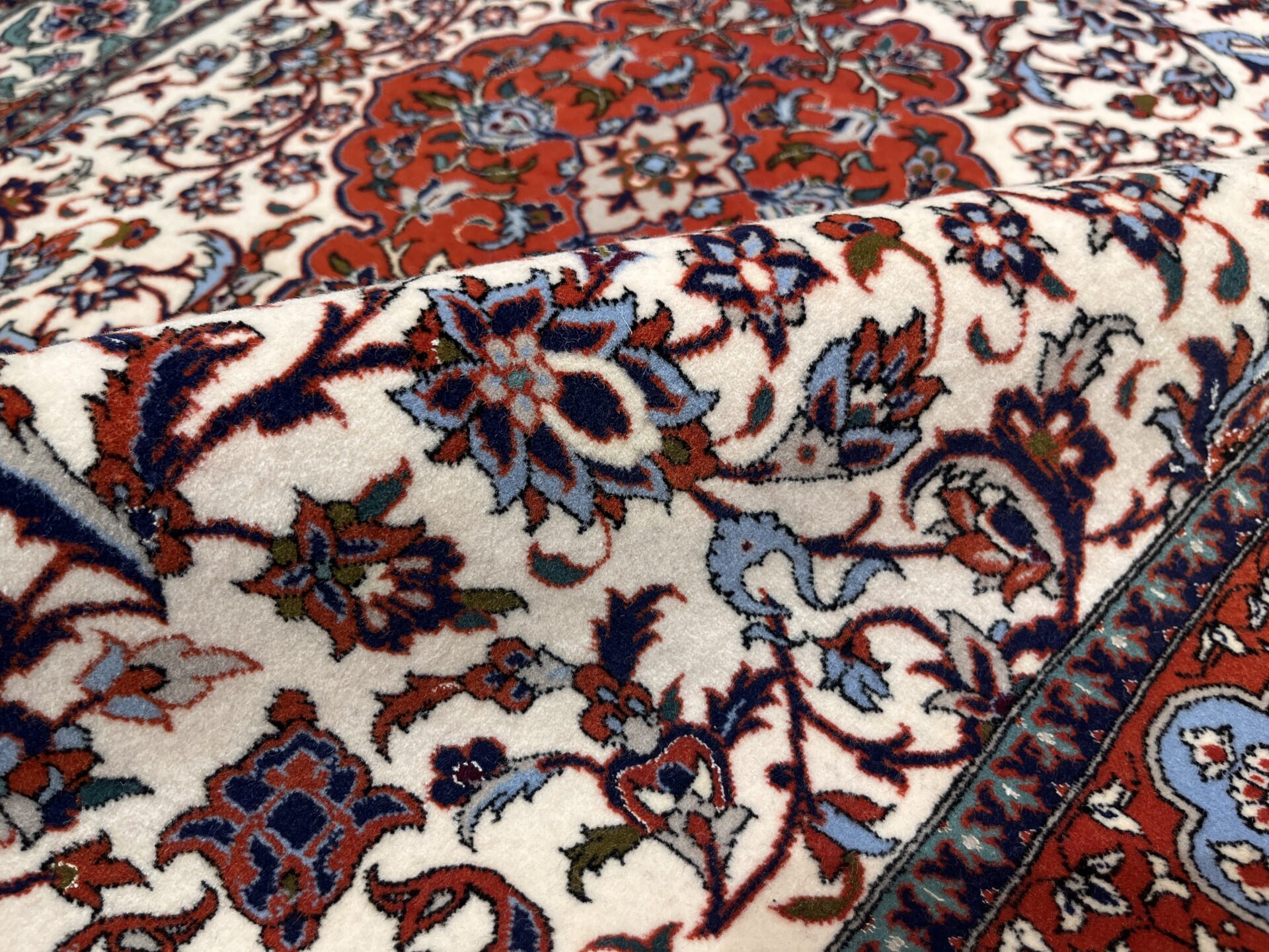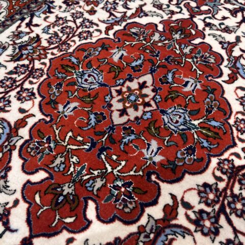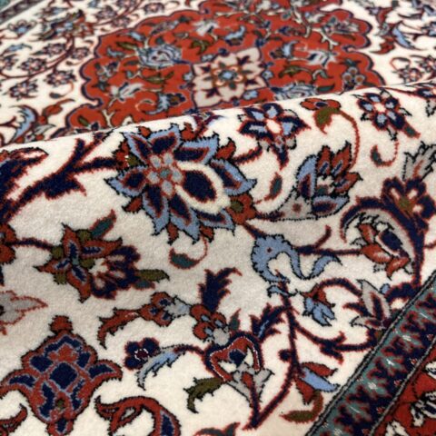 中央のメダリオンからしなやかに伸びるアラベスクの紋様が、白地のフィールドに美しく映え、洗練された空間を演出します。縁取りの鮮やかなオレンジレッドと、随所に配置された水色のコントラストが全体に瑞々しい華やかさを添えています。世界最高峰の産地ならではの非常に細やかな織りにより、花々の一葉一葉までが息を呑むような精密さで描き出されています。