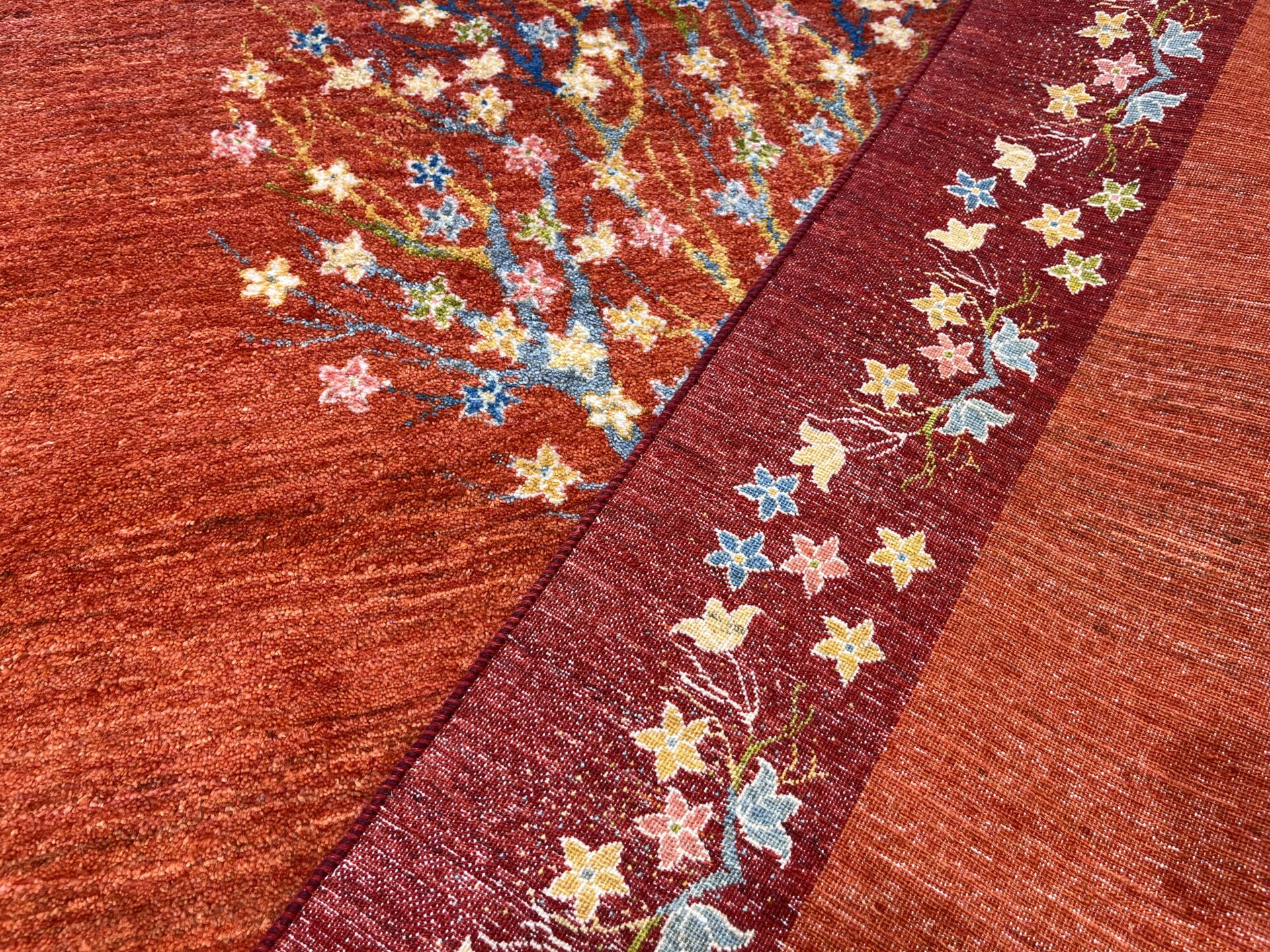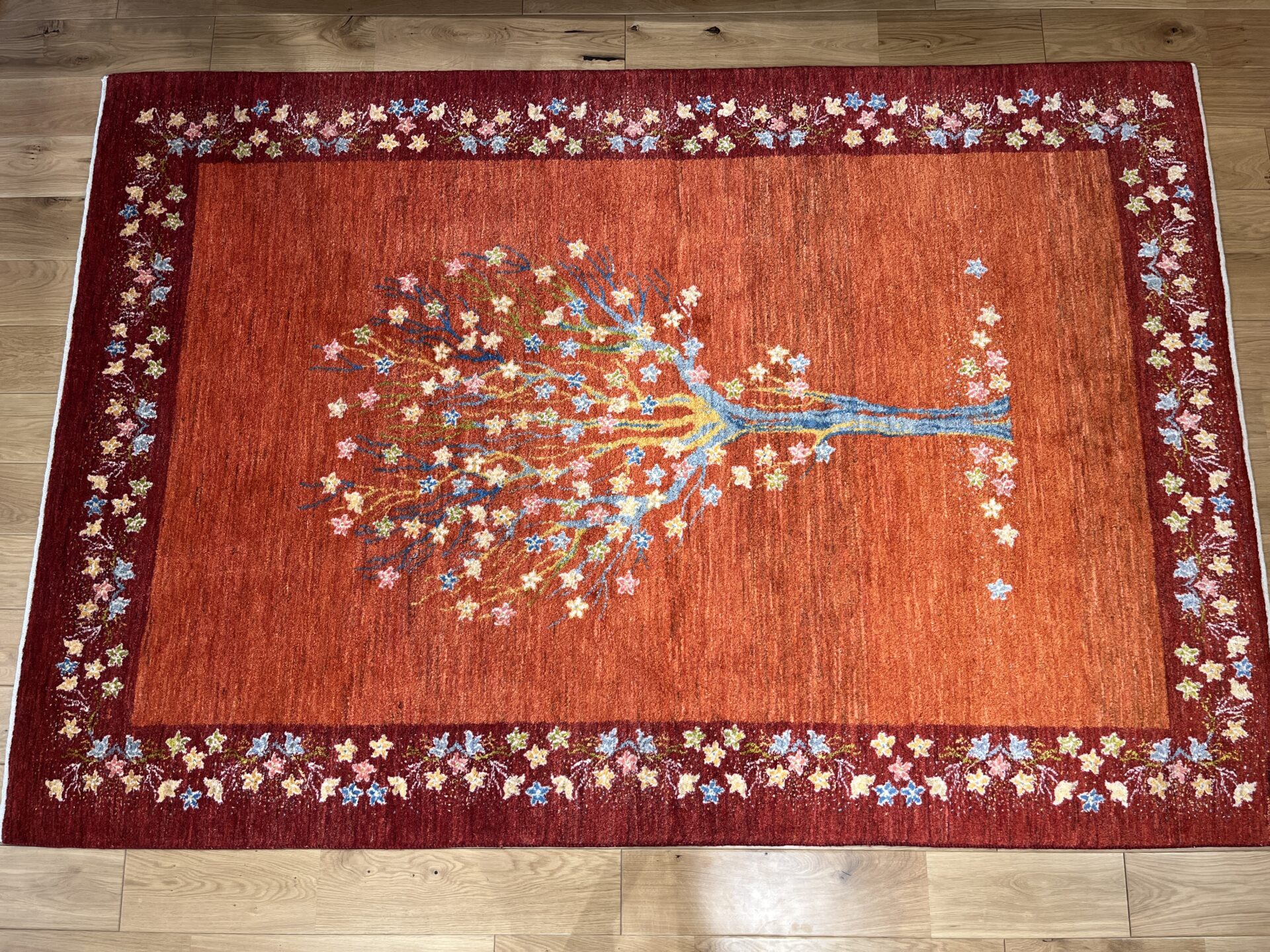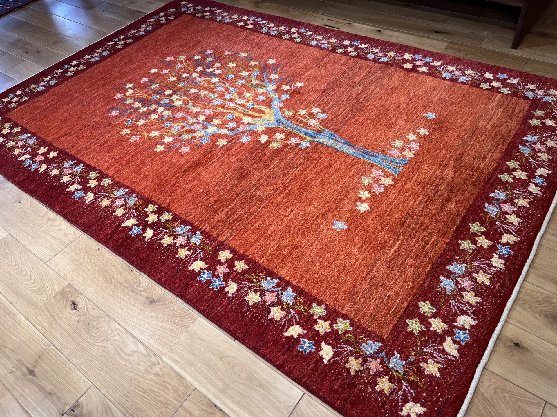 生命の木には【健康・長寿】【家内安全】の意味があり、ギャッベの中でもとても人気のデザインになっています。目が細かく織り密度が高く、触り心地も最高の1枚です。