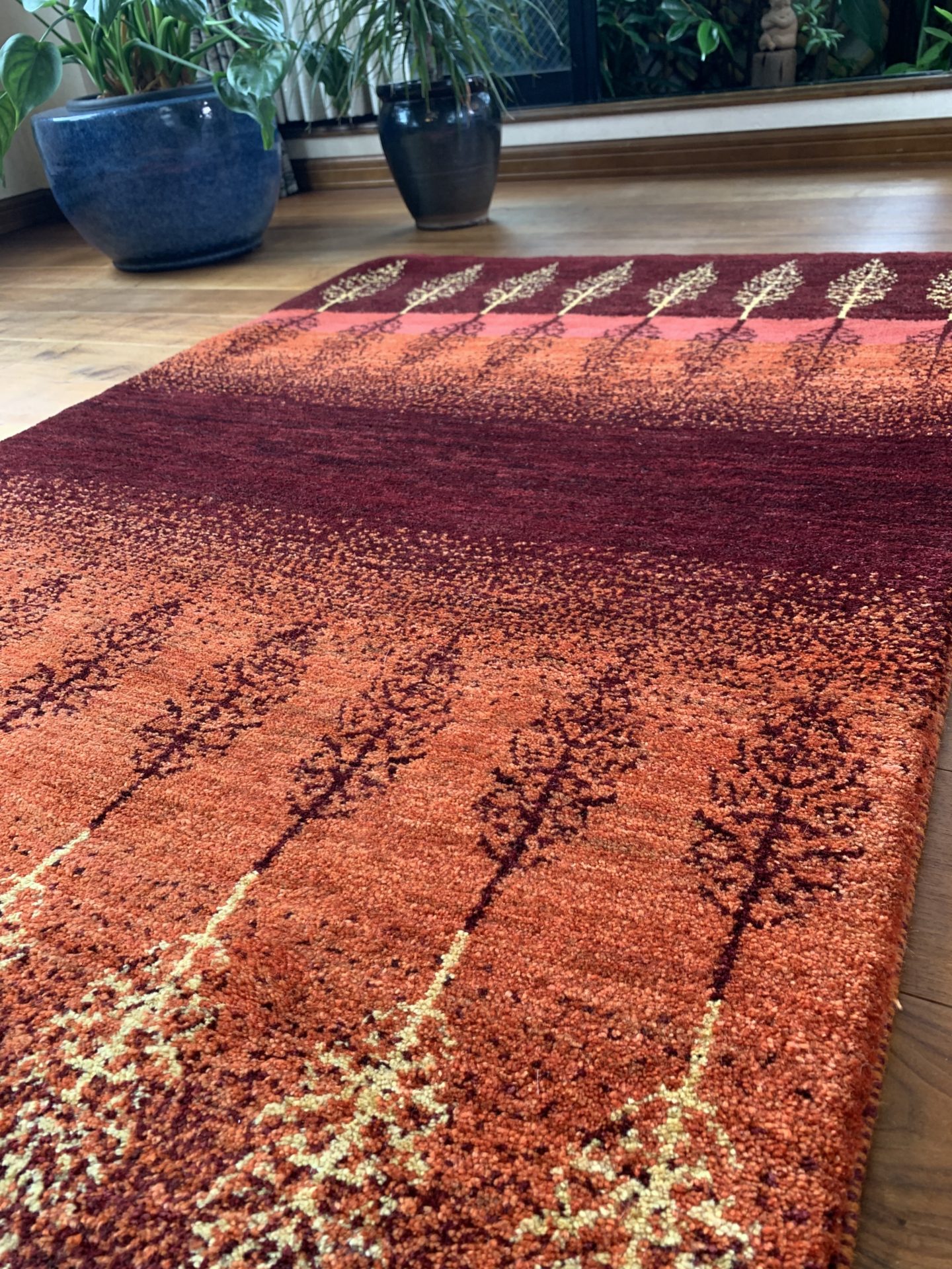何とも言えない深い赤と、明るい赤のグラデーションが私たちの心を惹きつけます。夕焼けに染まった生命の樹がの影が写っているような幻想的な作品です。この深い赤は、丸2日ほど窯でじっくりアカネの染料と羊毛をぐつぐつ煮て染め上げられているんですよ。糸を紡ぎ、丁寧に染めてから、織る、ひとつひとつの作業に作り手の愛が詰まっています。