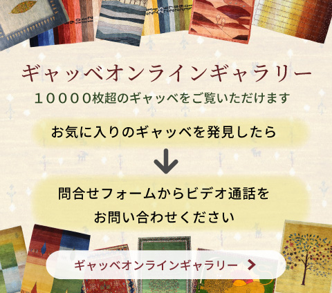 👇オンラインギャラリーで1000枚超のギャッベをご覧いただけます。気になる1枚を見つけたら、お気軽に”ビデオ通話接客”でお問い合わせください。