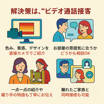ネットでは伝わりづらい「実物感」や「安心感」を、 まるで店舗にいるように体験できます。