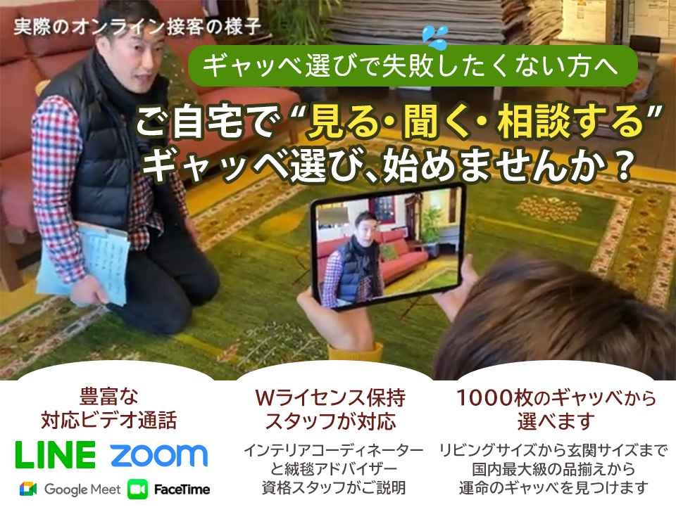 取り扱いギャッベはこちらからご覧いただけます。気になるギャッベはお気軽に”ビデオ通話接客”でお問い合わせください。